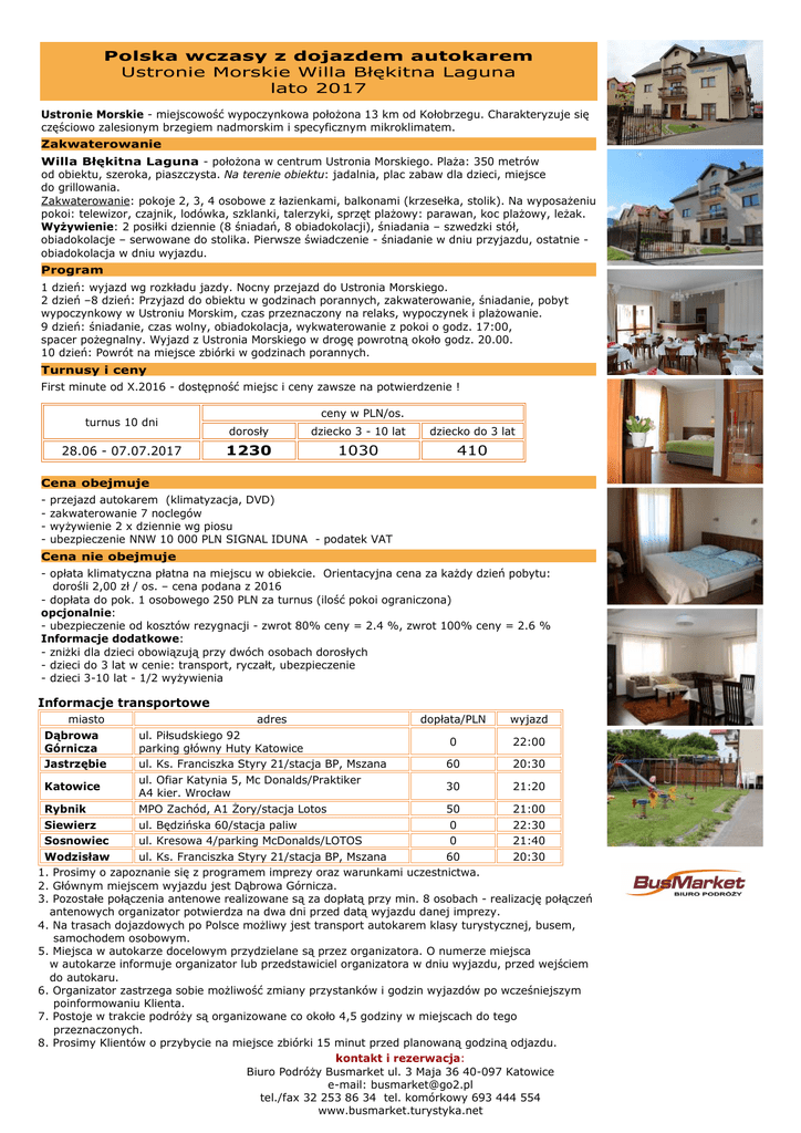 Polska wczasy z dojazdem autokarem Ustronie Morskie Willa Błękitna Laguna lato 2017 Ustronie Morskie - miejscowość wypoczynkowa położona 13 km od Kołobrzegu. Charakteryzuje się częściowo zalesionym brzegiem nadmorskim i specyficznym mikroklimatem. Zakwaterowanie Willa Błękitna Laguna - położona w centrum Ustronia Morskiego. Plaża: 350 metrów od obiektu, szeroka, piaszczysta. Na terenie obiektu: jadalnia, plac zabaw dla dzieci, miejsce do grillowania. Zakwaterowanie: pokoje 2, 3, 4 osobowe z łazienkami, balkonami (krzesełka, stolik). Na wyposażeniu pokoi: telewizor, czajnik, lodówka, szklanki, talerzyki, sprzęt plażowy: parawan, koc plażowy, leżak. Wyżywienie: 2 posiłki dziennie (8 śniadań, 8 obiadokolacji), śniadania – szwedzki stół, obiadokolacje – serwowane do stolika. Pierwsze świadczenie - śniadanie w dniu przyjazdu, ostatnie obiadokolacja w dniu wyjazdu. Program 1 dzień: wyjazd wg rozkładu jazdy. Nocny przejazd do Ustronia Morskiego. 2 dzień –8 dzień: Przyjazd do obiektu w godzinach porannych, zakwaterowanie, śniadanie, pobyt wypoczynkowy w Ustroniu Morskim, czas przeznaczony na relaks, wypoczynek i plażowanie. 9 dzień: śniadanie, czas wolny, obiadokolacja, wykwaterowanie z pokoi o godz. 17:00, spacer pożegnalny. Wyjazd z Ustronia Morskiego w drogę powrotną około godz. 20.00. 10 dzień: Powrót na miejsce zbiórki w godzinach porannych. Turnusy i ceny First minute od X.2016 - dostępność miejsc i ceny zawsze na potwierdzenie ! turnus 10 dni 28.06 - 07.07.2017 ceny w PLN/os. dorosły dziecko 3 - 10 lat dziecko do 3 lat 1230 1030 410 a Cena obejmuje - przejazd autokarem (klimatyzacja, DVD) zakwaterowanie 7 noclegów wyżywienie 2 x dziennie wg piosu ubezpieczenie NNW 10 000 PLN SIGNAL IDUNA - podatek VAT Cena nie obejmuje - opłata klimatyczna płatna na miejscu w obiekcie. Orientacyjna cena za każdy dzień pobytu: dorośli 2,00 zł / os. – cena podana z 2016 - dopłata do pok. 1 osobowego 250 PLN za turnus (ilość pokoi ograniczona) opcjonalnie: - ubezpieczenie od kosztów rezygnacji - zwrot 80% ceny = 2.4 %, zwrot 100% ceny = 2.6 % Informacje dodatkowe: - zniżki dla dzieci obowiązują przy dwóch osobach dorosłych - dzieci do 3 lat w cenie: transport, ryczałt, ubezpieczenie - dzieci 3-10 lat - 1/2 wyżywienia Informacje transportowe miasto Dąbrowa Górnicza Jastrzębie adres dopłata/PLN wyjazd ul. Piłsudskiego 92 0 22:00 parking główny Huty Katowice ul. Ks. Franciszka Styry 21/stacja BP, Mszana 60 20:30 ul. Ofiar Katynia 5, Mc Donalds/Praktiker Katowice 30 21:20 A4 kier. Wrocław Rybnik MPO Zachód, A1 Żory/stacja Lotos 50 21:00 Siewierz ul. Będzińska 60/stacja paliw 0 22:30 Sosnowiec ul. Kresowa 4/parking McDonalds/LOTOS 0 21:40 Wodzisław ul. Ks. Franciszka Styry 21/stacja BP, Mszana 60 20:30 1. Prosimy o zapoznanie się z programem imprezy oraz warunkami uczestnictwa. 2. Głównym miejscem wyjazdu jest Dąbrowa Górnicza. 3. Pozostałe połączenia antenowe realizowane są za dopłatą przy min. 8 osobach - realizację połączeń antenowych organizator potwierdza na dwa dni przed datą wyjazdu danej imprezy. 4. Na trasach dojazdowych po Polsce możliwy jest transport autokarem klasy turystycznej, busem, samochodem osobowym. 5. Miejsca w autokarze docelowym przydzielane są przez organizatora. O numerze miejsca w autokarze informuje organizator lub przedstawiciel organizatora w dniu wyjazdu, przed wejściem do autokaru. 6. Organizator zastrzega sobie możliwość zmiany przystanków i godzin wyjazdów po wcześniejszym poinformowaniu Klienta. 7. Postoje w trakcie podróży są organizowane co około 4,5 godziny w miejscach do tego przeznaczonych. 8. Prosimy Klientów o przybycie na miejsce zbiórki 15 minut przed planowaną godziną odjazdu. kontakt i rezerwacja: Biuro Podróży Busmarket ul. 3 Maja 36 40-097 Katowice e-mail: [email protected] tel./fax 32 253 86 34 tel. komórkowy 693 444 554 www.busmarket.turystyka.net
