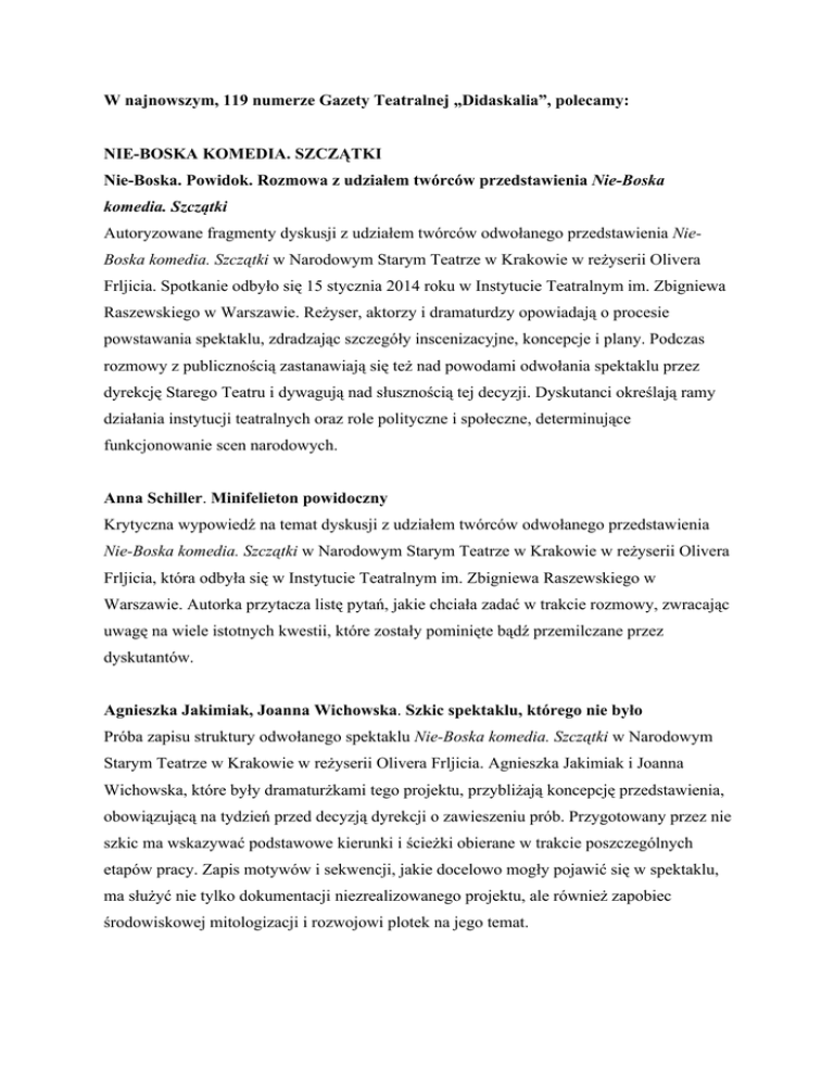 W najnowszym, 119 numerze Gazety Teatralnej „Didaskalia”, polecamy: NIE-BOSKA KOMEDIA. SZCZĄTKI Nie-Boska. Powidok. Rozmowa z udziałem twórców przedstawienia Nie-Boska komedia. Szczątki Autoryzowane fragmenty dyskusji z udziałem twórców odwołanego przedstawienia NieBoska komedia. Szczątki w Narodowym Starym Teatrze w Krakowie w reżyserii Olivera Frljicia. Spotkanie odbyło się 15 stycznia 2014 roku w Instytucie Teatralnym im. Zbigniewa Raszewskiego w Warszawie. Reżyser, aktorzy i dramaturdzy opowiadają o procesie powstawania spektaklu, zdradzając szczegóły inscenizacyjne, koncepcje i plany. Podczas rozmowy z publicznością zastanawiają się też nad powodami odwołania spektaklu przez dyrekcję Starego Teatru i dywagują nad słusznością tej decyzji. Dyskutanci określają ramy działania instytucji teatralnych oraz role polityczne i społeczne, determinujące funkcjonowanie scen narodowych. Anna Schiller. Minifelieton powidoczny Krytyczna wypowiedź na temat dyskusji z udziałem twórców odwołanego przedstawienia Nie-Boska komedia. Szczątki w Narodowym Starym Teatrze w Krakowie w reżyserii Olivera Frljicia, która odbyła się w Instytucie Teatralnym im. Zbigniewa Raszewskiego w Warszawie. Autorka przytacza listę pytań, jakie chciała zadać w trakcie rozmowy, zwracając uwagę na wiele istotnych kwestii, które zostały pominięte bądź przemilczane przez dyskutantów. Agnieszka Jakimiak, Joanna Wichowska. Szkic spektaklu, którego nie było Próba zapisu struktury odwołanego spektaklu Nie-Boska komedia. Szczątki w Narodowym Starym Teatrze w Krakowie w reżyserii Olivera Frljicia. Agnieszka Jakimiak i Joanna Wichowska, które były dramaturżkami tego projektu, przybliżają koncepcję przedstawienia, obowiązującą na tydzień przed decyzją dyrekcji o zawieszeniu prób. Przygotowany przez nie szkic ma wskazywać podstawowe kierunki i ścieżki obierane w trakcie poszczególnych etapów pracy. Zapis motywów i sekwencji, jakie docelowo mogły pojawić się w spektaklu, ma służyć nie tylko dokumentacji niezrealizowanego projektu, ale również zapobiec środowiskowej mitologizacji i rozwojowi plotek na jego temat. Anna-Maria Karczmarska. Koncepcja scenograficzna Opis koncepcji zagospodarowania Sceny Kameralnej Narodowego Starego Teatru w odwołanym spektaklu Nie-Boska komedia. Szczątki w reżyserii Olivera Frljicia. Głównym założeniem projektu było nawiązanie do scenografii Krystyny Zachwatowicz, stworzonej do spektaklu Konrada Swinarskiego z 1965 roku, i podjęcie dialogu z tamtą estetyką. Podobnie jak w inscenizacji sprzed 49 lat centralnym punktem akcji miał być kościelny ołtarz. Agnieszka Jakimiak. Ta dziwna instytucja zwana spektaklem Próba spojrzenia na decyzję dyrekcji Narodowego Starego Teatru o zawieszeniu prób do przedstawienia Nie-Boska komedia. Szczątki w reżyserii Olivera Frljicia z perspektywy filozoficznej. Autorka snuje refleksje na temat instytucjonalności teatru, a także proponuje określenie spektaklu jako „mikroinstytucji”, przy czym jako spektakl należy rozumieć nie tylko finalny efekt pracy zespołu ludzi, ale szersze pole napięć, relacji władzy, zasad wprowadzanych w ramach pracy, ustalania stosunków i zależności między uczestnikami produkcji. Przybliża też zaangażowaną politycznie twórczość Frljicia oraz stosowane przez niego metody pracy i konwencje, jakimi reżyser posługuje się w swojej sztuce. DEMOKRACJE Grzegorz Stępniak. „Twerk, twerk, Miley, only in America”. Gry z rasą w amerykańskim „kolorowym” teatrze Autor rozpoczyna tekst przywołaniem kontrowersji związanych ze śmiertelnym postrzeleniem czarnoskórego nastolatka Trayvona Martina w lutym 2012 roku. Winy oskarżonego nie rozpatrywano wtedy w kontekście rasistowskim, ponieważ mimo białego koloru skóry miał pochodzenie latynoskie. W dalszej części artykułu analizuje zarówno zjawiska medialne (np. występ Miley Cyrus na ceremonii MTV Video Music Awards), jak i teatralne (performans I‘ma Be Me Wandy Sykes oraz Lear Young Jean Lee), w których dochodzi do ujawnienia i – niekiedy – do reinterpretacji powszechnie obowiązujących stereotypów na temat rasy i płci. Natalia Jakubowa. Gogol-Centrum: pierwszy sezon Raport z pierwszego sezonu Centrum Gogola w Moskwie po rewolucji dokonanej przez jego nowego kierownika artystycznego Kiriłła Sieriebriennikowa. Autorka skupia się na cyklu trzech premier Bracia, Idioci oraz Strach. Spektakle, oparte na scenariuszach filmów Luigi Viscontiego, Larsa von Triera i Rainera Fassbindera o tematyce społecznej, komentowały współczesną sytuację w Rosji. Autorka artykułu analizuje każdy z tych spektakli, zastanawiając się, na ile nowa koncepcja Gogol-Centrum mogłaby odegrać ważną rolę w kształtowaniu politycznego wymiaru rosyjskiej dramaturgii. Zofia Smolarska. Ślepe uliczki teatru dokumentalnego. Situation Rooms jako performans organizacyjny Autorka ujawnia zakulisowe szczegóły tworzenia projektu Situation Rooms (Ruhrtriennale 2013, Jahrhunderthalle Bochum, prem.: 23.08.2013), w którym widzowie, przechodząc przez kolejne pomieszczenia, przy użyciu iPadów wchodzą w role kolejnych postaci. Smolarska porównuje ten projekt z poprzednimi inicjatywami Rimini Protokoll, obnażając słabości spektaklu i wyliczając błędne decyzje twórców w trakcie jego realizacji. Zwraca uwagę m.in. na znaczne modyfikacje wyglądu realnych przestrzeni w procesie ich odwzorowywania w Situation Rooms, służące zachowaniu spójności wizji artystycznej. Wyraża wątpliwość, czy stosowanie kategorii „dokumentalności” w odniesieniu do najnowszego dzieła Rimini jest uprawnione. Rafał Kołsut. Zabawa w ciebie W recenzji najnowszego projektu Situation Rooms Rimini Protokoll (Ruhrtriennale 2013, Jahrhunderthalle Bochum, prem.: 23.08.2013) autor szczegółowo opisuje pokonywaną przez widza trasę po tytułowych Situation Rooms. Równocześnie podkreśla, wy