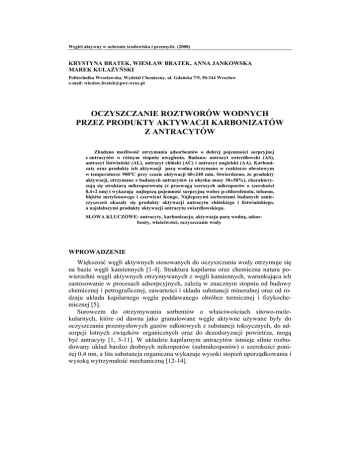 Węgiel aktywny w ochronie środowiska i przemyśle (2008) KRYSTYNA BRATEK, WIESŁAW BRATEK, ANNA JANKOWSKA MAREK KUŁAŻYŃSKI Politechnika Wrocławska, Wydział Chemiczny, ul. Gdańska 7/9, 50-344 Wrocław e-mail: [email protected] OCZYSZCZANIE ROZTWORÓW WODNYCH PRZEZ PRODUKTY AKTYWACJI KARBONIZATÓW Z ANTRACYTÓW Zbadano możliwość otrzymania adsorbentów o dobrej pojemności sorpcyjnej z antracytów o różnym stopniu uwęglenia. Badano: antracyt swierdłowski (AS), antracyt listwiański (AL), antracyt chiński (AC) i antracyt angielski (AA). Karbonizaty oraz produkty ich aktywacji parą wodną otrzymano w reaktorze obrotowym w temperaturze 900°C przy czasie aktywacji 60240 min. Stwierdzono, że produkty aktywacji, otrzymane z badanych antracytów (o ubytku masy 3050%), charakteryzują się strukturą mikroporowatą (z przewagą szerszych mikroporów o szerokości 0,42 nm) i wykazują najlepszą pojemność sorpcyjną wobec p-chlorofenolu, toluenu, błękitu metylenowego i czerwieni Kongo. Najlepszymi sorbentami badanych zanieczyszczeń okazały się produkty aktywacji antracytu chińskiego i listwiańskiego, a najsłabszymi produkty aktywacji antracytu swierdłowskiego. SŁOWA KLUCZOWE: antracyty, karbonizacja, aktywacja parą wodną, adsorbenty, właściwości, oczyszczanie wody WPROWADZENIE Większość węgli aktywnych stosowanych do oczyszczania wody otrzymuje się na bazie węgli kamiennych [1-4]. Struktura kapilarna oraz chemiczna natura powierzchni węgli aktywnych otrzymywanych z węgli kamiennych, warunkująca ich zastosowanie w procesach adsorpcyjnych, zależą w znacznym stopniu od budowy chemicznej i petrograficznej, zawartości i składu substancji mineralnej oraz od rodzaju układu kapilarnego węgla poddawanego obróbce termicznej i fizykochemicznej [5]. Surowcem do otrzymywania sorbentów o właściwościach sitowo-molekularnych, które od dawna jako granulowane węgle aktywne używane były do oczyszczania przemysłowych gazów odlotowych z substancji toksycznych, do adsorpcji lotnych związków organicznych oraz do dezodoryzacji powietrza, mogą być antracyty [1, 5-11]. W układzie kapilarnym antracytów istnieje silnie rozbudowany układ bardzo drobnych mikroporów (submikroporów) o szerokości poniżej 0,4 nm, a lita substancja organiczna wykazuje wysoki stopień uporządkowania i wysoką wytrzymałość mechaniczną [12-14]. 140 K. Bratek, W. Bratek, A. Jankowska, M. Kułażyński W procesie karbonizacji antracytów wydziela się mało części lotnych, co powoduje jedynie znaczny wzrost objętości submikroporów z maksimum w temperaturze 600°C oraz nieznaczny wzrost objętości makroporów. Mezopory i szersze mikropory (o szerokościach 0,42 nm) w karbonizatach z antracytów praktycznie nie występują [5]. W procesie aktywacji karbonizatów z antracytów objętość szerszych mikroporów rośnie (w produkcie aktywacji o ubytku masy ok. 30% nie występują już submikropory [5-6]), a zmiany w objętości mezo- i makroporów są niewielkie. Mimo iż sorbenty z antracytów mają dobrze rozwiniętą strukturę szerszych mikroporów, co wskazuje na ich przydatność w usuwaniu zanieczyszczeń z roztworów wodnych, brak jest prac mówiących o ich zastosowaniu do tych procesów. Celem naszej pracy było określenie możliwości otrzymania sorbentów węglowych z dostępnych na rynku antracytów do oczyszczania wodnych roztworów toluenu, p-chlorofenolu, błękitu metylenowego i czerwieni Kongo. 1. METODYKA BADAŃ Surowcem do badań były próbki antracytów o różnym stopniu uwęglenia, rozdrobnione do 12 mm. Badano: antracyt swierdłowski (AS), antracyt listwiański (AL), antracyt chiński (AC) i antracyt angielski (AA). Proces karbonizacji i aktywacji antracytów prowadzono w jednym cyklu pomiarowym w poziomym rurowym reaktorze obrotowym umieszczonym w piecu elektrycznym. Wstępnie (etap karbonizacji) próbkę o masie 30 g ogrzewano w atmosferze azotu, z szybkością ogrzewania 10C/min do temperatury końcowej 900C. Czas wygrzewania próbki w temperaturze końcowej wynosił 15 min. Następnie wprowadzano czynnik zgazowujący - parę wodną (wydajność przegrzewacza pary wodnej 20%) - i prowadzono aktywację w warunkach izotermicznych w temperaturze 900C. Czas aktywacji zmieniał się w granicach 60240 min. W procesie aktywacja poprzedzona była bezpośrednio etapem karbonizacji. Rejestrowany ubytek masy był wynikiem procesu odgazowania antracytu i reakcji zgazowania parą wodną karbonizatu. Dla właściwej oceny przebiegu aktywacji wyniki przeliczono na karbonizat odgazowany. Badania obejmowały: analizę techniczną, oznaczenie liczby adsorpcji jodu i liczby metylenowej, badania struktury kapilarnej metodą sorpcji ditlenku węgla i benzenu oraz metodą porozymetryczną, a także próby oczyszczania roztworów wodnych przez karbonizaty i produkty aktywacji karbonizatów otrzymanych z antracytów. Oznaczenia wykonano zgodnie z aktualnie obowiązującymi normami. Badania struktury kapilarnej prowadzono w wysokopróżniowej aparaturze grawimetrycznej z wagami kwarcowymi typu Mc Baina-Bakra w stałej temperaturze 25°C. Objętości mezoporów (Vmez) oraz frakcji mikroporów o szerokości 0,42 nm (Vmik), dostępnych w procesie sorpcji dla cząsteczek benzenu, a także najdrobniejszej części mikroporów o szerokości poniżej 0,4 nm - submikroporów (Vsub-mik), niedostępnych w procesie sorpcji dla cząsteczek benzenu, dostępnych jedynie dla Oczyszczanie roztworów wodnych przez produkty aktywacji karbonizatów z antracytów 141 ditlenku węgla - obliczono na podstawie izoterm adsorpcji i desorpcji benzenu oraz adsorpcji ditlenku węgla. Badania porozymetryczne przeprowadzono metodą porozymetrii rtęciowej przy użyciu aparatu PASCAL 440 firmy CE Instruments, w zakresie ciśnień od atmosferycznego do 300 MPa, co pozwala na pomiar objętości i rozmiarów porów w zakresie 16000÷5,0 nm. Skuteczność oczyszczania ścieków przez sorbenty badano, dodaj