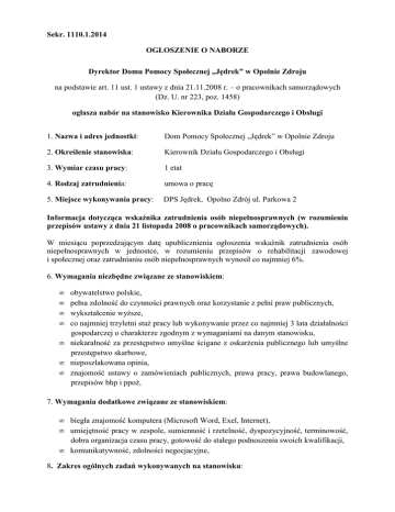 Sekr. 1110.1.2014 OGŁOSZENIE O NABORZE Dyrektor Domu Pomocy Społecznej „Jędrek” w Opolnie Zdroju na podstawie art. 11 ust. 1 ustawy z dnia 21.11.2008 r. – o pracownikach samorządowych (Dz. U. nr 223, poz. 1458) ogłasza nabór na stanowisko Kierownika Działu Gospodarczego i Obsługi 1. Nazwa i adres jednostki: Dom Pomocy Społecznej „Jędrek” w Opolnie Zdroju 2. Określenie stanowiska: Kierownik Działu Gospodarczego i Obsługi 3. Wymiar czasu pracy: 1 etat 4. Rodzaj zatrudnienia: umowa o pracę 5. Miejsce wykonywania pracy: DPS Jędrek, Opolno Zdrój ul. Parkowa 2 Informacja dotycząca wskaźnika zatrudnienia osób niepełnosprawnych (w rozumieniu przepisów ustawy z dnia 21 listopada 2008 o pracownikach samorządowych). W miesiącu poprzedzającym datę upublicznienia ogłoszenia wskaźnik zatrudnienia osób niepełnosprawnych w jednostce, w rozumieniu przepisów o rehabilitacji zawodowej i społecznej oraz zatrudnianiu osób niepełnosprawnych wynosił co najmniej 6%. 6. Wymagania niezbędne związane ze stanowiskiem: • • • • obywatelstwo polskie, pełna zdolność do czynności prawnych oraz korzystanie z pełni praw publicznych, wykształcenie wyŜsze, co najmniej trzyletni staŜ pracy lub wykonywanie przez co najmniej 3 lata działalności gospodarczej o charakterze zgodnym z wymaganiami na danym stanowisku, • niekaralność za przestępstwo umyślne ścigane z oskarŜenia publicznego lub umyślne przestępstwo skarbowe, • nieposzlakowana opinia, • znajomość ustawy o zamówieniach publicznych, prawa pracy, prawa budowlanego, przepisów bhp i ppoŜ, 7. Wymagania dodatkowe związane ze stanowiskiem: • biegła znajomość komputera (Microsoft Word, Exel, Internet), • umiejętność pracy w zespole, sumienność i rzetelność, dyspozycyjność, terminowość, dobra organizacja czasu pracy, gotowość do stałego podnoszenia swoich kwalifikacji, • komunikatywność, zdolności negocjacyjne, 8. Zakres ogólnych zadań wykonywanych na stanowisku: • zapewnienie sprawności techniczno – eksploatacyjnej budynków, urządzeń, dbanie o sprzęt przeciwpoŜarowy, przeglądy sprzętu i budynków, • planowanie, organizowanie oraz nadzorowanie prac remontowych budynków DPS zgodnie z obowiązującymi przepisami, • Współpraca z głównym księgowym w przygotowywaniu i opracowywaniu rocznych planów wydatków budŜetowych w zakresie usług świadczonych przez dział, • nadzorowanie wykonania i monitorowanie waŜności umów, badań technicznych, ubezpieczenia środków transportowych oraz monitorowanie procesów poboru wody, oleju opałowego i energii elektrycznej, • planowanie i zabezpieczenie środków transportowych niezbędnych do wykonania zadań DPS, • rozliczanie kart drogowych i prowadzenie ewidencji kart drogowych, • prowadzenie spraw z zakresu wynajmowania i administrowania zakładowymi lokalami mieszkalnymi, • przygotowywanie i prowadzenie czynności związanych z zamówieniami publicznymi, • organizowanie i nadzorowanie pracy podległych pracowników, • przestrzeganie i nadzór nad zaopatrzeniem pracowników w odzieŜ ochronną, • prowadzenie ksiąŜek obiektu DPS, • zawieranie umów z kontrahentami Domu zgodnie z przepisami, • przygotowywanie sprawozdań, analiz i bieŜących informacji o realizacji powierzonych zadań oraz naliczanie opłat za korzystanie ze środowiska. 9. Warunki pracy: Praca administracyjno – biurowa z wykorzystaniem komputera oraz urządzeń biurowych (fax, kserokopiarka), kontakt z klientem zewnętrznym. 10. Wymagane dokumenty: • • • • • • • • curriculum vitae, list motywacyjny, kopia dokumentu potwierdzającego obywatelstwo, kserokopie dokumentów potwierdzajacych wykształcenie i kwalifikacje wymagane do zajmowanego stanowiska kierownika dzialu gospodarczego i obsługi, kserokopie dokumentów potwierdzajacych staŜ pracy, oświadczenie, o braku przeciwskazań zdrowotnych do wykonywania pracy na stanowisku kierowniczym, oświadczenie o niekaralności za umyślne przestepstwo ścigane z oskarŜenia publicznego lub umyślne przestępstwo skarbowe, oświadczenie o posiadaniu pelnej zdolnosci do czynności prawnych i korzystaniu z pełni praw publicznych. Wymagane dokumenty aplikacyjne (CV, list motywacyjny) powinny być opatrzone klauzulą „WyraŜam zgodę na przetwarzanie moich danych osobowych zawartych w ofercie pracy dla potrzeb niezbędnych do realizacji procesu rekrutacji zgodnie z ustawą z dnia 29.08.1997 r. o ochronie danych osobowych (Dz. U. z 2002 r. Nr 101 poz. 926 z późn. zm.) oraz z ustawą z dnia 21 listopada 2008 r. o pracownikach samozradowych (Dz. U. Nr 223 poz. 1458)”. 10. Forma i termin składania ofert: Wymagane dokumenty naleŜy składać w sekretariacie Domu Pomocy Społecznej „Jędrek” w Opolnie Zdroju lub przesłać pocztą na adres: Dom Pomocy Społecznej „Jędrek” w Opolnie Zdroju, Opolno Zdrój ul. Parkowa 2, 59-920 Bogatynia w zamkniętej kopercie z dopiskiem „Nabór na stanowisko Kierownika Działu Gospodarczego i Obsługi” w terminie do 11.04.2014 r. Dokumenty dostarczone po terminie nie będą rozpatrywane. 11. Informacja o wynikach naboru będzie umieszczona na stronie internetowej Biuletynu Informacji Publicznej Starostwa Powiatowego w Zgorzelcu – www.bip.powiatzgorzelecki.pl oraz na tablicy informacyjnej w siedzibie Domu Pomocy Społecznej „Jędrek” w Opolnie Zdroju.