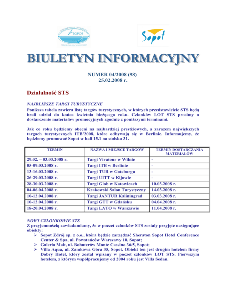 NUMER 04/2008 (98) 25.02.2008 r. Działalność STS NAJBLIśSZE TARGI TURYSTYCZNE PoniŜsza tabela zawiera listę targów turystycznych, w których przedstawiciele STS będą brali udział do końca kwietnia bieŜącego roku. Członków LOT STS prosimy o dostarczenie materiałów promocyjnych zgodnie z poniŜszymi terminami. Jak co roku będziemy obecni na najbardziej prestiŜowych, a zarazem największych targach turystycznych ITB’2008, które odbywają się w Berlinie. Informujemy, Ŝe będziemy promować Sopot w hali 15.1 na stoisku 31. TERMIN 29.02. – 03.03.2008 r. 05-09.03.2008 r. 13-16.03.2008 r. 26-29.03.2008 r. 28-30.03.2008 r. 04-06.04.2008 r. 10-12.04.2008 r. 10-12.04.2008 r. 18-20.04.2008 r. NAZWA I MIEJSCE TARGÓW Targi Vivatour w Wilnie Targi ITB w Berlinie Targi TUR w Goteborgu Targi UITT w Kijowie Targi Glob w Katowicach Krakowski Salon Turystyczny Targi JANTUR Kaliningrad Targi GTT w Gdańsku Targi LATO w Warszawie TERMIN DOSTARCZANIA MATERIAŁÓW 10.03.2008 r. 14.03.2008 r. 03.03.2008 r. 04.04.2008 r. 11.04.2008 r. NOWI CZŁONKOWIE STS Z przyjemnością zawiadamiamy, Ŝe w poczet członków STS zostały przyjęte następujące obiekty: Sopot Zdrój sp. z o.o., która będzie zarządzać Sheraton Sopot Hotel Conference Center & Spa, ul. Powstańców Warszawy 10, Sopot; Galeria Malt, ul. Bohaterów Monte Cassino 36/5, Sopot; Villa Aqua, ul. Zamkowa Góra 35, Sopot. Obiekt ten jest drugim hotelem firmy Dobry Hotel, który został wpisany w poczet członków LOT STS. Pierwszym hotelem, z którym współpracujemy od 2004 roku jest Villa Sedan. NOWA EDYCJA SOPOT SPORT & SPA W punkcie informacji turystycznej przy ulicy Dworcowej 4 w Sopocie moŜna odebrać bezpłatne ulotki promujące produkt turystyczny Sopot Sport & Spa 2008. Ulotki dostępne są w wersji angielsko-rosyjskiej i polsko-niemieckiej. Współpraca z mediami: Aleksandra Mikucka dnia 25.02.2008 roku udzieliła wywiadu dla Gazety Wyborczej na temat nowo powstających obiektów świadczących usługi noclegowe na terenie Miasta Sopotu. Informacje w ramach członkowstwa: WAKACJE Z BŁĘKITNYM PIOTRUSIEM Osoby spragnione Ŝeglarskiej przygody zapraszamy do skorzystania z oferty PMBś Błękitny Piotruś. Oprócz oferty śródlądowej wśród propozycji biura znajdują się rejsy morskie na róŜnych, ciekawych akwenach. Pełna oferta imprez Ŝeglarskich znajduje się na www.blekitnypiotrus.pl Dzieje się w Sopocie: KONSULTACJE W SPRAWIE ZMIANY GRANIC MIASTA <URZĄD MIASTA SOPOTU> W imieniu Prezydenta Miasta Sopotu zapraszamy mieszkańców na konsultacje w sprawie zmiany granic Miasta Sopotu. Powstająca aktualnie wielofunkcyjna hala widowiskowo – sportowa jest wspólną inwestycją Sopotu i Gdańska. Z tego powodu samorządy obu miast wyraziły Ŝyczenie, aby granica między gminami przebiegała dokładnie pośrodku nowej hali. Prezydenci Gdańska i Sopotu, przed ostateczną decyzją chcą poznać opinie mieszkańców. W Sopocie konsultacje społeczne w sprawie zmiany granic miasta prowadzone będą od 20 lutego do 21 marca 2008 r. Dnia 27 lutego 2008 roku o godz. 17.00 w Sali 36 (I piętro) w Urzędzie Miasta Sopotu odbędzie się spotkanie dotyczące uwarunkowań i kierunków zagospodarowania przestrzennego Miasta Sopotu. Zainteresowanych serdecznie zapraszamy. HOTEL PARK HAFFNERA ZAMIAST LUCKY HOTELS < www.gazeta.pl > JuŜ jesienią b.r. rozpoczną się pracę budowlane w Kamiennym Potoku. Lucky Hotels został zakupiony przez firmę Polnord, która planuje wybudować w miejscu obecnego hotelu zespół hotelowo – apartamentowi o nazwie Hotel Park Haffnera. Całość ma mieć standard czterech gniazdek i składać się z sześciu budynków o wysokości od 14 – 25 metrów. Pierwszych gości Park Haffnera ma przyjąć w 2010 roku. SOPOCKIE CENTRUM WOLONTARIATU (SCW) Sopockie Centrum Wolontariatu zaprasza na szkolenie z zakresu ułatwienia nawiązania współpracy z wolontariuszem, odpowiadające na pytanie „Jak efektywnie współpracować z wolontariuszem?”. Szkolenie jest bezpłatne, a odbędzie się w dniu 03.03.2008 r. Zgłoszenia naleŜy przesyłać drogą elektroniczną do 27.02.2008 r. W celu uzyskania karty zgłoszeniowej prosimy o kontakt z Panią Anną Horak - (58)551-43-99, 600-633-101. Sopockie Centrum Wolontariatu wspiera współpracę między organizacjami / instytucjami, a wolontariuszami. W tym celu SCW: pośredniczy w nawiązaniu współpracy między organizacją / instytucją a wolontariuszem; przygotowuje organizacje / instytucje do współpracy z wolontariuszem (szkolenie dot. idei wolontariatu, aspektów prawnych współpracy – prawa i obowiązki wolontariusza, obowiązki organizacji / instytucji); przygotowuje do pracy wolontariuszy (szkolenie dot. praw i obowiązków wolontariusza, etyki postępowania); udostępnia niezbędną dokumentację. Dzieje się w regionie: TRÓJMIASTO W KOMÓRCE <www.trojmiasto.pl > Gdańska Organizacja Turystyczna (GOT) przygotowuje system informacji miejskiej na telefon komórkowy. System będzie informował o wydarzeniach w całym Trójmieście, m.in. o wydarzeniach kulturalnych, rozrywkowych, zakwaterowaniu, gastronomii i innych usługach. śeby skorzystać z informacji będzie trzeba ściągnąć ze strony GOT odpowiednie oprogramowanie, które nieodpłatnie udostępniła firma MDWmobile z Krakowa. Przesyłanie danych do komputera odbywać się będzie w technologii GPRS (koszt transferu wyniesie ok. 1-2 zł). Projekt ma ruszyć przed długim weekendem majowym. TARGI TUR- GASTRO- HOTEL <INEXPO P.A.T> W dniach 5-7 marca 2008 roku we Władysławowie odbędzie się 60 edycja targów branŜy gastronomiczno- hotelarskiej pod nazwą TUR- GASTRO- HOTEL juŜ po raz 3 we Władysławowie. Targi organizowane są pod patronatem: Polskiej Izby Turystyki, Polskiej Organizacji Turystycznej, Dziennika Bałtyckiego oraz Burmistrza Miasta Władysławowa. Wszelkie informacje i szczegóły dotyczące udziału w targach dostępne są pod nr telefonu 032 376 08 60 oraz na w