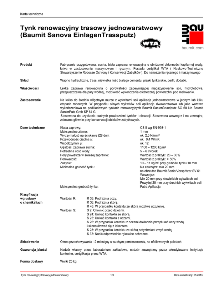 Karta techniczna Tynk renowacyjny trasowy jednowarstwowy (Baumit Sanova EinlagenTrassputz) Produkt Fabrycznie przygotowana, sucha, biała zaprawa renowacyjna o obniżonej chłonności kapilarnej wody, łatwa w zastosowaniu maszynowym i ręcznym. Posiada certyfikat WTA ( Naukowo-Techniczne Stowarzyszenie Robocze Ochrony i Konserwacji Zabytków ). Do nanoszenia ręcznego i maszynowego Skład Wapno hydrauliczne, trass, niewielka ilość białego cementu, pisaki tynkarskie, perlit, dodatki. Właściwości Lekka zaprawa renowacyjna o porowatości zapewniającej magazynowanie soli, hydrofobowa, przepuszczalna dla pary wodnej, możliwość wykończenia ostatecznej powierzchni pod malowanie. Zastosowanie Na lekko do średnio wilgotnym murze z wykwitami soli aplikacja jednowarstwowa w jednym lub kilku etapach roboczych. W przypadku silnych wykwitów soli aplikacja dwuwarstwowa lub jako warstwa wykończeniowa na podkładowych tynkach renowacyjnych Baumit SanierGrundputz SG 68 lub Baumit SanierPutz Grob SP 64 G Stosowana do uzyskania suchych powierzchni tynków i elewacji. Stosowana wewnątrz i na zewnątrz, zalecana głównie przy konserwacji obiektów zabytkowych. Dane techniczne Klasa zaprawy: Maksymalne ziarno: Wytrzymałość na ściskanie (28 dni): Przewodność cieplna λ: Współczynnik µ: Gęstość, zaprawa sucha: Potrzebna ilość wody: Pory powietrza w świeżej zaprawie: Porowatość: Zużycie: Minimalna grubość tynku: CS II wg EN-998-1 1 mm ok. 2,5 N/mm2 ok. 0,4 W/mK ok. 12 1100 – 1200 kg/m3 5 – 6 l/worek Wartość z praktyki: 26 – 30% Wartość z praktyki: > 50% 10 – 11 kg/m2 przy grubości tynku 10 mm Na zewnątrz: min 20 mm na obrzutce Baumit SanierVorspritzer SV 61 Wewnątrz: Min 20 mm przy niewielkich wykwitach soli Powyżej 20 mm przy średnich wykwitach soli Patrz Aplikacja. Maksymalna grubość tynku: Klasyfikacja wg ustawy o chemikaliach Wartości R: Wartości S: R 36: Podrażnia oczy. R 38: Podrażnia skórę. R 43: W przypadku kontaktu ze skórą możliwe uczulenie. S 2: Chronić przed dziećmi. S 24: Unikać kontaktu ze skórą. S 25: Unikać kontaktu z oczami. S 26: W przypadku kontaktu z oczami dokładnie przepłukać oczy wodą i skonsultować się z lekarzem. S 28: W przypadku kontaktu ze skórą natychmiast zmyć wodą. S 37: Nosić odpowiednie rękawice ochronne. Składowanie Okres przechowywania 12 miesięcy w suchym pomieszczeniu, na ofoliowanych paletach. Gwarancja jakości Nadzór własny przez laboratorium zakładowe, nadzór zewnętrzny przez akredytowane instytucje kontrolne, certyfikacja przez WTA. Forma dostawy Worki 25 kg Tynk renowacyjny trasowy jednowarstwowy 1/3 Data aktualizacji: 01/2013 Karta techniczna Podłoże Podłoże musi być czyste, suche, nieprzemarznięte, odpylone i wolne od luźnych części, hydrofilne, wolne od wykwitów solnych, musi także mieć odpowiednią nośność i temperaturę powyżej +50C. Występujący mech, glony i zazielenienia należy usunąć za pomocą środka Baumit SanierLösung.. W przypadku aplikacji ręcznej, na zewnątrz oraz w przypadku podłoży o złej lub różnorodnej chłonności, a także w przypadku murów zabytkowych o wymaganej różnej grubości tynku należy zawsze używać obrzutki renowacyjnej zwiększającej przyczepność Baumit SanierVorspritzer SV 61 Aplikacja Zaprawę Baumit Sanova EinlagenTrassputz miesza się z czystą wodą. Czas mieszania mieszadłem 3-5 minut. Zaprawę Baumit Sanova EinlagenTrassputz można również nakładać z pomocą agregatów tynkarskich. Wewnątrz: Znormalizowany, równy mur, grubości tynku 10 do 20 mm (jednowarstwowo), niewielka wilgotność, niewielkie wykwity soli: obrzutka opcjonalnie zaprawa Baumit Sanova EinlagenTrassputz nakładać maszynowo, zatrzeć packą filcową. Wewnątrz i na zewnątrz: Mur z cegły i z kamienia (nieregularny) lub podobny, grubość tynku min 20 mm (jednowarstwowo), niewielkie lub średnie wykwity soli: obrzutka z Baumit SanierVorspritzer SV 61, krycie do 50% (mieć na uwadze czas twardnienia), zaprawa Baumit Sanova EinlagenTrassputz nakładana maszynowo, zatrzeć packą filcową. Mur (nieregularny), grubości tynku do 30 mm (jedno- lub dwuwarstwowo), niewielka wilgotność, niewielkie wykwity soli: obrzutka z Baumit SanierVorspritzer SV 61 krycie do 50% (mieć na uwadze czas twardnienia), zaprawa Baumit Sanova EinlagenTrassputz lub Baumit SelfporSanierputz SP 64 P nakładana ręcznie lub maszynowo: 1-sza warstwa do 25 mm, powierzchnię zatrzeć na szorstko grzebieniem do tynkarskim (czas twardnienia ok. 24 godziny); 2-ga warstwa zaprawy Baumit Sanova EinlagenTrassputz min 10 mm, na tynk podkładowy Baumit SanierPutz Grob SP 64 P min 10mm zatrzeć packą filcową. Mur z cegły lub z kamienia (nieregularny), grubości tynku od 30 do maks. 80 mm (jedno- lub dwuwarstwowo), średnia wilgotność, średnie do większych wykwity soli: obrzutka z Baumit SanierVorspritzer SV 61 krycie w 50 % (mieć na uwadze czas twardnienia), zaprawa Baumit SanierGrundputz SG 68 nakładana maszynowo: 1-sza warstwa (warstwa wyrównująca), powierzchnię zatrzeć na szorstko siatką do zacierania tynku (czas twardnienia ok. 7 dni w zależności od grubości tynku, zwilżać i wietrzyć przez 2 -3 dni); 2-ga warstwa zaprawy Baumit Sanova EinlagenTrassputz o równomiernej grubości min 10 mm, zatrzeć packą filcową. Wskazówki i informacje ogólne W trakcie aplikacji i procesu twardnienia temperatura otoczenia, materiału i podłoża musi wynosić powyżej +50C. Przed każdym kolejnym nałożeniem warstwy zachowywać okres twardnienia min. 7 dni na każdy cm grubości tynku. Wykończenie na zewnątrz: Baumit NanoporTop na Baumit UniPrimer Baumit NanoporColor Baumit SilikatTop na Baumit UniPrimer Baumit SilikatColor Baumit SilikonTop na Baumit UniPrimer Baumit SilikonColor Tynk renowacyjny trasowy jednowarstwowy 2/3 Data aktualizacji: 01/2013 Karta techniczna Wykończenie wewnątrz: Baumit SilikatColor Baumit SilikonColor Okres wytrzymałości systemu r