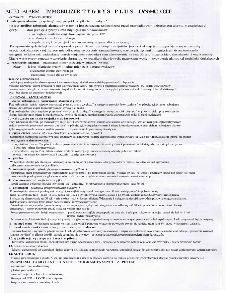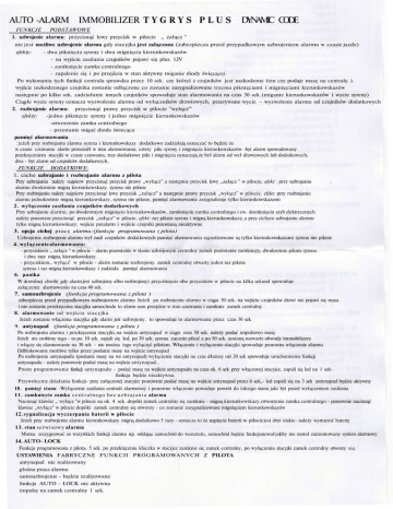 AUTO -ALARM IMMOBILIZER T Y G R Y S P L U S DYNAMIC CODE FUNKCJE PODSTAWOWE 1. uzbrojenie alarmu: przycisnąć lewy przycisk w pilocie „ załącz " nie jest możliwe uzbrojenie alarmu gdy stacyjka jest załączona (zabezpiecza przed przypadkowym uzbrojeniem alarmu w czasie jazdy) efekty: - dwa piknięcia syreny i dwa mignięcia kierunkowskazów - na wyjściu zasilania czujników pojawi się plus 12V - zaniknięcie zamka centralnego - zapalenie się i po przejściu w stan aktywny miganie diody święcącej Po wykonaniu tych funkcji centrala sprawdza przez 10 sek. czy któryś z czujników jest uszkodzony (tzn czy podaje masę na centralę ). wyjście uszkodzonego czujnika zostanie odłączone co zostanie zasygnalizowane trzema piknięciami i mignięciami kierunkowskazów następnie po kilku sek. zadziałanie innych czujników spowoduje stan alarmowania na czas 30 sek. (miganie kierunkowskazów i wycie syreny) Ciągłe wycie syreny oznacza wyzwolenie alarmu od wyłączników drzwiowych, przerywane wycie - wyzwolenie alarmu od czujników dodatkowych 2. rozbrojenie alarmu: przycisnąć prawy przycisk w pilocie "wyłącz'" efekty: -jedno piknięcie syreny i jedno mignięcie kierunkowskazów -otworzenie zamka centralnego - przestanie migać dioda świecąca pamięć alarmowania : jeżeli przy rozbrajaniu alarmu syrena i kierunkowskazy dodatkowo zadziałają oznaczać to będzie że w czasie czuwania alarm przeszedł w stan alarmowania; cztery piki syreny i mignięcia kierunkowskazów -byt alarm spowodowany przekręceniem stacyjki w czasie czuwania, trzy dodatkowe piki i mignięcia oznaczają że był alarm od wył drzwiowych lub dodatkowych, dwa - byt alarm od czujników dodatkowych, FUNKCJE DODATKOWE: 1. ciche uzbrajanie i rozbrajanie alarmu z pilota Przy uzbrajaniu należy najpierw przycisnąć przycisk prawy „wyłącz" a następnie przycisk lewy „załącz " w pilocie, efekt przy uzbrajaniu alarmu dwukrotnie migną kierunkowskazy. syrena nie piknie Przy rozbrajaniu należy najpierw przycisnąć lewy przycisk „załącz" a następnie prawy przycisk „wyłącz" w pilocie. efekt: przy rozbrajaniu alarmu jednokrotnie migną kierunkowskazy, syrena nie piknie, pamięć alarmowania zasygnalizuje tylko kierunkowskazami 2. wyłączenie zasilania czujników dodatkowych Przy uzbrajaniu alarmu, po dwukrotnym mignięciu kierunkowskazów, zamknięciu zamka centralnego i ew. domknięciu szyb elektrycznych należy ponownie przycisnąć przycisk „załącz" w pilocie, efekt: raz piknie syrena i migną kierunkowskazy, a przy cichym uzbrajaniu alarmu tylko migną kierunkowskazy; wejście prealarm i wejście czujniki pozostaną nieaktywne 3. opcja cichej pracy alarmu-(funkcja programowana z pilota) Uzbrojenie. rozbrojenie alarmu wył zasil czujników dodatkowych pamięć alarmowania sygnalizowane są tylko kierunkowskazami syrena nie piknie 4. wyłączenie alarmowania: - przyciskiem „ załącz " w pilocie - alarm pozostanie w stanie uzbrojonym centralny zamek pozostanie zamknięty, dwukrotnie piknie syrena i dwa razy migną kierunkowskazy - przyciskiem,. wyłącz' w pilocie - alarm zostanie rozbrojony. zamek centralny otwarty jeden raz piknie syrena i raz migną kierunkowskazy i zadziała pamięć alarmowania 6. panika W dowolnej chwili( gdy alarm jest uzbrojony albo rozbrojony) przyciśnięcie obu przycisków w pilocie na kilka sekund spowoduje załączenie alarmowaniu na czas 40 sek. 7. samouzbrojenie (funkcja programowana z pilota ) zabezpiecza przed przypadkowym rozbrojeniem alarmu Jeżeli po rozbrojeniu alarmu w ciągu 30 sek. na wejściu czujników drzwi nie pojawi się masa i nie zostanie przekręcona stacyjka samochodu to alarm sam przejdzie w stan czuwania i zamknie zamek centralny 8. alarmowanie od wejścia stacyjka Jeżeli zostanie włączona stacyjka gdy alarm jest uzbrojony. to spowoduje to alarmowanie przez czas 30 sek 9. antynapad (funkcja programowana z pilota ) Po rozbrojeniu alarmu i przekręceniu stacyjki, na wejście antynapad w ciągu max 50 sek. należy podać impulsowo masę Jeżeli nie zrobimy tego - to po 10 sek. zapali się led, po 30 sek. syrena zacznie pikać a po 50 sek. zostaną rozwarte obwody immobilizera i włączy się alarmowanie na 30 sek - nie można tego wyłączyć pilotem Włączenie i wyłączenie stacyjki spowoduje ponowne włączenie alarmu Odblokowanie możliwe tylko przez podanie masy na wyjście antynapad Po rozbrojeniu antynapadu (podanie masy na we antynapad) wyłączenie stacyjki na czas dłuższy niż 20 sek spowoduje uruchomienie funkcji antynapadu - należy ponownie podać masę na wejście antynapad.. Proste programowanie funkcji antynapadu - podać masę na wejście antynapadu na czas ok. 6 sek przy włączonej stacyjce, zapali się led na 1 sekfunkcja będzie nieaktywna. Przywrócenie działania funkcji- przy załączonej stacyjce ponownie podać masę na wejście antynapad przez 6 sek, - led zapali się na 3 sek antynapad będzie aktywny 10. pamięć stanu -Wyłączenie zasilania centrali alarmowej i ponowne włączenie powoduje powrót do takiego stanu jaki byt przed wyłączeniem zasilania 11. zamkniecie zamka c e n t r a l n e g o bez u z b r a j a n i a alarmu Nacisnąć klawisz „ wyłącz "w pilocie na ok. 4 sek. dopóki zamek centralny się zamknie - migną kierunkowskazy. otworzenie zamka centralnego - ponownie nacisnąć klawisz „wyłącz" w pilocie dopóki zamek centralny się otworzy - co zostanie zasygnalizowane mignięciem kierunkowskazów 12. sygnalizacja wyczerpania baterii w pilocie Jeżeli przy rozbrojeniu alarmu kierunkowskazy migną dodatkowo 5 razy - oznacza to że napięcie baterii w pilocie jest zbyt niskie- należy wymienić baterię 13. stan serwisowy alarmu Można zrezygnować ze wszystkich funkcji alarmu np. oddając samochód do warsztatu, samochód będzie funkcjonował jakby nie został zamontowany system alarmowy 14. AUTO- LOCK Funkcja programowana z pilota. 5 sek. po przekręceniu kluczka w stacyjce zamknie się