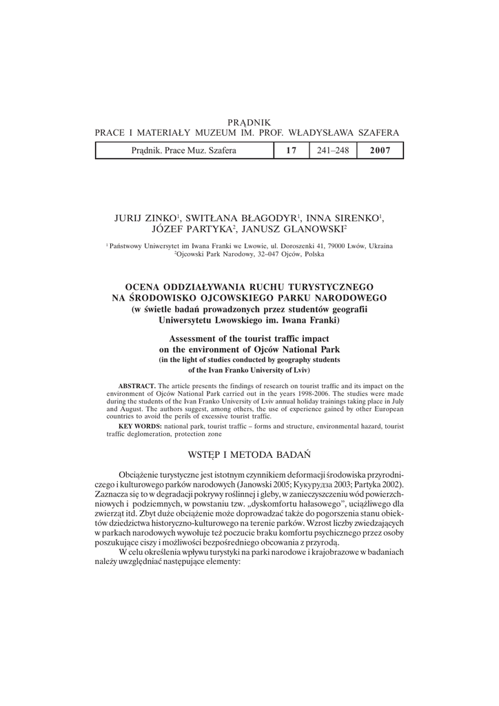 PRĄDNIK PRACE I MATERIAŁY MUZEUM IM. PROF. WŁADYSŁAWA SZAFERA Prądnik. Prace Muz. Szafera 17 241–248 2007 JURIJ ZINKO1, SWITŁANA BŁAGODYR1, INNA SIRENKO1, JÓZEF PARTYKA2, JANUSZ GLANOWSKI2 1 Państwowy Uniwersytet im Iwana Franki we Lwowie, ul. Doroszenki 41, 79000 Lwów, Ukraina 2 Ojcowski Park Narodowy, 32–047 Ojców, Polska OCENA ODDZIAŁYWANIA RUCHU TURYSTYCZNEGO NA ŚRODOWISKO OJCOWSKIEGO PARKU NARODOWEGO (w świetle badań prowadzonych przez studentów geografii Uniwersytetu Lwowskiego im. Iwana Franki) Assessment of the tourist traffic impact on the environment of Ojców National Park (in the light of studies conducted by geography students of the Ivan Franko University of Lviv) ABSTRACT. The article presents the findings of research on tourist traffic and its impact on the environment of Ojców National Park carried out in the years 1998-2006. The studies were made during the students of the Ivan Franko University of Lviv annual holiday trainings taking place in July and August. The authors suggest, among others, the use of experience gained by other European countries to avoid the perils of excessive tourist traffic. KEY WORDS: national park, tourist traffic – forms and structure, environmental hazard, tourist traffic deglomeration, protection zone WSTĘP I METODA BADAŃ Obciążenie turystyczne jest istotnym czynnikiem deformacji środowiska przyrodniczego i kulturowego parków narodowych (Janowski 2005; Кукурудза 2003; Partyka 2002). Zaznacza się to w degradacji pokrywy roślinnej i gleby, w zanieczyszczeniu wód powierzchniowych i podziemnych, w powstaniu tzw. „dyskomfortu hałasowego”, uciążliwego dla zwierząt itd. Zbyt duże obciążenie może doprowadzać także do pogorszenia stanu obiektów dziedzictwa historyczno-kulturowego na terenie parków. Wzrost liczby zwiedzających w parkach narodowych wywołuje też poczucie braku komfortu psychicznego przez osoby poszukujące ciszy i możliwości bezpośredniego obcowania z przyrodą. W celu określenia wpływu turystyki na parki narodowe i krajobrazowe w badaniach należy uwzględniać następujące elementy: 242 J. Zinko, S. Błagodyr, I. Sirenko, J. Partyka, J. Glanowski 1) ilościowe wskaźniki ruchu turystycznego w różnych interwałach czasowych – sezon, miesiąc, dzień (Matczak 2002; Szczeciński i in. red. 2005); 2) szczególne cechy ruchu turystycznego (wiek zwiedzających, rodzaje zachowań i zajęć turystycznych); 3) jakościowe i ilościowe parametry bezpośredniego i pośredniego oddziaływania turystów na środowisko parku. W niniejszym artykule przedstawione zostały wyniki badań ruchu turystycznego oraz jego oddziaływania na środowisko Ojcowskiego Parku Narodowego w latach 1998–2006. Badania przeprowadzono w czasie praktyk studentów Uniwersytetu Lwowskiego im. Iwana Franki (kierunki: „turystyka” i „zarządzanie turystyką”) odbywających się jeden raz w roku w lipcu i sierpniu. Celem praktyk były badania ruchu turystycznego i organizacji turystyki na poziomie lokalnym (miejscowość Ojców, miasto Kraków) i regionalnym (woj. małopolskie i śląskie). Praktyka przewidywała szczegółowe analizy weekendowego ruchu turystycznego w centralnej części Ojcowskiego Parku Narodowego. Badaniami objęto obszar OPN od parkingu na Złotej Górze wzdłuż pieszych szlaków turystycznych do centrum Ojcowa w rejonie ojcowskiego zamku, następnie odcinek Doliny Prądnika od zamku do Krakowskiej Bramy oraz szlak od Krakowskiej Bramy do Jaskini Łokietka. W celu określenia wielkości ruchu turystycznego zastosowano metodę bezpośredniego liczenia turystów w poszczególnych punktach, ewidencję samochodów i sprzedanych biletów za wjazd na parkingi i do zwiedzanych obiektów. Badania prowadzano w jeden z dni wolnych od pracy (sobotę lub niedzielę) w ciągu ośmiu godzin roboczych od 9.00 do 17.00. Notowano liczbę turystów dla każdej pełnej godziny. Badania przeprowadzała grupa studentów licząca od 15 do 25 osób w następujących punktach (ryc. 1): – dwa parkingi: a) na Złotej Górze, b) parking przy zamku w Ojcowie; – trzy obiekty: a) jaskinia Łokietka, b) Krakowska Brama, c) Muzeum Przyrodnicze im. Prof. W. Szafera; – obiekty infrastruktury usługowej (lokale gastronomiczne oraz punkty sprzedaży pamiątek). Wyznaczone miejsca ewidencji ruchu turystycznego pozwoliły ocenić natężenie ruchu w różnych częściach parku w ciągu weekendu, określić maksymalną liczbę turystów na poszczególnych obiektach w ciągu ośmiu godzin dnia z maksymalnym natężeniem ruchu, oraz określić sytuacje „dyskomfortowe” dla środowiska. W badaniach struktury ruch turystycznego analizowano następujące parametry: wiek turystów, płeć, forma turystyki. Ilościowa ocena ruchu turystycznego w weekendy w Parku została uzupełniona bezpośrednimi obserwacjami oddziaływania turystów pieszych, rowerowych i samochodowych na środowisko naturalne. Ocenę stanu środowiska parku oraz jego przygotowania na obsługę różnych grup turystów uzyskano na podstawie ankiety wśród turystów. Kwestionariusz ankiety został opracowany w Instytucie Turystyki w Warszawie w ramach projektu badawczego PAUCI (Zaręba 2000). W ankietach turyści polscy i zagraniczni oceniali (w punktach) poziom atrakcyjności i zagospodarowania turystycznego parku, podawali swoje propozycję w zakresie optymalizacji obsługi turystów, w tym wprowadzenia polityki pobytowej w parku. Ojcowski Park Narodowy zajmuje wiodące miejsce wśród parków narodowych Polski w zakresie natężenia ruchu turystycznego: pierwsze miejsce co do liczby turystów w przeliczeniu na 1 ha powierzchni (140–200 osób na 1 ha) oraz trzecie miejsce pod względem Ocena oddziaływania ruchu turystycznego na środowisko OPN 243 Pieskowa Skała Prądn ik Złota Góra Ojców Są sp ó wk a Jaskinia Łokietka 0 1 2 3 km Ryc. 1. Miejsce prowadzenia badań Fig. 1. Location of research liczby turystów na 1 km szlaku turys