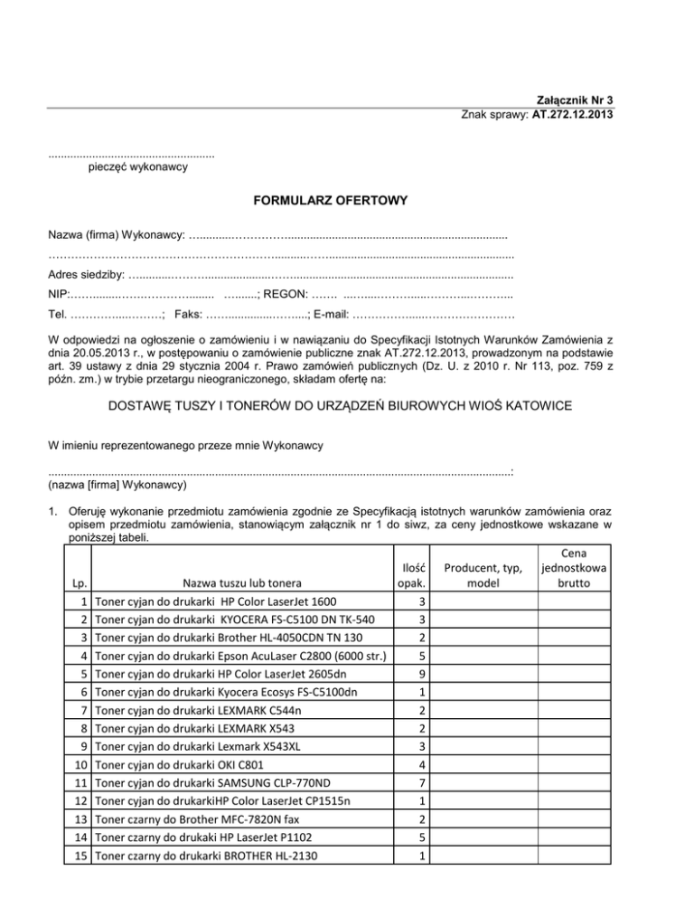 Załącznik Nr 3 Znak sprawy: AT.272.12.2013 ..................................................... pieczęć wykonawcy FORMULARZ OFERTOWY Nazwa (firma) Wykonawcy: …..........……………...................................................................... ……………………………………………………..........……........................................................... Adres siedziby: …..........……….....................……...................................................................... NIP:……........…….…………........ ….......; REGON: ……. ...…....……….....………...………... Tel. …………....………; Faks: ……..............……....; E-mail: …………….....…………………… W odpowiedzi na ogłoszenie o zamówieniu i w nawiązaniu do Specyfikacji Istotnych Warunków Zamówienia z dnia 20.05.2013 r., w postępowaniu o zamówienie publiczne znak AT.272.12.2013, prowadzonym na podstawie art. 39 ustawy z dnia 29 stycznia 2004 r. Prawo zamówień publicznych (Dz. U. z 2010 r. Nr 113, poz. 759 z późn. zm.) w trybie przetargu nieograniczonego, składam ofertę na: DOSTAWĘ TUSZY I TONERÓW DO URZĄDZEŃ BIUROWYCH WIOŚ KATOWICE W imieniu reprezentowanego przeze mnie Wykonawcy ...................................................................................................................................................: (nazwa [firma] Wykonawcy) 1. Oferuję wykonanie przedmiotu zamówienia zgodnie ze Specyfikacją istotnych warunków zamówienia oraz opisem przedmiotu zamówienia, stanowiącym załącznik nr 1 do siwz, za ceny jednostkowe wskazane w poniższej tabeli. Lp. 1 2 3 4 5 6 7 8 9 10 11 12 13 14 15 Ilość Nazwa tuszu lub tonera opak. Toner cyjan do drukarki HP Color LaserJet 1600 3 Toner cyjan do drukarki KYOCERA FS-C5100 DN TK-540 3 Toner cyjan do drukarki Brother HL-4050CDN TN 130 2 Toner cyjan do drukarki Epson AcuLaser C2800 (6000 str.) 5 Toner cyjan do drukarki HP Color LaserJet 2605dn 9 Toner cyjan do drukarki Kyocera Ecosys FS-C5100dn 1 Toner cyjan do drukarki LEXMARK C544n 2 Toner cyjan do drukarki LEXMARK X543 2 Toner cyjan do drukarki Lexmark X543XL 3 Toner cyjan do drukarki OKI C801 4 Toner cyjan do drukarki SAMSUNG CLP-770ND 7 Toner cyjan do drukarkiHP Color LaserJet CP1515n 1 Toner czarny do Brother MFC-7820N fax 2 Toner czarny do drukaki HP LaserJet P1102 5 Toner czarny do drukarki BROTHER HL-2130 1 Producent, typ, model Cena jednostkowa brutto 16 Toner czarny do drukarki Brother HL-4050CDN TN 130 Toner czarny do drukarki Epson AcuLaser C2800 (8000 17 str.) 18 Toner czarny do drukarki HP 5P OptimumPro 19 Toner czarny do drukarki HP Color LaserJet 1600 20 Toner czarny do drukarki HP Color LaserJet 2605dn 21 Toner czarny do drukarki HP Color LaserJet CP1515n 22 Toner czarny do drukarki HP LaserJet 1160 23 Toner czarny do drukarki HP LaserJet P1005 24 Toner czarny do drukarki HP LaserJet P1102 25 Toner czarny do drukarki HP LaserJet P2055d 26 Toner czarny do drukarki HP LJ 6L 27 Toner czarny do drukarki HP LP 4P 28 Toner czarny do drukarki Kyocera Ecosys FS-C5100dn 29 Toner czarny do drukarki KYOCERA FS-C5100 DN TK-540 30 Toner czarny do drukarki LEXMARK C544n 31 Toner czarny do drukarki Lexmark W840 32 Toner czarny do drukarki LEXMARK X543 33 Toner czarny do drukarki Lexmark X543XL 34 Toner czarny do drukarki OKI C801 35 Toner czarny do drukarki OLIVETTI d-Copia 1600 36 Toner czarny do drukarki Samsung CLP-770ND Toner czarny do drukarki Samsung ML 1610/2012 37 Optimum Pro 38 Toner czarny do faksu Panasonic KX-M 2025 39 Toner czarny do Minolta TN 114 40 Toner czarny do NASHUATEK 1305 t. Ricoh 1250D/AF 41 Toner czarny do Panasonic KX-MB 2030 fax 42 Toner do drukarki Nashuatec SP C410 DN czarny 43 Toner do drukarki Nashuatec SP C410 DN niebieski 44 Toner do drukarki HP LaserJet 10xx 45 Toner do drukarki Lexmark E360dn duża pojemność 46 Toner do drukarki Lexmark MS510 duża pojemność 47 Toner do drukarki Nashuatec SP C410 DN różowy 48 Toner do drukarki Nashuatec SP C410 DN żółty 49 Toner magenta do drukarki HP Color LaserJet 1600 Toner magenta do drukarki KYOCERA FS-C5100 DN TK50 540 51 Toner magenta do drukarki Brother HL-4050CDN TN 130 Toner magenta do drukarki Epson AcuLaser C2800 (6000 52 str.) 53 Toner magenta do drukarki HP Color Laser Jet 2605dn 54 Toner magenta do drukarki HP Color LaserJet CP1515n 55 Toner magenta do drukarki Kyocera Ecosys FS-C5100dn 56 Toner magenta do drukarki LEXMARK C544n 3 15 1 3 15 2 1 4 2 2 3 1 2 2 4 3 2 2 4 6 11 2 2 1 2 4 2 1 14 14 4 1 1 3 3 2 4 9 2 1 4 57 58 59 60 61 62 63 64 65 66 67 68 69 70 71 72 73 74 75 76 77 78 79 80 81 82 83 84 85 86 87 88 89 90 91 92 93 94 95 96 97 98 99 Toner magenta do drukarki LEXMARK X543 Toner magenta do drukarki Lexmark X543XL Toner magenta do drukarki OKI C801 Toner magenta do drukarki Samsung CLP-770ND Toner yellow do drukarki HP Color LaserJet 1600 Toner yellow do drukarki KYOCERA FS-C5100 DN TK-540 Toner yellow do drukarki Brother HL-4050CDN TN 130 Toner Yellow do drukarki Epson AcuLaser C2800 (6000 str.) Toner Yellow do drukarki HP Color Laser Jet 2605dn Toner yellow do drukarki Kyocera Ecosys FS-C5100dn Toner yellow do drukarki LEXMARK C544n Toner yellow do drukarki LEXMARK X543 Toner yellow do drukarki Lexmark X543XL Toner yellow do drukarki OKI C801 Toner Yellow do drukarki Samsung CLP-770ND Toner yellow do drukarkiHP Color LaserJet CP1515n Tusz cyjan do drukarki HP OfficePRO 8500A (CM755) Tusz czarny do drukarki EPSON STYLUS C43SX Tusz czarny do drukarki HP DeskJet 2460 Tusz czarny do drukarki HP DeskJet 3325 Tusz czarny do drukarki HP DeskJet 3745 Tusz czarny do drukarki HP DeskJet 3845 Tusz czarny do drukarki HP DeskJet 5150 Tusz czarny do drukarki HP DeskJet 5550 Tusz czarny do drukarki HP DeskJet 840C Tusz czarny do drukarki HP DeskJet D2360 Tusz czarny do drukarki HP DJ 6940 Tusz czarny do drukarki HP OfficeJet 100 Tusz czarny do drukarki HP Officejet 6000 Tusz czarny do drukarki HP Office