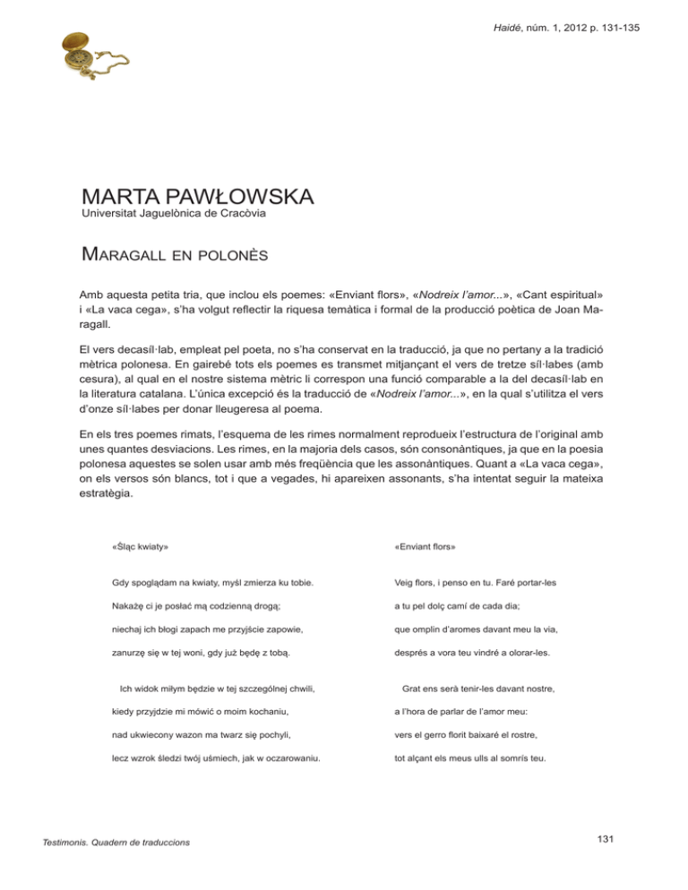 Haidé, núm. 1, 2012 p. 131-135 MARTA PAWŁOWSKA Universitat Jaguelònica de Cracòvia Maragall en polonès Amb aquesta petita tria, que inclou els poemes: «Enviant flors», «Nodreix l’amor...», «Cant espiritual» i «La vaca cega», s’ha volgut reflectir la riquesa temàtica i formal de la producció poètica de Joan Maragall. El vers decasíl·lab, empleat pel poeta, no s’ha conservat en la traducció, ja que no pertany a la tradició mètrica polonesa. En gairebé tots els poemes es transmet mitjançant el vers de tretze síl·labes (amb cesura), al qual en el nostre sistema mètric li correspon una funció comparable a la del decasíl·lab en la literatura catalana. L’única excepció és la traducció de «Nodreix l’amor...», en la qual s’utilitza el vers d’onze síl·labes per donar lleugeresa al poema. En els tres poemes rimats, l’esquema de les rimes normalment reprodueix l’estructura de l’original amb unes quantes desviacions. Les rimes, en la majoria dels casos, són consonàntiques, ja que en la poesia polonesa aquestes se solen usar amb més freqüència que les assonàntiques. Quant a «La vaca cega», on els versos són blancs, tot i que a vegades, hi apareixen assonants, s’ha intentat seguir la mateixa estratègia. «Śląc kwiaty» «Enviant flors» Gdy spoglądam na kwiaty, myśl zmierza ku tobie. Veig flors, i penso en tu. Faré portar-les Nakażę ci je posłać mą codzienną drogą; a tu pel dolç camí de cada dia; niechaj ich błogi zapach me przyjście zapowie, que omplin d’aromes davant meu la via, zanurzę się w tej woni, gdy już będę z tobą. després a vora teu vindré a olorar-les. Ich widok miłym będzie w tej szczególnej chwili, Grat ens serà tenir-les davant nostre, kiedy przyjdzie mi mówić o moim kochaniu, a l’hora de parlar de l’amor meu: nad ukwiecony wazon ma twarz się pochyli, vers el gerro florit baixaré el rostre, lecz wzrok śledzi twój uśmiech, jak w oczarowaniu. tot alçant els meus ulls al somrís teu. Testimonis. Quadern de traduccions 131 Marta Pawłowska. Maragall en polonès Ty wówczas po kwiat sięgniesz płonący szkarłatem, powyżej swojej piersi subtelnie go wbijesz al damunt del teu pit la clavaràs, i by móc się upajać jego aromatem i, amb moviment de cígnia bellesa, powabnym ruchem wygniesz swą łabędzią szyję. arquejant el teu coll l’oloraràs. Gdy twe łagodne tchnienie całkiem ją owionie Al sentir l’alè tebi amb què la mulles, i żar twojego lica ze wszech stron osaczy, al frec constant del teu bell rostre ardent, róża wszystkie swe listki wyciągnie jak dłonie la rosa adreçarà totes ses fulles i wszystkie swoje płatki otworzy w rozpaczy i es badarà desesperadament. Ty uśmiechniesz się do mnie, jednak w okamgnieniu, I encara em mig riuràs; mes quan me veges gdy ujrzysz, jak me oczy podczas tej zabawy de tu a la flor, mentres jugueu aixís, śledzą ciebie i różę, gorejąc w pragnieniu, moure l’esguard, guspirejant d’enveges, niczym mgła się rozwieje twój uśmiech łaskawy. fugirà en sec ton confiat somrís. «Syć miłość» 132 Tu triaràs una poncella encesa, «Nodreix l'amor...» Syć miłość myślą i nieobecnością, Nodreix l'amor de pensaments i ausència, a wyda naonczas najpiękniejszy kwiat; i així traurà meravellosa flor; ceń nisko rozkosz i gardź przyjemnością, menysprea el pas de tota complacència gdy bólu w nich nie ma i cierpienia brak. que no et vinga per via del dolor. Poza westchnieniem nic cię nie poruszy, No esperis altre do que el de tes llàgrimes żadnych darów nie czekaj poza łzami: ni vulles més consol que els teus sospirs: najczulsze słowo znajdziesz w swojej duszy, la paraula millor la tens a l'ànima, a wiatr okryje cię pocałunkami. i el bes més dolç te'l duen els zefirs. Ideałowi, który czcisz z lubością, Mai seria l'aimada en sa presència rzeczywistość nigdy nie dorówna wszak. com és ara en la teva adoració. Syć miłość myślą i nieobecnością, Nodreix l'amor de pensaments i ausència, a wyda naonczas najpiękniejszy kwiat. i així traurà meravellosa flor. Haidé, núm. 1, 2012 p. 131-135 «Pieśń duchowa» «Cant espiritual» Jeśli świat jest tak piękny, Panie, a me oczy Si el món ja és tan formós, Senyor, si es mira chłoną go z tą błogością, którą wszystkich darzysz, amb la pau vostra a dintre de l’ull nostre, czymże to drugie życie jeszcze mnie zaskoczy? ¿què més ens podeu dar en una altra vida? Stąd też jestem tak wierny mym oczom i twarzy, Per ’xò estic tan gelós dels ulls, i el rostre, i ciału, które mi dałeś, i sercu, co w piersi i el cos que m’heu donat, Senyor, i el cor bez ustanku bije... i tak boję się śmierci. que s’hi mou sempre... ¡i temo tant la mort! Jakichże innych zmysłów, Panie, nam potrzeba, ¿Amb quins altres sentits me’l fareu veure, by ujrzeć nad górami jasny błękit nieba; aquest cel blau damunt de les muntanyes, słońce, co wszędy świeci; toń morskich przeźroczy? i el mar immens, i el sol que pertot brilla? Połącz wieczny spoczynek ze zmysłów rozkwitem, Deu-me en aquests sentits l’eterna pau bo innych nieb nie pragnę poza tym błękitem. i no voldré més cel que aquest cel blau. Niektórzy pierwszy raz chcieli zatrzymać czas, Aquell que a cap moment li digué « Atura’t», kiedy nadeszła chwila, by oddać się śmierci. sinó al mateix que li dugué la mort, Nie rozumiem ich, Panie, gdyż nieustannie ja jo no l’entenc, Senyor; ¡jo, que voldria tyle chwil chcę zatrzymać i to każdego dnia, aturar tants moments de cada dia, aby na wieczność trwały, ukryte w mej piersi! per fé’ls eterns a dintre del meu cor!... A może to ta „wieczność” jest już bramą śmierci? ¿O és que aquest «fer etern» és ja la mort? No a to nasze życie? Czym jest w takim razie? Mes llavores, la vida, què seria? Cieniem czasu jedynie, co upływa śmiele ¿Fóra només l’ombra del temps que passa, lu