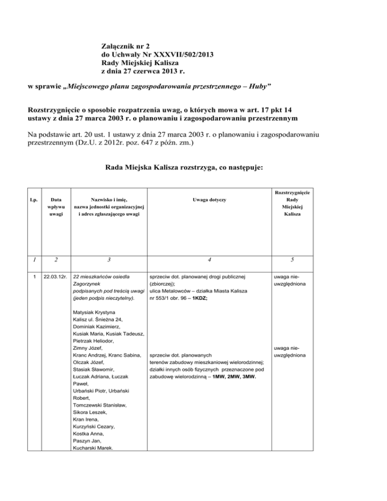 Załącznik nr 2 do Uchwały Nr XXXVII/502/2013 Rady Miejskiej Kalisza z dnia 27 czerwca 2013 r. w sprawie „Miejscowego planu zagospodarowania przestrzennego – Huby” Rozstrzygnięcie o sposobie rozpatrzenia uwag, o których mowa w art. 17 pkt 14 ustawy z dnia 27 marca 2003 r. o planowaniu i zagospodarowaniu przestrzennym Na podstawie art. 20 ust. 1 ustawy z dnia 27 marca 2003 r. o planowaniu i zagospodarowaniu przestrzennym (Dz.U. z 2012r. poz. 647 z późn. zm.) Rada Miejska Kalisza rozstrzyga, co następuje: Lp. Data wpływu uwagi Nazwisko i imię, nazwa jednostki organizacyjnej i adres zgłaszającego uwagi Uwaga dotyczy 1 2 3 4 1 22.03.12r. 22 mieszkańców osiedla Zagorzynek podpisanych pod treścią uwagi (jeden podpis nieczytelny). Matysiak Krystyna Kalisz ul. Śnieżna 24, Dominiak Kazimierz, Kusiak Maria, Kusiak Tadeusz, Pietrzak Heliodor, Zimny Józef, Kranc Andrzej, Kranc Sabina, Olczak Józef, Stasiak Sławomir, Łuczak Adriana, Łuczak Paweł, Urbański Piotr, Urbański Robert, Tomczewski Stanisław, Sikora Leszek, Kran Irena, Kurzyński Cezary, Kostka Anna, Paszyn Jan, Kucharski Marek. sprzeciw dot. planowanej drogi publicznej (zbiorczej); ulica Metalowców – działka Miasta Kalisza nr 553/1 obr. 96 – 1KDZ; sprzeciw dot. planowanych terenów zabudowy mieszkaniowej wielorodzinnej; działki innych osób fizycznych przeznaczone pod zabudowę wielorodzinną – 1MW, 2MW, 3MW. Rozstrzygnięcie Rady Miejskiej Kalisza 5 uwaga nieuwzględniona uwaga nieuwzględniona 2 04.04.12r. 183 mieszkańców osiedla Zagorzynek podpisanych pod treścią uwagi (w tym podpisy z poz 1 - powtórzone) Muth Włodzimierz Kalisz ul. Karkonoska 2; Wenderski Stanisław, Wenderska Barbara Kalisz ul. Świętokrzyska 45; Bestry Sławomir, Bestry Iwona, Bestry Julia Kalisz ul. Świętokrzyska 43; Kran Irena, Kran Arnold Kalisz ul. Świętokrzyska 41; Rapała Krzysztof, Rapała Krystyna Kalisz ul. Świętokrzyska 53; Rogacka Małgorzata Kalisz ul. Świętokrzyska 55; Pracowita Jadwiga Kalisz ul. Świętokrzyska 57; Kucharska Barbara, Kucharski Stanisław, Kucharski Marek Kalisz ul. Świętokrzyska 59; Szajner Krzysztof Kalisz ul. Świętokrzyska 63 Skwarczyńska Małgorzata Kalisz ul. Świętokrzyska 65; Michocka Meler Alina, Meler Marek Kalisz ul. Świętokrzyska 71; Broniarczyk Bartosz, Broniarczyk Agata Kalisz ul. Świętokrzyska 73; Karolak Marian, Karolak Zdzisława Kalisz ul. Świętokrzyska 77; Łachowski Arnold, Łachowska Edyta Kalisz ul. Świętokrzyska 81; Łakomiak Grzegorz Kalisz ul. Świętokrzyska 85; Kuligowska Krystyna Kalisz ul. Świętokrzyska 87; Dominiak Kazimierz, Dominiak Stanisława Kalisz ul. Świętokrzyska 89; Drobnik Barbara Kalisz ul. Świętokrzyska 95; Olczak Józef, Olczak Teresa Kalisz ul. Śnieżna 14; Pietrusiak Heliodor Kalisz ul. Śnieżna 10; Kościelecki Andrzej Kalisz ul. Halna 19; Grandyberg Ryszard Kalisz ul. Halna 17; sprzeciw dot. planowanej drogi publicznej (zbiorczej); ulica Metalow-ców – działka Miasta Kalisza nr 553/1 obr. 96 – 1KDZ; uwaga nieuwzględniona sprzeciw dot. planowanych terenów zabudowy mieszkaniowej wielorodzinnej; działki innych osób fizycznych przeznaczone pod zabudowę wielorodzinną – 1MW, 2MW, 3MW. uwaga nieuwzględniona Kranc Sabina, Kranc Andrzej Kalisz ul. Śnieżna 16; Przybyłek Monika Kalisz ul. Śnieżna 20; Łuczak Adriana Kalisz ul. Śnieżna 20; Marcinkowska Magdalena, Marcinkowski Dariusz Kalisz ul. Karkonoska 20; Łyszczak Zbigniew, Łyszczak Teresa Kalisz ul. Karpacka 29-33/2; Kostka Anna, Łuczak Paweł, Łuczak Hieronim Kalisz ul. Śnieżna 22; Matysiak Eugeniusz, Matysiak Magdalena, Matysiak Krystyna Kalisz ul. Śnieżna 24; Paszyn Maciej, Paszyn Ewa, Paszyn Piotr, Paszyn Marta, Paszyn Tomasz Kalisz ul. Śnieżna 26; Krycki Zbigniew Kalisz ul. Śnieżna 11; Gierczak Magdalena Kalisz ul. Śnieżna 6a; Wallas Kazimierz, Wallas Urszula, Wallas Michał Kalisz ul. Śnieżna 5; Unisławski Zbigniew Kalisz ul. Snieżna 7; Bednarek Czesław Kalisz ul. Źródlana 1; Rybarczyk Stanisław Kalisz ul. Halna 9; Jaśkiewicz Stanisław Kalisz ul. Halna 18; Wzgarda Piotr Kalisz ul. Tatrzańska 106; Mrowiec Grażyna, Mrowiec Andrzej Kalisz ul. Tatrzańska 102; Jagielski Antoni Kalisz ul. Tatrzańska 98; Tarnawski Aleksander Kalisz ul. Tatrzańska 94; Janczyk Zbigniew Kalisz ul. Tatrzańska 90; Ignaszak Barbara Kalisz ul. Tatrzańska 88; Makowska Monika, Makowski Jakub Kalisz ul. Tatrzańska 86; Januszkiewicz Maciej, Januszkiewicz Alicja Kalisz ul. Tatrzańska 84; Kobyłka Stanisław Kalisz ul. Tatrzańska 82; Kasperuk Teresa, Kasperuk Zdzisław Kalisz ul. Tatrzańska 78; Zdun Bolesław, Zdun Grażyna Kalisz ul. Tatrzańska 70; Zemła Tomasz Kalisz ul. Tatrzańska 64; Far Iwona, Far Piotr, Przybyła Stanisław Kalisz ul. Tatrzańska 104; Bylińska Danuta, Byliński Włodzimierz Kalisz ul. Halna 16; Tyszkiewicz Bartosz Kalisz ul. Tatrzańska 100; Zimny Józef Kalisz ul. Śnieżna 9; Jeziorski Mariusz Kalisz ul. Bukowińska 13; Wielicki Łukasz Kalisz ul. Halna 13; Derbiszewska Maria, Derbiszewska Sylwia, Derbiszewski Robert, Derbiszewska Eliza Kalisz ul. Bieszczadzka 6; Deka Wiesław, Deka Henryka Kalisz ul. Baligrodzka 1; Olkiewicz Marek, Olkiewicz Grażyna Kalisz ul. Baligrodzka 3; Podemska Halina, Podemski Edward, Podemski Grzegorz Kalisz ul. Baligrodzka 4; Greberski Jerzy Kalisz ul. Baligrodzka 9; Ludwiczak Zdzisław, Ludwiczak Kazimiera, Kalisz ul. Baligrodzka 17; Ludwiczak Ireneusz Kalisz ul. Karpacka 49-53/4; Konstanciak Irena, Konstanciak Leszek Kalisz ul. Baligrodzka 14; Romanowska Janina, Sielicka Marika Kalisz ul. Baligrodzka 12; Pawlik Anna Kalisz ul. Sudecka 8; Kuświk Waldemar Kalisz ul. Bieszczadzka 10; Kuświk Lucjan Kalisz ul. Bieszczadzka 4; Drobnik Ptaszyńska Karolina, Ptaszyński Maciej Kalisz ul. Świętokrzyska 95; Stasiecki Leon, Stasiecka Maria Kalisz ul. Świętokrzyska 97; Ceroń Władysław Kalisz ul. Świętokrzyska 39; Urbańska Jolanta, Urbański Robert, Urbański Piotr Kalisz ul. Śnieżna 28; Ku