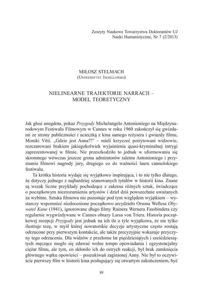 Zeszyty Naukowe Towarzystwa Doktorantów UJ Nauki Humanistyczne, Nr 7 (2/2013) MIŁOSZ STELMACH (Uniwersytet Jagielloński) NIELINEARNE TRAJEKTORIE NARRACJI – MODEL TEORETYCZNY Jak głosi anegdota, pokaz Przygody Michelangelo Antonioniego na Międzynarodowym Festiwalu Filmowym w Cannes w roku 1960 zakończył się gwizdami ze strony publiczności i ucieczką z kina samego reżysera i gwiazdy filmu, Moniki Vitti. „Gdzie jest Anna?!” – mieli krzyczeć poirytowani widzowie, rozczarowani brakiem jakiegokolwiek wyjaśnienia quasi-kryminalnej intrygi zaprezentowanej w filmie. Nie przeszkodziło to jednak w uformowaniu się skromnego wówczas jeszcze grona admiratorów talentu Antonioniego i przyznaniu filmowi nagrody jury, drugiego co do ważności lauru canneńskiego festiwalu. Ta krótka historia wydaje się wyjątkowo inspirująca, i to nie tylko dlatego, że dotyczy jednego z najbardziej szanowanych tytułów w historii kina. Znane są wszak liczne przykłady pochodzące z zakresu różnych sztuk, świadczące o początkowym niezrozumieniu artystów i dzieł dziś powszechnie uważanych za wybitne. Sztuka filmowa nie pozostaje pod tym względem wyjątkiem – wystarczy wspomnieć niedocenione początkowo arcydzieło Orsona Wellesa Obywatel Kane (1941), ignorowane długo filmy Rainera Wernera Fassbindera czy regularnie wygwizdywane w Cannes obrazy Larsa von Triera. Historia początkowej recepcji Przygody jest jednak na ich tle o tyle wyjątkowa, że nie tylko ilustruje tezę, w myśl której nowatorskie decyzje artystyczne często zostają odrzucone przy pierwszym kontakcie, ale także precyzyjnie wskazuje przyczyny tego odrzucenia. Dla widzów z przełomu lat pięćdziesiątych i sześćdziesiątych męczące mogło się zdawać wolne tempo opowiadania i egzystencjalny ciężar filmu, ale tym, co skłoniło ich do ostrych reakcji, był brak zamknięcia głównego wątku opowieści – poszukiwań zaginionej Anny. Nie był to oczywiście pierwszy film w historii kina posługujący się otwartym zakończeniem, być 89 Miłosz Stelmach może był jednak pierwszym, który robił to w sposób tak ostentacyjny, świadomie rozbudzając oczekiwania widza tylko po to, aby je zawieść. Choć oryginalność i pionierski charakter filmów włoskiego egzystencjalisty możemy tropić na różnych poziomach, to właśnie te cechy – niekonkluzywność opowieści i brak poszanowania dla jej przyczynowo-skutkowej logiki – czynią go patronem nowoczesnego sposobu opowiadania filmowych fabuł. Przez ponad pięćdziesiąt lat, które dzielą nas od premiery Przygody, głębokiemu przeobrażeniu uległo całe kino artystyczne oraz jego publiczność. Rozwiązania zaproponowane przez Antonioniego stały się nie tylko normą, ale w niektórych przypadkach wręcz cechą dystynktywną współczesnego arthouse’u. Nowy styl opowiadania został oswojony i rozpowszechniony, a alternatywna narracja kina artystycznego stała się również swego rodzaju konwencją, rozpoznawaną przez widzów i wykorzystywaną przez twórców. Opisanie tych nieklasycznych modeli narracji, które niegdyś budziły takie rozdrażnienie, a które bujnie rozwijają się w dzisiejszym kinie, będzie głównym celem w niniejszej pracy. Warto jednak na wstępie sprecyzować, co kryje się pod pojęciem „modeli narracji”. Poniższy wywód nie ma bowiem na celu całościowego opisu narracji kina artystycznego (jakby było to w ogóle możliwe), ale jedynie pewien jej aspekt, związany z konstrukcyjnym otwarciem, często spotykanym w dziełach modernistycznych. Za ramę teoretyczną tych rozważań posłuży koncepcja nielinearnej narracji sformułowana przez węgierskiego historyka filmu Andrása Bálinta Kovácsa w książce zatytułowanej Screening Modernism1. Podjął on w niej próbę zdefiniowania klasycznego schematu opowiadania oraz odstępstw od niego często dostrzegalnych w europejskim kinie artystycznym. Zanim jednak przejdę do omawiania propozycji teoretycznych Kovácsa, pokuszę się o kilka uwag wstępnych. Są one konieczne, bowiem niepisanym punktem wyjścia do wywodu węgierskiego filmoznawcy na temat narracji jest strukturalistycznie zorientowana francuska tradycja narratologiczna oraz do pewnego stopnia pokrewne im neoformalistyczne badania amerykańskich kognitywistów. To od nich węgierski filmoznawca przejął sposób patrzenia na dzieło narracyjne jako wariację na temat prostego schematu fabularnego, wspólnego na głębokim poziomie większości tekstów kultury zachodniej. OPOWIEŚĆ UNIWERSALNA Próbę ustalenia „kanonicznej” formuły dramaturgicznej dzieła narracyjnego podejmował już Arystoteles w swojej Poetyce, ale decydujące w tej dziedzinie okazały się dopiero dwudziestowieczne poszukiwania strukturalistów, szczeA. B. Kovacs, Screening Modernism. European Art Cinema 1950–1980, Chicago and London 2007. 1 90 Nielinearne trajektorie narracji... gólnie żywe w latach sześćdziesiątych XX wieku. Były one inspirowane w dużej mierze wcześniejszymi o kilka dekad pracami Władimira Proppa. Rosyjski literaturoznawca, badając bajki magiczne z różnych rejonów świata, stwierdził, że ich fabuły można sprowadzić do najbardziej ogólnego wzorca rozwoju, jakim jest sekwencja: zakłócenie porządku – zmagania – przywrócenie porządku2. Teorię tę, przefiltrowaną także przez klasyczne reguły poetyki, rozwijali dość intensywnie francuscy literaturoznawcy badający tak zwaną gramatykę dzieła literackiego, tacy jak Roland Barthes czy Algirdas Gremais3. Ustalenia Proppa oraz jego metodologicznych i intelektualnych spadkobierców opierały się na badaniu licznych przykładów z dziedziny literatury, tym samym pozostając w kręgu analiz tekstualnych. Potwierdził je jednak także David Bordwell, który przystąpił do problemu z innej pozycji badawczej, czyli teorii odbioru dzieła wywodzącej się bezpośrednio z tradycji badań psychologii poznawczej. Amerykański kogni