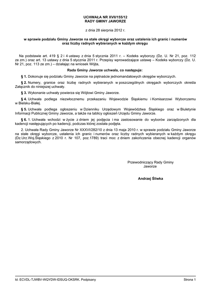 UCHWAŁA NR XVII/155/12 RADY GMINY JAWORZE z dnia 28 sierpnia 2012 r. w sprawie podziału Gminy Jaworze na stałe okręgi wyborcze oraz ustalenia ich granic i numerów oraz liczby radnych wybieranych w każdym okręgu Na podstawie art. 419 § 2 i 4 ustawy z dnia 5 stycznia 2011 r. – Kodeks wyborczy (Dz. U. Nr 21, poz. 112 ze zm.) oraz art. 13 ustawy z dnia 5 stycznia 2011 r. Przepisy wprowadzające ustawę – Kodeks wyborczy (Dz. U. Nr 21, poz. 113 ze zm.) – działając na wniosek Wójta, Rada Gminy Jaworze uchwala, co następuje: § 1. Dokonuje się podziału Gminy Jaworze na piętnaście jednomandatowych okręgów wyborczych. § 2. Numery, granice oraz liczbę radnych wybieranych w poszczególnych okręgach wyborczych określa Załącznik do niniejszej uchwały. § 3. Wykonanie uchwały powierza się Wójtowi Gminy Jaworze. § 4. Uchwała podlega niezwłocznemu przekazaniu Wojewodzie Śląskiemu i Komisarzowi Wyborczemu w Bielsku-Białej. § 5. Uchwała podlega ogłoszeniu w Dzienniku Urzędowym Województwa Śląskiego oraz w Biuletynie Informacji Publicznej Gminy Jaworze, a także na tablicy ogłoszeń Urzędu Gminy Jaworze. § 6. 1. Uchwała wchodzi w życie z dniem jej podjęcia i ma zastosowanie do wyborów zarządzonych dla kadencji następujących po kadencji, podczas której została podjęta. 2. Uchwała Rady Gminy Jaworze Nr XXXVI/282/10 z dnia 13 maja 2010 r. w sprawie podziału Gminy Jaworze na stałe okręgi wyborcze, ustalenia ich granic i numerów oraz liczby radnych wybieranych w każdym okręgu (Dz.Urz.Woj.Śląskiego z 2010 r. Nr 107, poz.1789) traci moc z dniem zakończenia obecnej kadencji organów samorządowych. Przewodniczący Rady Gminy Jaworze Andrzej Śliwka Id: ECVDL-TJWBV-WQYDW-IDSUQ-OKSRK. Podpisany Strona 1 Załącznik do Uchwały Nr XVII/155/12 Rady Gminy Jaworze z dnia 28 sierpnia 2012 r. Nr okręgu Granice okręgów wyborczych Liczba mandatów 1 2 3 1 ulica: Cisowa do Rodzinnej, Górecka, Grabka, Jasna, Jeżynowa, Mała, Myśliwska, Pogodna, Rodzinna, Złocista. 1 2 ulica: Cisowa część od Rodzinnej do Jasienickiej, Jarzębinowa, Jodłowa, Maków, Słoneczna część od Cisowej do Turystycznej, Smrekowa, Wrzosowa. 1 3 ulica: Akacjowa, Brzoskwiniowa, Liliowa, Modrzewiowa, Słoneczna część od Turystycznej do Zdrojowej, Stokrotek, Za Goruszką. 1 4 ulica: Bławatkowa, Bratków, Brzozowa, Bukowa, Jaśminowa, Jaworowa, Nagietkowa, Orzechowa, Pod Brzegiem, Pod Lasem, Schowana, Turystyczna, Zawilcowa. 1 5 ulica: Azaliowa, Chabrowa, Kaczeńcowa, Kwiatowa, Motylkowa, Pelchrim, Poziomkowa, Promienista, Różana, Tulipanowa, Widok, Wiosenna, Wypoczynkowa, Zielona. 1 6 ulica: Cieszyńska bloki. 1 7 ulica: Aleja Kościelna, Lecznicza, Nadbrzeżna, Pałacowa, Plac Kościelny, Pod Harendą, Pod Młyńską Kępą, Spacerowa, Szkolna, Zdrojowa część od Wapienickiej do Nadbrzeżnej. 1 8 ulica: Cieszyńska bez bloków, Folwarczna, Jasienicka, Nad Polami, Skowronków, Zaciszna, Zdrojowa część od Bielskiej do Nadbrzeżnej. 1 9 ulica: Borsucza, Cicha, Jałowcowa, Jaskółcza, Kalinowa, Kalwaria, Letniskowa, Panoramiczna, Podgórska część od Zdrojowej do Kalwarii, Słowicza, Sosnowa, Wapienicka część od Zdrojowej do Koralowej, Wąwóz, Zajęcza, Zdrojowa część od Wapienickiej do Podgórskiej. 1 10 ulica: Aksamitna, Bielska część od Cieszyńskiej do Lipowej, Cedrowa, Cyprysowa, Dawny Trakt, Dębowa, Kryształowa, Lipowa, Łubinowa, Miętowa, Niecała, Sielska, Słonecznikowa, Wiejska, Zagajnikowa. 1 11 ulica: Kaszyska, Krokusowa, Krótka, Łukowa, Malinowa, Morelowa, Pierwiosnków, Pod Palenicą, Podgórska część od Rumiankowej do Świerkowej, Relaksowa, Romantyczna, Rumiankowa, Storczyków, Świerkowa, Wapienicka część od Świerkowej do Storczyków, Willowa, Wiśniowa, Zagrodowa, Żurawinowa. 1 12 ulica: Astrów, Boczna, Graniczna, Irysów, Kolonia Dolna część od Średniej do Bocznej, Magnolii, Malwowa, Miodowa, Nad Rudawką, Pagórkowa część od Średniej do Koloni Dolnej, Piękna, Pszczela, Średnia część od Koloni Dolnej do Wapienickiej, Ustronna, Wschodnia, Zielna. 1 13 ulica: Bażantów, Kolonia Dolna część od Bocznej do Pagórkowej, Kolonia Górna, Koralowa, Ogrodowa, Pagórkowa część od Koloni Dolnej do Sielskiej. Poprzeczna, Spadzista, Stroma, Ukryta, Wczasowa, Zdrowotna. 1 14 ulica: Górska, Klonowa, Konwaliowa, Lawendowa, Legendarna, Leszczynowa, Ładna, Morwowa, Na Stoku, Narcyzowa, Niewielka, Podgórska część od Świerkowej do Kalwarii, Południowa, Sarnia, Topolowa, Wapienicka część od Koralowej do Świerkowej, Zimowa. 1 15 ulica: Agrestowa, Bielska część od Średniej do Polnej, Dziewanny, Dzwonkowa, Głogowa, Grabowa, Groszkowa, Jesionowa, Kasztanowa, Olszynowa, Polna, Średnia część od Bielskiej do Koloni Dolnej, Wierzbowa, Zbożowa. 1 Id: ECVDL-TJWBV-WQYDW-IDSUQ-OKSRK. Podpisany Strona 1 Przewodniczący Rady Gminy Jaworze Andrzej Śliwka Id: ECVDL-TJWBV-WQYDW-IDSUQ-OKSRK. Podpisany Strona 2