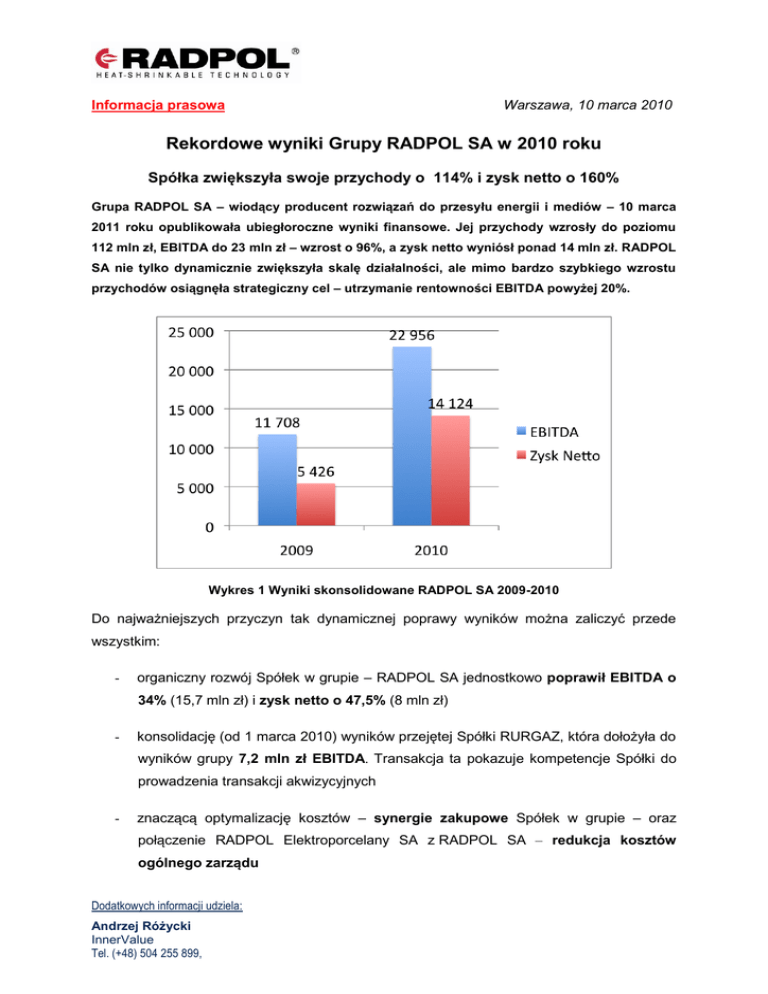 Informacja prasowa Warszawa, 10 marca 2010 Rekordowe wyniki Grupy RADPOL SA w 2010 roku Spółka zwiększyła swoje przychody o 114% i zysk netto o 160% Grupa RADPOL SA – wiodący producent rozwiązań do przesyłu energii i mediów – 10 marca 2011 roku opublikowała ubiegłoroczne wyniki finansowe. Jej przychody wzrosły do poziomu 112 mln zł, EBITDA do 23 mln zł – wzrost o 96%, a zysk netto wyniósł ponad 14 mln zł. RADPOL SA nie tylko dynamicznie zwiększyła skalę działalności, ale mimo bardzo szybkiego wzrostu przychodów osiągnęła strategiczny cel – utrzymanie rentowności EBITDA powyżej 20%. Wykres 1 Wyniki skonsolidowane RADPOL SA 2009-2010 Do najważniejszych przyczyn tak dynamicznej poprawy wyników można zaliczyć przede wszystkim: - organiczny rozwój Spółek w grupie – RADPOL SA jednostkowo poprawił EBITDA o 34% (15,7 mln zł) i zysk netto o 47,5% (8 mln zł) - konsolidację (od 1 marca 2010) wyników przejętej Spółki RURGAZ, która dołożyła do wyników grupy 7,2 mln zł EBITDA. Transakcja ta pokazuje kompetencje Spółki do prowadzenia transakcji akwizycyjnych - znaczącą optymalizację kosztów – synergie zakupowe Spółek w grupie – oraz połączenie RADPOL Elektroporcelany SA z RADPOL SA – redukcja kosztów ogólnego zarządu Dodatkowych informacji udziela: Andrzej Różycki InnerValue Tel. (+48) 504 255 899, - dalszy wzrost znaczenia sprzedaży eksportowej (w szczególności do Niemiec, Austrii, Włoch i Białorusi) generującej wyższe marże niż sprzedaż krajowa. Jednostkowa rentowność Spółki RADPOL SA na poziomie EBITDA wyniosła 26% (vs 22% w 2009) RADPOL SA w 2010 roku ponad dwukrotnie zwiększył skalę prowadzonych operacji bez uszczerbku dla rentowności. Grupa skupia się na rozwoju sprzedaży na najbardziej perspektywicznych rynkach ciepłownictwa, gazownictwa i energetyki zawodowej. Tu kluczowa dla Spółki jest sprzedaż projektowa dedykowanych rozwiązań – generująca znacznie wyższą rentowność. Wykres 2 Skonsolidowane przychody RADPOL SA 2009-2010 Komentarz Zarządu: „Wyniki 2010 pozwoliły na pełne pokazanie potencjału Spółki. Bardzo dobra decyzja – co udowodniliśmy tegorocznymi wynikami – o zakupie udziałów w RURGAZie w połączeniu z poprawiającą się koniunkturą na kluczowych dla Spółki rynkach pozwoliła na dynamiczny wzrost sprzedaży i wyników. Mogliśmy sprzedać znacznie więcej. Jednak naszym celem jest przede wszystkim maksymalizacja wyników finansowych i ochrona marży. Nie chcemy zdobywać rynku ceną. RADPOL stał się rozpoznawalną marką na zachodzie Europy. Żmudna praca nad sprzedażą eksportową zaczyna przynosić efekty i wierzę, że 2011 rok będzie dla nas rokiem eksportu. Jeśli rodzima energetyka ruszy z inwestycjami to i w przyszłym roku będziemy dumni nie tylko z wyników, lecz również z dynamiki ich wzrostu.“ – powiedział Andrzej Sielski, Prezes Zarządu RADPOL SA. Dodatkowych informacji udziela: Andrzej Różycki InnerValue Tel. (+48) 504 255 899, Informacje o firmie: RADPOL SA jest liderem na rynku wyrobów termokurczliwych. Produkty RADPOL SA znajdują zastosowanie przede wszystkim w energetyce, elektronice, AGD, telekomunikacji, branży ciepłowniczej i motoryzacyjnej. Firma – jako jedyna w Polsce – posiada akceleratory elektronowe wykorzystywane na skalę przemysłową o energii 2,5 MeV i 4,5 MeV stosowane w technologii sieciowania radiacyjnego do produkcji wyrobów termokurczliwych. Spółka RADPOL prowadzi działalność produkcyjną w oparciu o wymagania normy ISO 9001:2008. Od roku 2005 firma posiada certyfikat ISO 14001:2004 dotyczący zagadnień związanych z ochroną środowiska naturalnego. RADPOL prowadzi ewidencję odpadów produkcyjnych, a także zawarł umowę z Organizacją Odzysku Biosystem Kraków w celu zapewnienia wymaganego poziomu recyklingu. Wysoka jakość produktów firmy RADPOL potwierdzona jest prestiżowymi nagrodami. W lutym 2008 roku RADPOL otrzymał m.in. główną nagrodę Ministerstwa Gospodarki w konkursie na „Najlepiej rozwijającą się firmę w sektorze Małych i Średnich Przedsiębiorstw”. Spółka otrzymała również specjalne wyróżnienie za tworzenie nowych miejsc pracy. W tym samym roku RADPOL odebrał nagrodę Pomorskiego Lidera Innowacji 2007 oraz Gazelę Biznesu 2007. Wśród nagród zdobytych przez spółkę w 2005 roku znajdują się: Certyfikat Rozważna Firma, Gazele Biznesu, Rzetelny Partner Biznesowy. W roku 2004 RADPOL został zaliczony do najprężniej rozwijających się przedsiębiorstw w Polsce w rankingu Gazel Biznesu oraz otrzymał nagrodę Hit Pomorza w kategorii produkcja - za gamę wyrobów termokurczliwych z usieciowanego radiacyjnie polietylenu. www.radpol.com.pl Dodatkowych informacji udziela: Andrzej Różycki InnerValue Tel. (+48) 504 255 899,