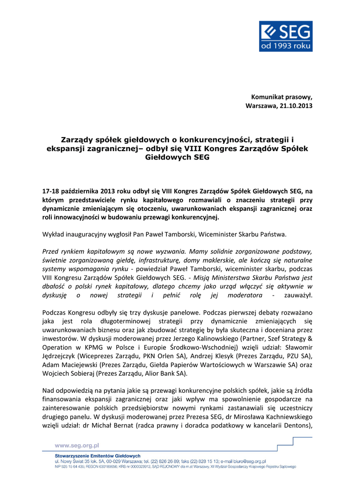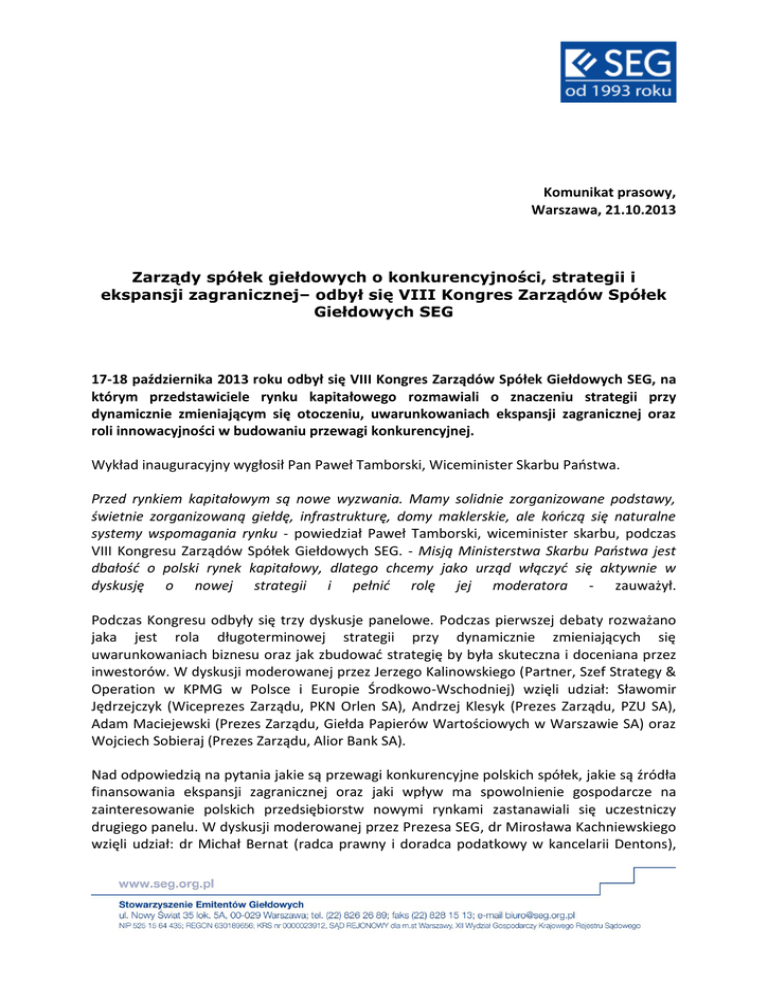Komunikat prasowy, Warszawa, 21.10.2013 Zarządy spółek giełdowych o konkurencyjności, strategii i ekspansji zagranicznej– odbył się VIII Kongres Zarządów Spółek Giełdowych SEG 17-18 października 2013 roku odbył się VIII Kongres Zarządów Spółek Giełdowych SEG, na którym przedstawiciele rynku kapitałowego rozmawiali o znaczeniu strategii przy dynamicznie zmieniającym się otoczeniu, uwarunkowaniach ekspansji zagranicznej oraz roli innowacyjności w budowaniu przewagi konkurencyjnej. Wykład inauguracyjny wygłosił Pan Paweł Tamborski, Wiceminister Skarbu Państwa. Przed rynkiem kapitałowym są nowe wyzwania. Mamy solidnie zorganizowane podstawy, świetnie zorganizowaną giełdę, infrastrukturę, domy maklerskie, ale kończą się naturalne systemy wspomagania rynku - powiedział Paweł Tamborski, wiceminister skarbu, podczas VIII Kongresu Zarządów Spółek Giełdowych SEG. - Misją Ministerstwa Skarbu Państwa jest dbałość o polski rynek kapitałowy, dlatego chcemy jako urząd włączyć się aktywnie w dyskusję o nowej strategii i pełnić rolę jej moderatora - zauważył. Podczas Kongresu odbyły się trzy dyskusje panelowe. Podczas pierwszej debaty rozważano jaka jest rola długoterminowej strategii przy dynamicznie zmieniających się uwarunkowaniach biznesu oraz jak zbudować strategię by była skuteczna i doceniana przez inwestorów. W dyskusji moderowanej przez Jerzego Kalinowskiego (Partner, Szef Strategy & Operation w KPMG w Polsce i Europie Środkowo-Wschodniej) wzięli udział: Sławomir Jędrzejczyk (Wiceprezes Zarządu, PKN Orlen SA), Andrzej Klesyk (Prezes Zarządu, PZU SA), Adam Maciejewski (Prezes Zarządu, Giełda Papierów Wartościowych w Warszawie SA) oraz Wojciech Sobieraj (Prezes Zarządu, Alior Bank SA). Nad odpowiedzią na pytania jakie są przewagi konkurencyjne polskich spółek, jakie są źródła finansowania ekspansji zagranicznej oraz jaki wpływ ma spowolnienie gospodarcze na zainteresowanie polskich przedsiębiorstw nowymi rynkami zastanawiali się uczestniczy drugiego panelu. W dyskusji moderowanej przez Prezesa SEG, dr Mirosława Kachniewskiego wzięli udział: dr Michał Bernat (radca prawny i doradca podatkowy w kancelarii Dentons), Rafał Brzoska (Prezes Zarządu, Grupa Integer.pl SA), Jacek Murawski (Wiceprezes Zarządu, Polskie Górnictwo Naftowe i Gazownictwo SA), Piotr Szeliga (Prezes Zarządu, Boryszew SA), Alina Wołoszyn (Dyrektor Wykonawczy, Szef Zespołu Finansowania w KPMG w Polsce). Cześć merytoryczną pierwszego dnia Kongresu zakończyła debata moderowana przez Jakuba Kurasza (Były Redaktor Naczelny Gazety Giełdy Parkiet, Były Wiceredaktor Naczelny Rzeczpospolitej) na temat konkurencyjności przez innowacyjność. Zaproszeni do rozmowy przedstawiciele czołowych spółek giełdowych rozważali czy innowacyjność jest kluczowym czynnikiem podnoszenia konkurencyjności, jak redefiniuje się struktura rynku wskutek zmian technologicznych oraz czy zmieniające się preferencje nabywców są szansą, czy zagrożeniem dla polskim przedsiębiorstw. W debacie wzięli udział: Bartosz Drabikowski (Wiceprezes Zarządu, PKO BP SA), Piotr Jeleński (Prezes Zarządu, Asseco South Eastern Europe SA), Małgorzata Gawrysiak (Dyrektor Rozwoju Rynku, NextiraOne Polska & Central Europe), Zenon Pokojski (Grupa Azoty), Jarosław Zagórowski (Prezes Zarządu, Jastrzębska Spółka Węglowa SA). Podczas Kongresu odbyła się gala jubileuszowa z okazji 20-lecia działalności Stowarzyszenia Emitentów Giełdowych, na której uhonorowano wszystkich dotychczasowych Prezesów SEG oraz zaprezentowano film o początkach działalności Stowarzyszenia. Tegoroczny Kongres Zarządów był wydarzeniem szczególnym, ze względu na obchody 20lecia SEG, ale była to także tradycyjna już okazja do spotkania zarządów spółek giełdowych i omówienia zarówno bieżącej sytuacji gospodarczej oraz zagadnień nurtujących emitentów. Chciałbym bardzo podkreślić, że przez ostatnie 20 lat Stowarzyszenie miało wyjątkowe szczęście do wybitnych ludzi, którzy z sercem i pełnym zaangażowaniem pracowali nad budową i rozwojem polskiego rynku kapitałowego. SEG nie istniałoby i nie mogłoby się rozwijać gdyby nie spółki członkowskie, które zawsze są otwarte na współpracę merytoryczną i wsparcie Stowarzyszenia. Kongres był okazją do podsumowania tych 20-lat pracy i podziękowania wielu osobom bez których SEG nie byłby tak silną i efektywną organizacją jaką jest dzisiaj - mówi Bartosz Drabikowski, Przewodniczący Rady Nadzorczej SEG, Wiceprezes Zarządu, PKO BP SA. Na kongresie odbył się IV Charytatywny Bieg Rynku Kapitałowego, którego uczestnicy zbierali środki na edukację ekonomiczną młodzieży w ramach programu „Zarządzanie firmą”, prowadzonego przez Fundację Młodzieżowej Przedsiębiorczości. Uczestnicy przebiegli łącznie 230 osobokilometrów, dzięki czemu w programie będzie mogło uczestniczyć prawie 5000 tysięcy uczniów. Partnerem Biegu była spółka PZU SA. Drugiego dnia odbyły się spotkania warsztatowe, na których omawiano takie tematy jak: prognozy finansowe, narzędzia zarządzania ryzykiem odpowiedzialności kadry menadżerskiej, optymalizacja procesów podejmowania decyzji zarządu, kontrakty menadżerskie, relacje między zarządem a radą nadzorczą, wrogie przejęcia spółek kapitałowych, warsztat medialny menadżera. „W tym roku mieliśmy przyjemność gościć na Kongresie ponad 200 osób reprezentujących emitentów i inne instytucje rynku kapitałowego. Czekające nas zmiany legislacyjne oraz zmiany otoczenia gospodarczego mogą przynieść dla spółek giełdowych wiele wyzwań i zagrożeń, o których dyskutowali uczestnicy kongresu podczas debat i rozmów kuluarowych ” – mówi dr Mirosław Kachniewski, Prezes Stowarzyszenia Emitentów Giełdowych Patronat Honorowy nad Kongresem objęło Ministerstwo Skarbu Państwa w ramach programu Akcjonariat Obywatelsk