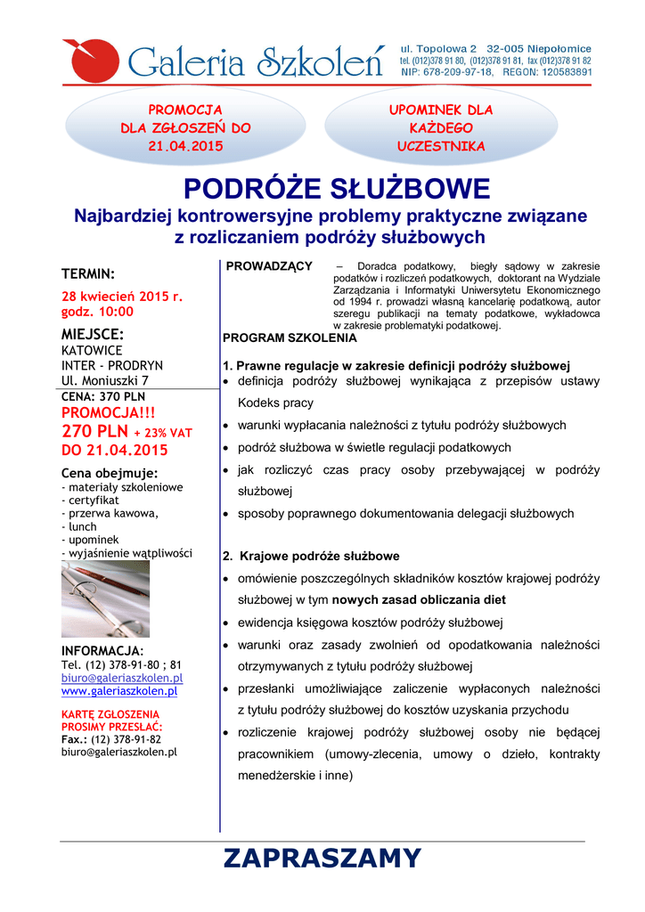 PROMOCJA DLA ZGŁOSZEŃ DO 21.04.2015 UPOMINEK DLA KAŻDEGO UCZESTNIKA PODRÓŻE SŁUŻBOWE Najbardziej kontrowersyjne problemy praktyczne związane z rozliczaniem podróży służbowych PROWADZĄCY TERMIN: 28 kwiecień 2015 r. godz. 10:00 – Doradca podatkowy, biegły sądowy w zakresie podatków i rozliczeń podatkowych, doktorant na Wydziale Zarządzania i Informatyki Uniwersytetu Ekonomicznego od 1994 r. prowadzi własną kancelarię podatkową, autor szeregu publikacji na tematy podatkowe, wykładowca w zakresie problematyki podatkowej. MIEJSCE: PROGRAM SZKOLENIA KATOWICE INTER - PRODRYN Ul. Moniuszki 7 1. Prawne regulacje w zakresie definicji podróży służbowej definicja podróży służbowej wynikająca z przepisów ustawy CENA: 370 PLN PROMOCJA!!! 270 PLN + 23% VAT Kodeks pracy warunki wypłacania należności z tytułu podróży służbowych DO 21.04.2015 podróż służbowa w świetle regulacji podatkowych Cena obejmuje: jak rozliczyć czas pracy osoby przebywającej w podróży - materiały szkoleniowe - certyfikat - przerwa kawowa, - lunch - upominek - wyjaśnienie wątpliwości służbowej sposoby poprawnego dokumentowania delegacji służbowych 2. Krajowe podróże służbowe omówienie poszczególnych składników kosztów krajowej podróży służbowej w tym nowych zasad obliczania diet ewidencja księgowa kosztów podróży służbowej INFORMACJA: Tel. (12) 378-91-80 ; 81 [email protected] www.galeriaszkolen.pl KARTĘ ZGŁOSZENIA PROSIMY PRZESŁAĆ: Fax.: (12) 378-91-82 [email protected] warunki oraz zasady zwolnień od opodatkowania należności otrzymywanych z tytułu podróży służbowej przesłanki umożliwiające zaliczenie wypłaconych należności z tytułu podróży służbowej do kosztów uzyskania przychodu rozliczenie krajowej podróży służbowej osoby nie będącej pracownikiem (umowy-zlecenia, umowy o dzieło, kontrakty menedżerskie i inne) ZAPRASZAMY 3. Zagraniczne podróże służbowe omówienie poszczególnych składników kosztów zagranicznej podróży służbowej zasady rozliczania oraz dokumentowania zagranicznej podróży służbowej w świetle aktualnych przepisów rozporządzenia Ministra Pracy i Polityki Społecznej 4. Rozliczenie kosztów krajowych i zagranicznych podróży służbowych w aspekcie ustawy o podatku od towarów i usług 5. Pozostałe zagadnienia używanie przez pracowników, zleceniobiorców, menedżerów, członków zarządu, członków rad nadzorczych samochodów niestanowiących własności pracodawcy w jazdach miejscowych i podróżach służbowych podróż służbowa odbywana samochodem stanowiącym własność pracodawcy wykorzystywanie samochodów służbowych do prywatnych celów pracowników 6.Analiza porównawcza regulacji prawnych związanych z odbywaniem krajowych i zagranicznych podróży służbowych wprowadzanych przepisami rozporządzenia MPiPS 29.01.2013r. na obowiązujących bazie do rozporządzeń 28 z dnia delegacyjnych lutego 2013r. 7.Najbardziej kontrowersyjne problemy praktyczne związane z rozliczaniem podróży służbowych jak prawidłowo określić miejscowość rozpoczęcia i zakończenia krajowej podróży służbowej kiedy rozpoczyna się podróż służbowa pracownika mobilnego czy pracodawca może określić miejscowość i zakończenia zagranicznej podróży służbowej rozpoczęcia jak liczyć czas trwania podróży zagranicznej w przypadku gdy jest ona odbywana w połączeniu z przejazdem na obszarze kraju czy wyjazd pracownika administracyjnego na międzyzakładowe zawody sportowe jest podróżą służbową czy pracownicy kierujący pojazdem samochodowym w ramach przejazdu w podróży służbowej powinni mieć przeprowadzone badania psychologiczne czy koszty przejazdu w podróży samochodem osobowym niebędącym własnością pracodawcy takie jak uiszczone opłaty za przejazd drogami płatnymi i autostradami, postój w strefie płatnego parkowania, miejsca parkingowe winny być rozliczane w ramach ewidencji przebiegu pojazdu czy brak dowodów np. biletów na przejazd w podróży służbowej uprawnia pracodawcę do odmowy zwrotu poniesionych przez pracownika z tego tytułu wydatków czy pracownikowi należy „zapewnić” kwotę odpowiadającą cenie biletu określonego przez pracodawcę środka transportu w przypadku gdy w rzeczywistości przejazd odbył się za „symboliczną złotówkę” lub bez konieczności poniesienia wydatków (np. przejazd z osobą trzecią) czy wartość należnej diety winna być pomniejszona o koszt faktycznie poniesionych wydatków na wyżywienie jaką podstawę należy przyjąć dla obliczenia kwoty odpowiadającej proporcjonalnemu zmniejszeniu należnej diety przy krótkich delegacjach służbowych czy pracodawca może wyciągnąć konsekwencje służbowe w związku z niedokonaniem przez pracownika rozliczenia kosztów podróży służbowej w terminie 14 dni od jej zakończenia jak obliczyć kwotę diety w podróży zagranicznej w przypadku ustalenia przez pracodawcę więcej niż jednego państwa docelowego zasady przeliczania na złote kosztów poniesionych w związku z odbytą zagraniczną podróżą służbową; zasady rozliczeń na gruncie pracodawca-pracownik oraz zasady rozliczeń dla potrzeb podatkowych i bilansowych 8.Odpowiedzi na indywidualne pytania uczestników szkolenia Powyższy temat możemy również zrealizować w formie szkolenia zamkniętego