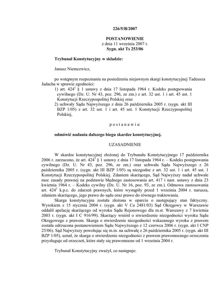 226/5/B/2007 POSTANOWIENIE z dnia 11 września 2007 r. Sygn. akt Ts 253/06 Trybunał Konstytucyjny w składzie: Janusz Niemcewicz, po wstępnym rozpoznaniu na posiedzeniu niejawnym skargi konstytucyjnej Tadeusza Jadacha w sprawie zgodności: 1) art. 4241 § 1 ustawy z dnia 17 listopada 1964 r. Kodeks postępowania cywilnego (Dz. U. Nr 43, poz. 296, ze zm.) z art. 32 ust. 1 i art. 45 ust. 1 Konstytucji Rzeczypospolitej Polskiej oraz 2) uchwały Sądu Najwyższego z dnia 26 października 2005 r. (sygn. akt III BZP 1/05) z art. 32 ust. 1 i art. 45 ust. 1 Konstytucji Rzeczypospolitej Polskiej, p o s t a n a w i a: odmówić nadania dalszego biegu skardze konstytucyjnej. UZASADNIENIE W skardze konstytucyjnej złożonej do Trybunału Konstytucyjnego 17 października 2006 r. zarzucono, że art. 4241 § 1 ustawy z dnia 17 listopada 1964 r. – Kodeks postępowania cywilnego (Dz. U. Nr 43, poz. 296, ze zm.) oraz uchwała Sądu Najwyższego z 26 października 2005 r. (sygn. akt III BZP 1/05) są niezgodne z art. 32 ust. 1 i art. 45 ust. 1 Konstytucji Rzeczypospolitej Polskiej. Zdaniem skarżącego, Sąd Najwyższy nadał uchwale moc zasady prawnej na podstawie błędnego zastosowania art. 417 i nast. ustawy z dnia 23 kwietnia 1964 r. – Kodeks cywilny (Dz. U. Nr 16, poz. 93, ze zm.). Odmowa zastosowania art. 4241 k.p.c. do zdarzeń prawnych, które wystąpiły przed 1 września 2004 r. narusza, zdaniem skarżącego, jego prawo do sądu oraz prawo do równego traktowania. Skarga konstytucyjna została złożona w oparciu o następujący stan faktyczny. Wyrokiem z 15 stycznia 2004 r. (sygn. akt V Ca 2481/03) Sąd Okręgowy w Warszawie oddalił apelację skarżącego od wyroku Sądu Rejonowego dla m.st. Warszawy z 7 kwietnia 2003 r. (sygn. akt I C 916/99). Skarżący wniósł o stwierdzenie niezgodności wyroku Sądu Okręgowego z prawem. Skarga o stwierdzenie niezgodności wskazanego wyroku z prawem została odrzucona postanowieniem Sądu Najwyższego z 12 czerwca 2006 r. (sygn. akt I CNP 25/06). Sąd Najwyższy powołując się m.in. na uchwałę z 26 października 2005 r. (sygn. akt III BZP 1/05), uznał, że skarga o stwierdzenie niezgodności z prawem prawomocnego orzeczenia przysługuje od orzeczeń, które stały się prawomocne od 1 września 2004 r. Trybunał Konstytucyjny zważył, co następuje: Zgodnie z art. 79 ust. 1 Konstytucji przedmiotem skargi konstytucyjnej może być wyłącznie zarzut niezgodności przepisu ustawy lub innego aktu normatywnego z Konstytucją. Skarżący żąda tymczasem zbadania zgodności z Konstytucją uchwały Sądu Najwyższego, która nie jest aktem normatywnym w rozumieniu art. 79 ust. 1 Konstytucji. Tak określony przedmiot skargi konstytucyjnej wykracza poza zakres właściwości Trybunału Konstytucyjnego wynikającej z art. 79 ust. 1 i art. 188 Konstytucji. Pogląd ten był już wielokrotnie wyrażany przez Trybunał Konstytucyjny m.in. w postanowieniu z 21 czerwca 1999 r. (Ts 56/99, OTK ZU nr 6/1999, poz. 143). Trybunał wyraźnie zaznaczył wówczas, że „przedmiotem badania Trybunału Konstytucyjnego przy rozpoznawaniu skargi konstytucyjnej nie są akty stosowania prawa, a więc prawomocne orzeczenia lub ostateczne decyzje zapadłe w indywidualnych sprawach, lecz wyłącznie akty normatywne na podstawie których rozstrzygnięcia te zostały wydane”. Niedopuszczalne jest też rozpoznanie skargi konstytucyjnej w zakresie zgodności art. 1 424 § 1 k.p.c. z art. 32 ust. 1 i art. 45 ust. 1 Konstytucji. W myśl art. 79 ust. 1 Konstytucji skarga konstytucyjna jest szczególnym środkiem prawnym. W trybie skargi można podnieść zarzut niekonstytucyjności aktu normatywnego, o ile zaskarżony akt lub jego część stanowi źródło naruszenia konstytucyjnych wolności lub praw skarżącego. Z sytuacją taką mamy do czynienia wtedy, gdy normatywna treść zaskarżonych przepisów jest prawnie relewantna do stawianych zarzutów. W niniejszej sprawie skarżący naruszenia swych konstytucyjnych praw upatruje w ograniczeniu prawa do złożenia skargi o stwierdzenie niezgodności z prawem prawomocnego orzeczenia sądu. Należy jednak podkreślić, że zaskarżony przepis nie zawiera żadnej normy intertemporalnej, w szczególności nie wynika z niego ograniczenie zakresu czasowego prawa do złożenia skargi. Wskazuje na to wprost Sąd Najwyższy w przywoływanej wyżej uchwale. Zdaniem Sądu Najwyższego zakres zastosowania art. 4241 § 1 k.p.c. wyznaczony jest przede wszystkim przez art. 5 ustawy z dnia 17 czerwca 2004 r. o zmianie ustawy Kodeks cywilny oraz niektórych innych ustaw (Dz. U. Nr 162, poz. 1692). Przepis ten nie jest jednak przedmiotem skargi konstytucyjnej. Z powyższego wynika, że treść normatywna zaskarżonego przepisu nie pozostaje w związku ze stawianym przez skarżącego zarzutem, nie może tym samym stanowić źródła naruszenia jego konstytucyjnych praw. Na marginesie należy jedynie wskazać, że ewentualne stwierdzenie niekonstytucyjności art. 4241 § 1 k.p.c. i będące jego skutkiem uchylenie tego przepisu, nie doprowadziłoby do zmiany sytuacji skarżącego, wyeliminowałoby natomiast z systemu prawa instytucję skargi o stwierdzenie niezgodności z prawem prawomocnego orzeczenia. Brak wskazania sposobu naruszenia przez zaskarżony przepis ustawy konstytucyjnych praw skarżącego skutkuje, w myśl art. 47 ust. 1 pkt 2 ustawy o Trybunale Konstytucyjnym, odmową nadania skardze konstytucyjnej dalszego biegu. Mając powyższe na względzie, należało orzec jak w sentencji.