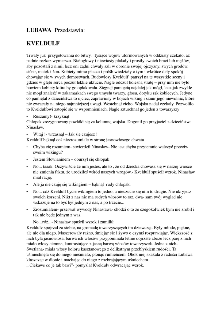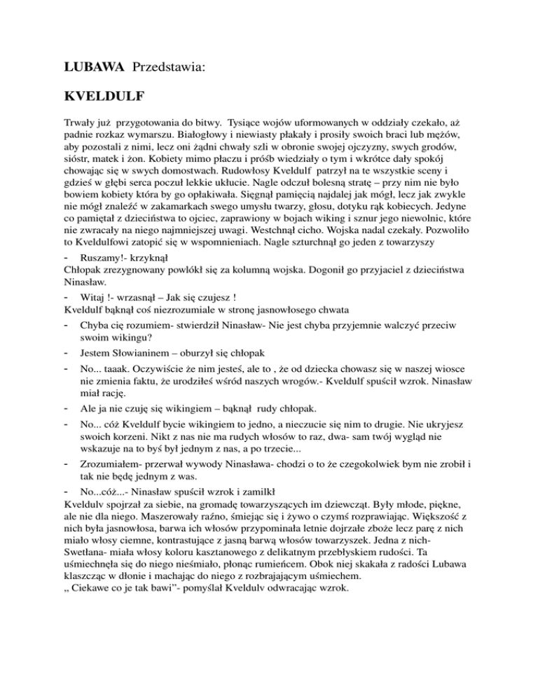 LUBAWA Przedstawia: KVELDULF Trwały już przygotowania do bitwy. Tysiące wojów uformowanych w oddziały czekało, aż padnie rozkaz wymarszu. Białogłowy i niewiasty płakały i prosiły swoich braci lub mężów, aby pozostali z nimi, lecz oni żądni chwały szli w obronie swojej ojczyzny, swych grodów, sióstr, matek i żon. Kobiety mimo płaczu i próśb wiedziały o tym i wkrótce dały spokój chowając się w swych domostwach. Rudowłosy Kveldulf patrzył na te wszystkie sceny i gdzieś w głębi serca poczuł lekkie ukłucie. Nagle odczuł bolesną stratę – przy nim nie było bowiem kobiety która by go opłakiwała. Sięgnął pamięcią najdalej jak mógł, lecz jak zwykle nie mógł znaleźć w zakamarkach swego umysłu twarzy, głosu, dotyku rąk kobiecych. Jedyne co pamiętał z dzieciństwa to ojciec, zaprawiony w bojach wiking i sznur jego niewolnic, które nie zwracały na niego najmniejszej uwagi. Westchnął cicho. Wojska nadal czekały. Pozwoliło to Kveldulfowi zatopić się w wspomnieniach. Nagle szturchnął go jeden z towarzyszy - Ruszamy! krzyknął Chłopak zrezygnowany powlókł się za kolumną wojska. Dogonił go przyjaciel z dzieciństwa Ninasław. - Witaj ! wrzasnął – Jak się czujesz ! Kveldulf bąknął coś niezrozumiale w stronę jasnowłosego chwata - Chyba cię rozumiem stwierdził Ninasław Nie jest chyba przyjemnie walczyć przeciw swoim wikingu? - Jestem Słowianinem – oburzył się chłopak - No... taaak. Oczywiście że nim jesteś, ale to , że od dziecka chowasz się w naszej wiosce nie zmienia faktu, że urodziłeś wśród naszych wrogów. Kveldulf spuścił wzrok. Ninasław miał rację. - Ale ja nie czuję się wikingiem – bąknął rudy chłopak. - No... cóż Kveldulf bycie wikingiem to jedno, a nieczucie się nim to drugie. Nie ukryjesz swoich korzeni. Nikt z nas nie ma rudych włosów to raz, dwa sam twój wygląd nie wskazuje na to byś był jednym z nas, a po trzecie... - Zrozumiałem przerwał wywody Ninasława chodzi o to że czegokolwiek bym nie zrobił i tak nie będę jednym z was. - No...cóż... Ninasław spuścił wzrok i zamilkł Kveldulv spojrzał za siebie, na gromadę towarzyszących im dziewcząt. Były młode, piękne, ale nie dla niego. Maszerowały raźno, śmiejąc się i żywo o czymś rozprawiając. Większość z nich była jasnowłosa, barwa ich włosów przypominała letnie dojrzałe zboże lecz parę z nich miało włosy ciemne, kontrastujące z jasną barwą włosów towarzyszek. Jedna z nich Swetłana miała włosy koloru kasztanowego z delikatnym przebłyskiem rudości. Ta uśmiechnęła się do niego nieśmiało, płonąc rumieńcem. Obok niej skakała z radości Lubawa klaszcząc w dłonie i machając do niego z rozbrajającym uśmiechem. „ Ciekawe co je tak bawi” pomyślał Kveldulv odwracając wzrok. - Patrzył na ciebie, patrzył! Luba skakała wokół Swetłany uśmiechając się złośliwie i klaszcząc w ręce. - Zawrzyj gębę młódko bo zarobisz odgryzła się zaczerwieniona towarzyszka - Oj Swetłana, ty zawsze musisz się tak odgrażać! To był tylko żart! - Ładny mi żart wyśmiewać się z moich uczuć twarz dziewczyny ani na moment nie zmieniła swej barwy - Przecież się nie wyśmiewam krzyknęła urażona młódka Ja tylko zauważam fakt - Też to zauważyłam, nie musiałaś ogłaszać tego wszem i wobec. - I tak nikt nie słyszał, jesteśmy za daleko - Ale wszystkie dziewczyny słyszały! - Ja nie słyszałam odparła Sava niby przypadkiem wchodząc dziewczynom w słowo - Ja też nie - Ani ja ... dziewczyny potwierdziły chórem - A o co właściwie chodzi? spytała Swantibora złośliwie się uśmiechając - O nic, absolutnie o nic żachnęła się Swetłana - No jasne, że o nic!!! krzyknęły dziewczyny chórem z minami niewiniątek Chodź pójdziemy na chwilę w las, ja muszę przerwała Luba A wy dziołchy zawrzeć gęby bo jak dorwę łuk... Towarzyszki zareagowały jak na komendę, lecz wyraz ich twarzy sugerował że i tak nic sobie nie robią z pogróżek Lubawy. - Dębowy las szeleścił wesoło i otaczał dziewczyny miłym chłodem. Luba szybko załatwiła sprawę jaką miała do zrobienia i wyłaniając się z pobliskich krzaków uśmiechała się do Swetłany wesoło i jakby z ulgą. Już otwarła usta by coś powiedzieć lecz szybko zamknęła je i spoważniała - Co jest? spytała Lubawy, ale ta uciszyła ją skinieniem ręki. Po chwili Swetłana usłyszała za sobą cichy szelest. Odwróciła się gwałtownie i ujrzała przed sobą płomiennowłosego Kveldulva . Ten stał w miejscu i wpatrywał się w nią głupkowato. - O! Witaj Kveldulv! krzyknęła Luba uśmiechając się znacząco Co ty tu robisz?! A co cię to obchodzi głupia kobieto?! Nawet gdybym szedł w las po to by wychędożyć jakieś zwierzę, to nie powinno cię to interesować! Luba zrobiła taką minę jakby zamierzała wymiotować. Chwyciła Swetłanę pod ramię i z podniesioną dumnie głową przeszła obok Kveldulva „ przypadkiem” trącając go ramieniem. Rudowłosy już chciał zwymyślać dziewczynie lecz gdy się odwrócił nie było już jej w zasięgu wzroku. Postał chwilę opierając się o drzewo. Westchnął. Przypomniał sobie życie w wiosce przed najazdem Wikingów, kiedy to on i Luba wspólnie dokazywali i grali wszystkim na nerwach, ale później coś się zmieniło. Mianowicie sami sobie zaczęli grać na nerwach. Coraz częściej się kłócili, coraz częściej sobie dogryzali. Jedno tylko zostało takie samo więź braterska. Las szumiał sobie wesoło jakby nigdy nic. Wokół było cicho. Panował niesamowity spokój. Tylko w duszy Kveldulva trwała wojna. Bitwa, która była ważniejsza dla niego niż cokolwiek. Biły się w nim dwie natury. Kim był? Wikingiem czy Słowianinem? Urodził się - wśród Wikingów, żył wśród nich, mieszkał. Z drugiej strony od dziewiątego roku życia wychowywali go Polanie dzięki dobroduszności matki Lubawy. Pomagał