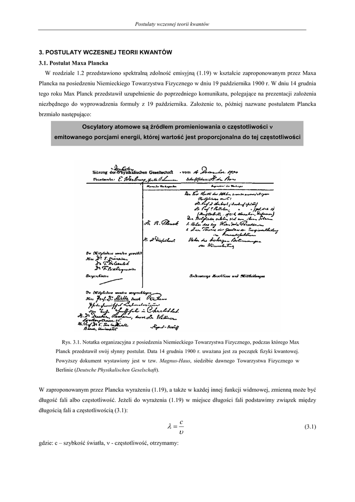 Postulaty wczesnej teorii kwantów 3. POSTULATY WCZESNEJ TEORII KWANTÓW 3.1. Postulat Maxa Plancka W rozdziale 1.2 przedstawiono spektralną zdolność emisyjną (1.19) w kształcie zaproponowanym przez Maxa Plancka na posiedzeniu Niemieckiego Towarzystwa Fizycznego w dniu 19 października 1900 r. W dniu 14 grudnia tego roku Max Planck przedstawił uzupełnienie do poprzedniego komunikatu, polegające na prezentacji załoŜenia niezbędnego do wyprowadzenia formuły z 19 października. ZałoŜenie to, później nazwane postulatem Plancka brzmiało następująco: Oscylatory atomowe są źródłem promieniowania o częstotliwości ν emitowanego porcjami energii, której wartość jest proporcjonalna do tej częstotliwości Rys. 3.1. Notatka organizacyjna z posiedzenia Niemieckiego Towarzystwa Fizycznego, podczas którego Max Planck przedstawił swój słynny postulat. Data 14 grudnia 1900 r. uwaŜana jest za początek fizyki kwantowej. PowyŜszy dokument wystawiony jest w tzw. Magnus-Haus, siedzibie dawnego Towarzystwa Fizycznego w Berlinie (Deutsche Physikalischen Geselschaft). W zaproponowanym przez Plancka wyraŜeniu (1.19), a takŜe w kaŜdej innej funkcji widmowej, zmienną moŜe być długość fali albo częstotliwość. JeŜeli do wyraŜenia (1.19) w miejsce długości fali podstawimy związek między długością fali a częstotliwością (3.1): λ= gdzie: c – szybkość światła, ν - częstotliwość, otrzymamy: c υ (3.1) Postulaty wczesnej teorii kwantów C (λ , T ) = c1 λ−5 c1 c −5υ 5 = ≠ C (υ , T ) c2 c2υ exp( ) − 1 exp( ) − 1 λT cT Zatem uwaga!: z kolei prawdziwa jest równość: (3.2) C (λ , T ) ≠ C (υ , T ) C (λ , T ) dλ = C (υ , T ) dυ c1 c −5υ 5 c1 λ−5 dλ = dλ cυ c exp( 2 ) − 1 exp( 2 ) − 1 cT λT (3.3) W powyŜszym wyraŜeniu po lewej stronie w miejsce dλ naleŜy podstawić róŜniczkę otrzymaną z pochodnej długości fali po częstotliwości: λ= − c υ c υ dυ 2 − ⇒ c c dλ = − 2 ⇒ dλ = − 2 dυ υ υ dυ c1 c −5υ 5 c1 λ−5 = dλ c2υ c2 exp( ) − 1 exp( ) − 1 cT λT c1 c −4υ 3 c1 λ−5 dυ = dλ c2υ c2 exp( ) − 1 exp( ) − 1 cT λT (3.4) (3.5) (3.6) Otrzymujemy wyraŜenie przedstawiające spektralną zdolność emisyjną w funkcji częstotliwości: c1 c −4υ 3 E (υ , T ) = cυ 1 − exp( 2 ) cT (3.7) Stałe c1 i c2 wyraŜa się za pomocą stałych uniwersalnych: c1 = 2 π h c2 c2 = h c k-1 gdzie: c – szybkość światła k – stała Boltzmana h – stała Plancka W efekcie zastosowania powyŜszych stałych otrzymujemy wyraŜenia: E (λ , T ) = 2π hc λ−5 2 exp( E (υ , T ) = hc ) −1 kTλ υ3 2π h c 2 1 − exp( hυ ) kT (3.8) (3.9) WyraŜenia 3.8 i 3.9 pozwalają wyliczyć moc P(λ1→λ2) emitowaną z jednostki powierzchni w granicach długości fal od λ1 do λ2: Postulaty wczesnej teorii kwantów P (λ1 → λ2 ) = 2π hc λ2 2 λ−5 ∫ λ1 exp( dλ hc ) −1 kTλ (3.10) c λ2 2π h υ3 P(λ1 → λ2 ) = 2 ∫ dυ c c 1 − exp( hυ ) λ1 kT (3.11) JeŜeli zamierzamy wyliczyć moc P(ν1→ν2) emitowaną z jednostki powierzchni w granicach częstotliwości od ν1→ν2 w wyraŜeniu 3.11 naleŜy zmienić znak, co skutkuje bardziej naturalnym niŜ powyŜej sposobem całkowania (chodzi o granice całkowania): υ υ3 2π h 2 P (υ1 → υ 2 ) = 2 ∫ dυ c υ 2 exp( hυ ) − 1 kT (3.12) Rys. 3.2. Przykładowe widma zdolności emisyjnej ciała doskonale czarnego. Rozkład Plancka pozwala wyznaczyć zaleŜność całkowitej zdolności emisyjnej od temperatury, którą jest całką ze zdolności emisyjnej po wszystkich długościach fali. Wartość tej całki jest proporcjonalna do czwartej potęgi temperatury, co stanowi potwierdzenie ustalonego wcześniej empirycznego prawa Stefana-Bolzmanna (1.15). Rozkład Plancka umoŜliwia takŜe wykazanie słuszności prawa przesunięć Viena (1.16). Obydwa te fakty w znakomity sposób potwierdzają powagę teorii Plancka. Właśnie dlatego, mimo jej sprzeczności z ówcześnie mocno ugruntowaną fizyką klasyczną, postulat Plancka i jego dalsze następstwa - jak np. wytłumaczenie zjawiska fotoelektrycznego, czy wytwarzanie promieniowania Rentgenowskiego – trzeba było na początku XX wieku przyjąć i włączyć do nauki. Max Planck otrzymał w roku 1918 nagrodę Nobla za wprowadzenie pojęcia kwantu energii. 3.2. Zjawisko fotoelektryczne – postulat Einsteina odnośnie kwantowej natury światła Historycznie występowanie zjawiska fotoelektrycznego naleŜy wiązać z doświadczeniami Francka Hertza nad wytwarzaniem fal elektromagnetycznych (1887 r.), podczas których w trakcie uruchamiania iskrownika zauwaŜył Postulaty wczesnej teorii kwantów jego lepsze działanie (łatwiejsze wyładowanie elektryczne) po oświetleniu światłem ultrafioletowym. Efekt fotoelektryczny precyzyjnie opisał Philip Lenard w roku 1902, wykazując, Ŝe z powierzchni wypolerowanego metalu pod wpływem światła emitowane są elektrony. W roku 1904 Albert Einstein odwrócił postulat Plancka postulując, Ŝe metal, a właściwie znajdujące się w nim swobodne elektrony, pochłaniają promieniowanie porcjami energii proporcjonalnymi do częstotliwości tego promieniowania Einstein sformułował równanie bilansujące energię w zjawisku fotoelektrycznym: hυ = W + E k (3.13) hν - energia przejęta przez elektron w metalu W - praca wyjścia, energia zuŜyta na pokonanie przyciągania elektrostatycznego między elektronem a miejscem przez niego opuszczonym (elektron zmieniając połoŜenie unosi ze sobą ładunek ujemny, zatem „pozostawia” po sobie przestrzeń naładowaną dodatnio) Ek - energia kinetyczna fotoelektronu swobodnie poruszającego się w przestrzeni W roku 1905 Einstein rozszerzył swój postulat do postaci następującej: Światło rozchodzi się w postaci elementarnych porcji (kwantów) energii o wartości takiej samej, jaka wynika z postulatu Plancka Takie kwanty energii Einstein nazwał fotonami. Podejście to bardzo kłóciło się z 