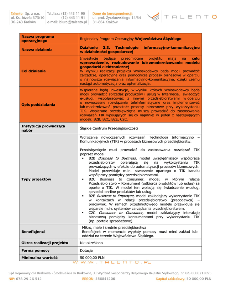 Nazwa programu operacyjnego Regionalny Program Operacyjny Województwa Śląskiego Nazwa działania Działanie 3.3. Technologie w działalności gospodarczej Cel działania Inwestycje będące przedmiotem projektu mają na celu wprowadzenie, rozbudowanie lub zmodernizowanie modelu gospodarki elektronicznej. W wyniku realizacji projektu Wnioskodawcy będą mogli prowadzić zarządcze, operacyjne oraz pomocnicze procesy biznesowe w oparciu o najnowsze rozwiązania informacyjno-komunikacyjne, dzięki czemu nastąpi automatyzacja oraz optymalizacja. Opis poddziałania Wspierane będą inwestycje, w wyniku których Wnioskodawcy będą mogli prowadzić sprzedaż produktów i usług w Internecie, świadczyć e-usługi, współpracować z innymi przedsiębiorstwami w oparciu o nowoczesne rozwiązania teleinformatyczne oraz implementować lub modernizować pozostałe procesy biznesowe przy wykorzystaniu TIK. Wspierane przedsięwzięcia muszą prowadzić do zastosowania rozwiązań TIK wpisujących się co najmniej w jeden z następujących modeli: B2B, B2C, B2E, C2C. Instytucja prowadząca nabór Śląskie Centrum Przedsiębiorczości informacyjno-komunikacyjne Wdrożenie nowoczesnych rozwiązań Technologii Informacyjno – Komunikacyjnych (TIK) w procesach biznesowych przedsiębiorstw. Typy projektów Beneficjenci Przedsięwzięcie musi prowadzić do zastosowania rozwiązań TIK poprzez model: B2B Business to Business, model uwzględniający współpracę przedsiębiorstw opierającą się na wykorzystaniu TIK prowadzących w efekcie do automatyzacji procesów biznesowych. Model przewiduje m.in. stworzenie opartego o TIK kanału współpracy pomiędzy przedsiębiorstwami. B2C Business to Consumer, model, w którym relacje Przedsiębiorstwo – Konsument (odbiorca produktów lub usług) są oparte o TIK. W model ten wpisują się świadczenie e-usług, sprzedaż on-line produktów lub usług. B2E Business to Employee, model zakładający wykorzystanie TIK w kontaktach w relacji przedsiębiorstwo (pracodawca) – pracownik. W ramach przedmiotowego modelu przewiduje się wsparcie m.in. systemów zarządzania przedsiębiorstwem. C2C Consumer to Consumer, model zakładający interakcję biznesową pomiędzy konsumentami przy wykorzystaniu TIK (np. portale sprzedażowe). Mikro, małe i średnie przedsiębiorstwa Beneficjent w momencie wypłaty pomocy musi mieć zakład lub oddział na terenie Województwa Śląskiego. Okres realizacji projektu Nie określono Forma pomocy Dotacja Minimalna wartość 50 000,00 PLN dofinansowania Maksymalna wartość dofinansowania 500 000,00 PLN 1. Maksymalny poziom dofinansowania (%) 2. 3. 4. Termin naboru wniosków Obszar realizacji projektu Regionalna Pomoc Inwestycyjna 45% kosztów kwalifikowalnych dla mikro oraz małych przedsiębiorstw, 35% kosztów kwalifikowalnych dla średnich przedsiębiorstw. Usługi doradcze - 50% kosztów kwalifikowalnych Inwestycje procesowe i organizacyjne - 50% kosztów kwalifikowalnych Pomoc de minimis – 50% kosztów kwalifikowanych 29 sierpnia 2016 r. – 6 października 2016 r. (do godz. 12:00) Województwo śląskie Przedsiębiorstwo w momencie wypłaty pomocy musi mieć zakład lub oddział na terenie województwa śląskiego. Koszty kwalifikowane koszty nabycia nowych środków trwałych - sprzętu informatycznego, bezpośrednio związanych z wdrażaną technologią (w tym m. in.: koszty zakupu, wytworzenia, instalacji, montażu, pierwszego uruchomienia, transportu, opakowania, rozładunku, koszty sprawdzenia i przystosowania nabytego sprzętu, koszty szkolenia personelu, instruktażu) – dofinansowanie 35/45%. koszty nabycia nowych wartości niematerialnych i prawnych bezpośrednio związanych z wdrażaną technologią, w szczególności zakup licencji i oprogramowania (w tym m.in.: koszty zakupu, wytworzenia, instalacji, montażu, pierwszego uruchomienia, koszty sprawdzenia i przystosowania nabytego oprogramowania, koszty szkolenia personelu, instruktażu) – dofinansowanie 35/45%. koszty nabycia nowych środków trwałych i wartości niematerialnych i prawnych w formie leasingu finansowego poniesione w okresie realizacji projektu – dofinansowanie 35/45%. koszty usług doradczych świadczonych przez doradców zewnętrznych - w tym m.in. zakup usług doradczych związanych z zastosowaniem i wykorzystaniem środków trwałych i wartości niematerialnych i prawnych, usługi doradcze niezbędne do wdrożenia zakupionych środków trwałych i wartości niematerialnych i prawnych, usługi doradcze dotyczące opracowania dokumentacji źródłowej/konstrukcyjnej nowego systemu, usługi doradcze w zakresie zastosowania technologii informacyjno-komunikacyjnych w przedsiębiorstwie, – dofinansowanie 50%. koszty personelu (umowa cywilnoprawna, umowa o pracę), w przypadku personelu zaangażowanego w wytworzenie środka trwałego/wartości niematerialnej i prawnej, – dofinansowanie 50%. koszty szkoleń związanych z realizacją projektu w zakresie zastosowania narzędzi TIK w przedsiębiorstwie - szkolenia dla pracowników Wnioskodawcy - użytkowników oprogramowania i sprzętu. – dofinansowanie 50%. pozostałe koszty kwalifikowalne (50%) - do wydatków kwalifikowalnych zaliczamy: koszty usług informatycznych związanych z wykorzystaniem infrastruktury udostępnionej w technologii chmury obliczeniowej, koszty usług związanych z kolokacją, konfiguracją, parametryzacją, migracją danych, skalowaniem, optymalizacją systemu, usługi związane z hostingiem. UWAGA Kategorie kosztów: usługi doradcze, szkolenia oraz pozostałe koszty kwalifikowalne objęte są 10% limitem w stosunku do wartości pozostałych kosztów nie objętych limitami. Kryteria oceny Kryteria merytoryczne Można uzyskać maksymalnie 31 pkt zgodnie z kryteriami podstawowymi z czego pozytywną ocenę otrzymują projekty, które uzyskają co najmniej 17 pkt na tym etapie. 1. Powstanie nowych/zoptymalizowanie dotychczasowych procesów biznesowych poprzez zastos