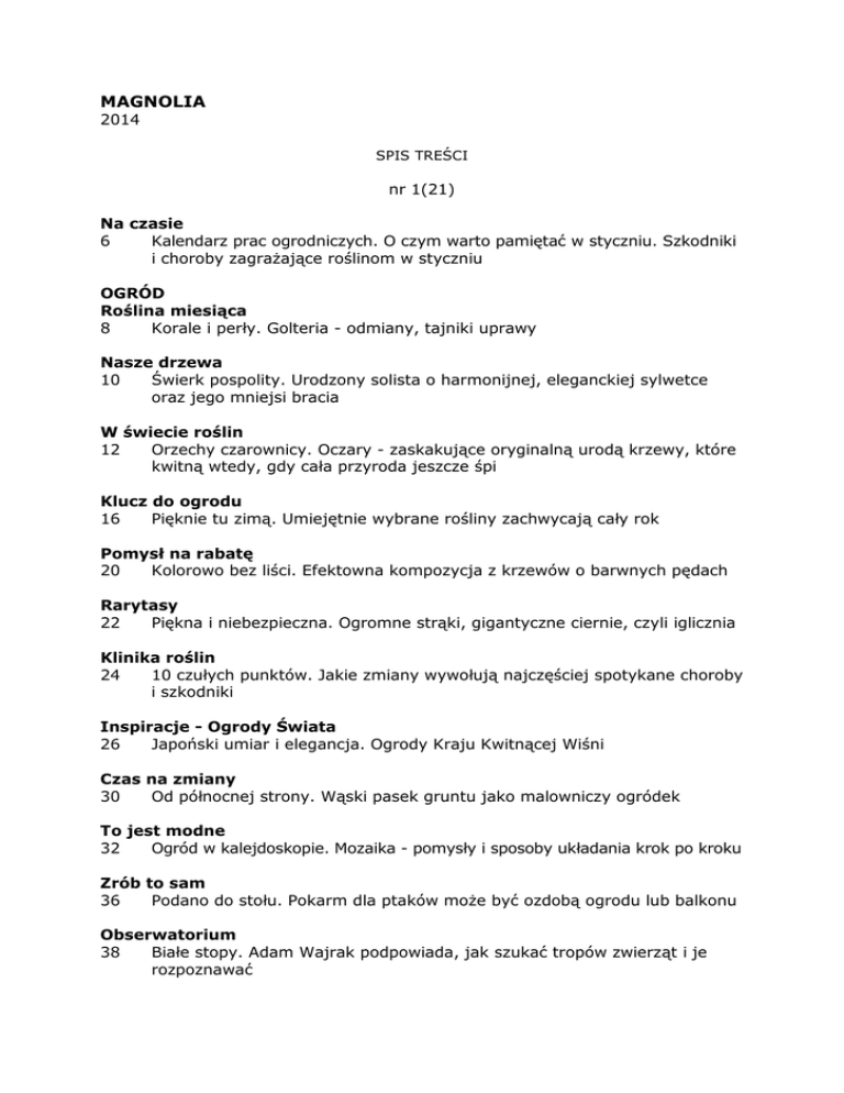 MAGNOLIA 2014 SPIS TREŚCI nr 1(21) Na czasie 6 Kalendarz prac ogrodniczych. O czym warto pamiętać w styczniu. Szkodniki i choroby zagrażające roślinom w styczniu OGRÓD Roślina miesiąca 8 Korale i perły. Golteria - odmiany, tajniki uprawy Nasze drzewa 10 Świerk pospolity. Urodzony solista o harmonijnej, eleganckiej sylwetce oraz jego mniejsi bracia W świecie roślin 12 Orzechy czarownicy. Oczary - zaskakujące oryginalną urodą krzewy, które kwitną wtedy, gdy cała przyroda jeszcze śpi Klucz do ogrodu 16 Pięknie tu zimą. Umiejętnie wybrane rośliny zachwycają cały rok Pomysł na rabatę 20 Kolorowo bez liści. Efektowna kompozycja z krzewów o barwnych pędach Rarytasy 22 Piękna i niebezpieczna. Ogromne strąki, gigantyczne ciernie, czyli iglicznia Klinika roślin 24 10 czułych punktów. Jakie zmiany wywołują najczęściej spotykane choroby i szkodniki Inspiracje - Ogrody Świata 26 Japoński umiar i elegancja. Ogrody Kraju Kwitnącej Wiśni Czas na zmiany 30 Od północnej strony. Wąski pasek gruntu jako malowniczy ogródek To jest modne 32 Ogród w kalejdoskopie. Mozaika - pomysły i sposoby układania krok po kroku Zrób to sam 36 Podano do stołu. Pokarm dla ptaków może być ozdobą ogrodu lub balkonu Obserwatorium 38 Białe stopy. Adam Wajrak podpowiada, jak szukać tropów zwierząt i je rozpoznawać Serwis ogrodowy 40 Dobrze schowane. Domki gospodarcze i sprytne schowki przydatne w ogrodzie Ze smakiem 42 Granaty żywią i bronią. Tajniki uprawy, odmiany, przepisy 44 Laury dla wawrzynu. Popularne liście laurowe prosto z parapetu 45 Chrzan nie do chrzanu. Jak uzyskać smaczny korzeń Eksperci radzą 46 Zielone pogotowie. Miejsce dla araukarii chilijskiej. Czy można przesadzać bukszpany. Zmęczona mimoza. Skąd się biorą siewki cisu. Przędziorek na oleandrze. Chory skrętnik. Dlaczego rośliny tracą ładny wygląd. Konserwacja narzędzi ogrodniczych BALKON I TARAS Na medal 50 Trzy kolory. Funkcjonalny taras w nowoczesnym stylu DOM Parapetówka 54 Niezawodna azalia. Najnowsze odmiany ciekawe w formie, efektowne kolorystycznie Rarytasy 58 Storczyk na metry. Wanilia - liana zachwycająca słodkim zapachem owoców Zielono mi 60 Perfumy w doniczce. Pachnące pnącza, aromatyczne cytrusy, wonne gardenie Rozrywka 53 Krzyżówka z nagrodami oraz fotozagadki Wasze sukcesy 62 Pochwalcie się swoim ogrodem, balkonem, rośliną! Co w trawie piszczy 64 Warto zobaczyć. Szklarnie Ogrodu Botanicznego w Warszawie Powsinie; Ciekawostki, nowości rynkowe; Kalendarium imprez 66 Za miesiąc w "Magnolii" nr 2(22) Na czasie 6 Kalendarz prac ogrodniczych. O czym warto pamiętać w lutym. Szkodniki i choroby oraz ich zwalczanie OGRÓD Roślina miesiąca 8 Zwiastun wiosny. Wawrzynek wilczełyko zakwita, gdy tylko słońce zaczyna mocniej grzać W świecie roślin 10 Cyprysiki jak z żurnala. Odmiany popularne i mało znane Rarytasy 14 Miłe przebudzenie. Miłek amurski lśni złotem na śniegu Pomysł na rabatę 16 Krokusami malowana. Błękitny łan kwiatów rozjaśniony plamkami przebiśniegów Nasze drzewa 18 Brzoza dobra i litościwa. Malownicze drzewo o dobrej energii Czas na zmiany 20 Kwiecisty gabinet. Zmieniamy zaniedbany placyk w kolorowy zakątek Klucz do ogrodu 22 Marzyciel z sekatorem ...i jego ogród, w którym łatwo zapomnieć o całym świecie Ze smakiem 26 Jedz i chudnij. Owoce i warzywa pomagające stracić zbędne kilogramy 28 Warzywa spod śniegu. Dobrze znoszą mróz i można je zbierać także zimą Serwis ogrodowy 30 Tniemy drzewa owocowe. Formujemy młode drzewka i odmładzamy stare okazy jabłoni oraz grusz Klinika roślin 32 Zwalczane na pniu. Zimą najłatwiej zauważyć objawy chorobowe na pniach i gałęziach Inspiracje 34 Jarzynowe smaczki. Burak czy kapusta mogą zdobić ogród na równi z kwiatami Obserwatorium 38 Pobudka w ogrodzie. Owady wracają do życia po zimie - nie niszczmy ich kryjówek To jest modne 40 Przyjazny beton. Tani i efektowny materiał na ogrodowe budowle i ozdobne detale Eksperci radzą 44 Zielone pogotowie. Krople na storczyku. Pora na nawożenie. Jak przechowywać owoce. Ratujemy fatsjobluszcz. Nielegalne odprowadzanie ścieków. Kora do ściółkowania. Przemarzanie barwinka. Fikus w kąpieli BALKON I TARAS Na medal 48 Z widokiem na zieleń. Jak stworzyć kameralną atmosferę na balkonie DOM Zrób to sam 52 Dwa sposoby na żarówkę. Wazonik i szklany ogródek - krok po kroku Parapetówka 54 Wiosna w doniczce. Kompozycje z pędzonych kwiatów cebulowych Serwis kwiatowy 56 Pora na wysiewy. Przygotowujemy rozsadę warzyw i kwiatów Parapetówka 58 Żelazna dama. Sansewieria - sukulent o niewielkich wymaganiach Rarytasy 60 Palma z orzechami. Kariota - roślina o oryginalnych liściach i efektownych owocach Rozrywka 61 Krzyżówka z nagrodami oraz fotozagadki Wasze sukcesy 62 Pochwalcie się swoim ogrodem, balkonem, rośliną! Co w trawie piszczy 64 Warto zobaczyć. Ogród Botaniczny w Krakowie; Ciekawostki, nowości rynkowe; Kalendarium imprez 66 Za miesiąc w "Magnolii" nr 3(23) Na czasie 6 Kalendarz prac ogrodniczych. O czym warto pamiętać w marcu. Szkodniki i choroby roślin oraz ich zwalczanie OGRÓD Roślina miesiąca 8 Eksplozja kolorów. Kobierce kwitnących na niebiesko przylaszczek to najlepszy znak, że wiosna tuż-tuż W świecie roślin 10 Derenie mają klasę. Odmiany, które o każdej porze roku zachwycają niezwykłą urodą 14 Bratki jak z obrazka - najciekawsze odmiany idealne do donic i na rabaty Dla zdrowia 18 Nie kichaj na pyłek. Podpowiadamy, jak opanować dokuczliwą alergię na pyłki roślin Klucz do ogrodu 20 Ogród jak w tropikach. Niezwykły zakątek pełen egzotycznych roślin i pomysłów wartych naśladowania Rarytasy 24 Marcowy bohater. Różanecznik dahurski już w marcu obsypuje się różowymi kwiatami Czas na zmiany 26 W rustykalnym stylu. Kwitnące rośliny jako idealna oprawa dla drewnianego domu Nasze drzewa 28 Grab pospolity. W lesie i ogrodzie Ze smakiem 30 Szczęście na talerz
