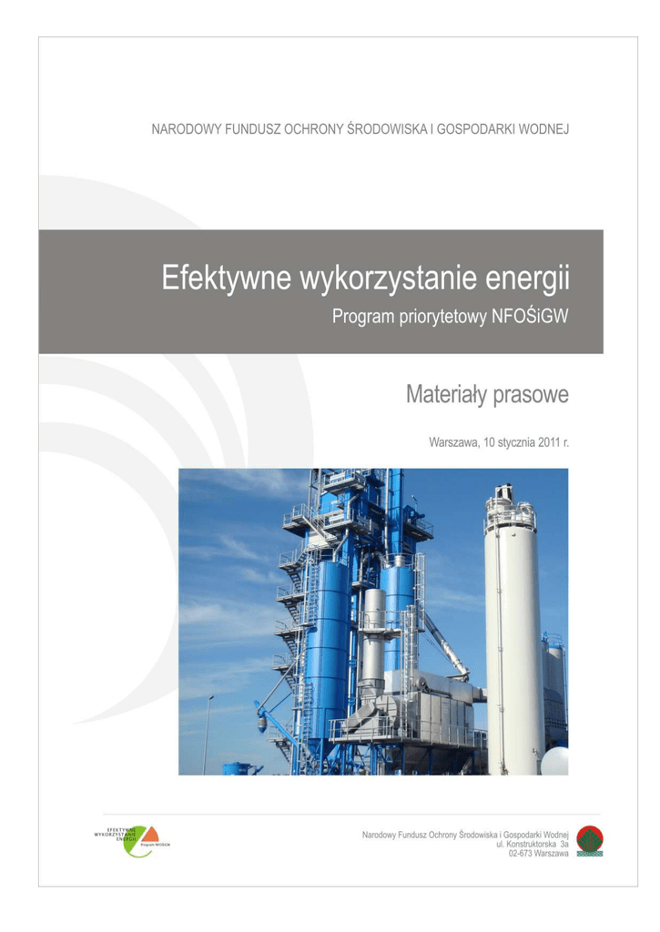 Program „Efektywne wykorzystanie energii” W styczniu 2011 roku Narodowy Fundusz Ochrony Środowiska i Gospodarki Wodnej uruchamia nowy program finansowy, którego celem jest inicjowanie i wsparcie przedsięwzięć inwestycyjnych służących poprawie efektywności energetycznej w najbardziej energochłonnych polskich przedsiębiorstwach. Na okres 2011-2016 zarezerwowano w budżecie programu łączną kwotę 820 mln zł, które pochodzić będą ze środków pochodzących z opłat zastępczych i kar nakładanych przez Urząd Regulacji Energetyki na producentów energii. Beneficjentem programu może być każde przedsiębiorstwo, poprzedzającym złożenie wniosku zużyło minimum 50 GWh energii. które w roku Program będzie realizowany w formie dwóch, kolejnych działań: Część 1 - Dofinansowanie audytów energetycznych i elektroenergetycznych Okres wdrażania rozpocznie się w styczniu 2011 i zakończy się 31 grudnia 2013 Budżet tego działania wynosi 40 mln zł Dofinansowanie w formie dotacji, w wysokości do 70% kosztów kwalifikowanych, będzie udzielane zgodnie warunkami pomocy de minimis. Działania objęte dotacją: audyty energetyczne źródeł ciepła, audyty energetyczne linii ciepłowniczych, audyty energetyczne budynków przemysłowych, audyty energetyczne procesów technologicznych, audyty elektroenergetyczne – optymalizacja zużycia energii elektrycznej w obiektach Część 2 - Dofinansowanie przedsięwzięć inwestycyjnych rekomendowanych w przeprowadzonym audycie, które zapewnią obniżenie zużycia energii o co najmniej 7%. Audyt, będący podstawą działań inwestycyjnych może być zrealizowany poza przedmiotowym programem priorytetowym. Okres wdrażania rozpocznie się w lipcu 2011 a zakończy 31 grudnia 2016 Budżet tego działania wyniesie 780 mln zł. Dofinansowanie będzie udzielane w formie pożyczek pokrywających do 70% kosztów kwalifikowanych inwestycji, w wysokości od 3,5 do 42 mln zł, zaś wysokość oprocentowania ustalono na poziomie WIBOR 3M + 50 pkt. bazowych. Działania inwestycyjne: Wdrażanie systemów zarządzania energią i jej jakością: instalowanie analizatorów parametrów sieci oraz wdrażanie systemów inteligentnych sieci (Smart Grids) dla zarządzania sieciami elektroenergetycznymi w obiektach przedsiębiorstw. Racjonalizacja zużycia energii elektrycznej poprzez wykorzystanie energooszczędnych systemów napędowych, systemów sterowania napędami np. poprzez instalacje łagodnego rozruchu, energooszczędnych silników, falowników pomp i wentylatorów, energooszczędnych sprężarek i systemów ich sterowania, wewnętrznych sieci przesyłowych energii, w tym ograniczenia przepływów mocy biernej, energooszczędnych systemów oświetleniowe; prostowników napędów sieciowych, niskostratnych transformatorów w lokalnych systemach elektroenergetycznych i wewnętrznych sieciach dystrybucyjnych. Racjonalizacja zużycia energii cieplnej i gazu poprzez zastosowanie izolacji i odwadniania systemów parowych, systemów geotermalnych, małych turbin wiatrowych, kolektorów słonecznych, pomp ciepła, termomodernizację budynków, rekuperację i odzyskiwanie ciepła z procesów i urządzeń, decentralizację rozległych sieci grzewczych, wykorzystanie energii odpadowej, budowę lub modernizację własnych (wewnętrznych) źródeł energii. Modernizacja procesów przemysłowych. Pełna treść tego programu finansowego stanowi załącznik konferencyjnych oraz znajduje się na stronie internetowej NFOŚiGW: do materiałów http://www.nfosigw.gov.pl/ef-en Program był opracowywany od końca 2009 roku w bliskiej współpracy z podmiotami, odgrywającymi główną rolę na polskim rynku energetycznym, a reprezentującymi zarówno przedsiębiorców (izby, zrzeszenia, stowarzyszenia) jak i inne podmioty o charakterze eksperckim (np. Krajową Agencją Poszanowania Energii). Celem tego było nadanie przygotowywanemu programowi takiego kształtu, aby jak najlepiej przystawał on do realiów i odpowiadał na bieżące potrzeby polskiego rynku. Programu został zatwierdzony przez Radę Nadzorczą NFOŚiGW w dn. 21 września 2010 roku. Ten nowy instrument finansowy otrzymał własne logo, będące jednocześnie swoistym certyfikatem, którym będą posługiwać się beneficjenci programu, podejmujący wyzwanie i wdrażający duże projekty energoefektywnościowe w swoich zakładach. Logo pełni rolę szyldu świadczącego o dalekowzroczności przedsiębiorstwa i umiejętności podejmowania działań efektywnych ekonomicznie a zarazem służących ochronie środowiska. Przykładowe roczne zużycie energii elektrycznej w wybranych podmiotach [GWh] 200 140-160 100-150 1 GWh = 1000 MWh 150 90-110 20-100 100 50 GWh - minimalne roczne zużycie energii potencjalnych beneficjentów programu 50 30-40 10-30 0 Cementownia Kopalnia węgla kamiennego Huta metali nieżelaznych Huta szkła Duże centrum handlowe Fabryka ceramiki Źródła finansowania poprawy efektywności energetycznej przez NFOŚiGW Źródłami finansowania działań służących poprawie efektywności energetycznej są: Opłaty zastępcze i kary naliczane przez Urząd Regulacji Energetyki Ta możliwość została stworzona przez ustawodawcę od 1 stycznia 2010 roku.1 Do tamtej pory środki te mogły być przeznaczane wyłącznie na inwestycje w odnawialne źródła energii i kogenerację. Środki ze sprzedaży przez Polskę nadwyżek uprawnień do emisji CO2 wg protokołu z dn. 9 lipca 1997 z Kioto, w ramach Systemu Zielonych Inwestycji, którego Krajowym Operatorem ustanowiony został NFOŚiGW Środki unijne z Europejskiego Funduszu Rozwoju Regionalnego dla działań w zakresie poprawy warunków ochrony środowiska w ramach IV osi priorytetowej Programu Operacyjnego Infrastruktura i Środowisko2. Środki unijne z Europejskiego Funduszu Spójności dla działań energoefektywnościowych realizowanych w ramach IX osi priorytetowej Programu Operacyjnego Infrastruktura i Środowisko2. Środk