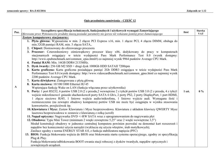 oznaczenie sprawy: RA-Z-02/2016 Załącznik nr 1.12 Opis przedmiotu zamówienia – CZĘŚĆ 12 Poz. A Szczegółowa specyfikacja technicznych, funkcjonalnych i użytkowych wymagań Zamawiającego Oferowane przez Wykonawców produkty muszą posiadać parametry nie gorsze niż wskazane poniżej przez Zamawiającego Zestaw komputerowy stacjonarny: 1. Płyta główna: Wyposażona w min. 2 złącze PCI Express x16, min. 1 złącze PCI, 4 złącza DIMM, obsługa do min.32GB pamięci RAM, min. 3 złącza SATA,. 2. Chipset: Dostosowany do oferowanego procesora 3. Procesor: Czterordzeniowy ośmiowątkowy procesor klasy x86, dedykowany do pracy w komputerach stacjonarnych osiągający w teście wydajności Pass Mark Performance Test 8.0 (wynik dostępny: http://www.cpubenchmark.net/common_cpus.html#) co najmniej wynik 9964 punktów Average CPU Mark. 4. Pamięć RAM: Min. 16GB DDR4 2133MHz. 5. Dysk twardy: 256 GB M2 SSD + drugi dysk 1000Gb HDD SATAII 7200rpm 6. Karta graficzna: Karta graficzna posiadająca pamięć 2Gb DDR3 osiągająca w teście wydajności Pass Mark Performance Test 8.0 (wynik dostępny: http://www.videocardbenchmark.net/common_gpus.html co najmniej wynik 2200 punktów Average CPU Mark. 7. Karta dźwiękowa: Zintegrowana z płytą główną 8. Karta sieciowa: 10/100/1000 Ethernet RJ 45 Wspierająca funkcję Wake on LAN (funkcja włączana przez użytkownika) 9. Porty: 1 port RS232, 6 portów USB 2.0 (2 z przodu,2 wewnętrzne 2 z tyłu)6 portów USB 3.0 (2 z przodu, 4 z tyłu)1 wejście mikrofonowe1 gniazdo słuchawkowe4 porty SATA 6 Gb/s, 2 porty PS2, 2 porty DisplayPort, 1 port HDMI, 1 złącze sieciowe RJ45, 1 liniowe wejście audio/mikrofonu, 1 liniowe wyjście audi. Wymagana ilość i rozmieszczenie (na zewnątrz obudowy komputera) portów USB nie może być osiągnięta w wyniku stosowania konwerterów, przejściówek itp. 10. Klawiatura i Mysz: Zestaw Klawiatura i Mysz bezprzewodowa. Klawiatura z układem klawiszy QWERTY Mysz laserowa bezprzewodowa w zestawie z klawiaturą z rolką (scroll) 11. Napęd optyczny: Nagrywarka DVD +/-RW SATA wraz z oprogramowaniem do nagrywania płyt 12. Obudowa: Typu Mini Tower (minimum 2 wnęki zewnętrzne 5,25” oraz 2 wnęki wewnętrzne 3,5”) Moduł konstrukcji obudowy w jednostce centralnej komputera powinien pozwalać na demontaż kart rozszerzeń i napędów bez konieczności użycia narzędzi (wyklucza się użycia wkrętów, śrub motylkowych); Zasilacz zgodny z norma ENERGY STAR 4.0, z funkcja stabilizatora napięcia (PFC) 13. BIOS: Funkcja blokowania wejścia do BIOS oraz blokowania startu systemu operacyjnego, zgodny ze specyfikacją Plug & Play. Funkcja blokowania/odblokowania BOOT-owania stacji roboczej z dysków twardych, napędów optycznych i zewnętrznych urządzeń. Ilość Stawka VAT 1 szt. 0% oznaczenie sprawy: RA-Z-02/2016 B Możliwość wyłączania portów USB. 14. Poziom hałasu: Poziom emitowanego hałasu, mierzony wg normy ISO 7779 i wykazany według normy ISO 9296 w trybie jałowym (IDLE) nie może przekroczyć poziomu 35 dB. 15. Wsparcie techniczne producenta: Możliwość sprawdzenia konfiguracji sprzętowej komputera oraz warunków gwarancji po podaniu numeru seryjnego lub numeru modelu bezpośrednio u producenta lub jego przedstawiciela. do oferty należy dołączyć kontakt (link strony, nr telefonu lub adres e-mail) Dostęp do najnowszych sterowników i uaktualnień na stronie producenta zestawu– do oferty należy dołączyć link strony. 16. Kompatybilność: W celu uniknięcia błędów kompatybilności Zamawiający wymaga, aby wszystkie elementy zestawu oraz podzespoły montowane przez producenta były przez niego certyfikowane. Wykonawca nie może samodzielnie dokonywać modyfikacji producenta sprzętu. 17. System operacyjny: Dołączone nośniki z oprogramowaniem i sterownikami sprzętu, lub preinstalowany z dysku twardego komputera Monitor 24”: 1. Typ ekranu: Ekran ciekłokrystaliczny z aktywną matrycą TFT 24” WUXGA IPS 2. Format: 16:10 panoramiczny 3. Jasność: 300cd/m2 4. Kontrast: Minimum 1000:1 lub 2 000 000:1 dynamiczny 5. Kąty widzenia (pion/poziom): Minimum 178/178 stopni 6. Czas reakcji matrycy: Max 8 ms 7. Natywna rozdzielczość: Minimum 1920x1200 8. Bezpieczeństwo: Monitor musi być wyposażony w tzw. Kensington Slot 9. Funkcje: Pivot, Tilt, regulacja wysokości 10. Złącze: 1 x złącze VGA lub złącze DVI z HDCP, 1 x złacze Display Port, 1x złacze USB upstream, 4xUSB downstream 11. Certyfikaty: TCO 03 lub wyższy, ENERGY STAR 4.0 lub wyższy Załącznik nr 1.12 1 szt. 0% oznaczenie sprawy: RA-Z-02/2016 C Drukarka Laserowa kolorowa; 1. Rodzaj: Drukarka laserowa kolorowa 2. Dodatkowe moduły: Automatyczny DUPLEX 3. Szybkość druku mono: 25 str./min 4. Szybkość druku kolor: 25 str./min 5. Rozdzielczość: Min 600 x 600 dpi 6. Interfejs: 1 x LAN RJ 45 Karta sieciowa Ethernet 10/100/1000 Base T, 1 x USB 7. Języki druku: PCL 6 , PCL 5 , PostScript , PDF 8. Pojemność podajnika: Standardowy podajnik na min 50 arkuszy A4 9. Oprogramowanie: Standardowe zawierające sterowniki i oprogramowanie producenta umożliwiające odczyt stanu materiałów eksploatacyjnych 10. Standardowy przewód zasilający, przewód USB Załącznik nr 1.12 1 szt. 0% 1 szt. 23 % Ultrabook: D 1. Komputer przenośny typu ultrabook wykorzystywany dla potrzeb aplikacji biurowych, aplikacji edukacyjnych, aplikacji obliczeniowych, dostępu do internetu oraz poczty elektronicznej, jako lokalna baza danych, stacja programistyczna 2. Ekran: Min 15” – max 16’’ dotykowy rozdzielczość 1920x1080, IPS podświetlenie LED 3. Chipset: Dostosowany do zaoferowanego procesora 4. Procesor: Czterordzeniowy procesor klasy x86, dedykowany do pracy w komputerach przenośnych osiągający w teście wydajności Pass Mark Performance Test 8.0 (wynik dostępny: http://www.cpubenchmark.net/high_end_cpus.html ) co najmniej wynik 8000 punktów PassMark - CPU Mark 5. Pamięć RAM: Min 12GB DDR3 1600MHz 6. Dysk twardy: Półprze
