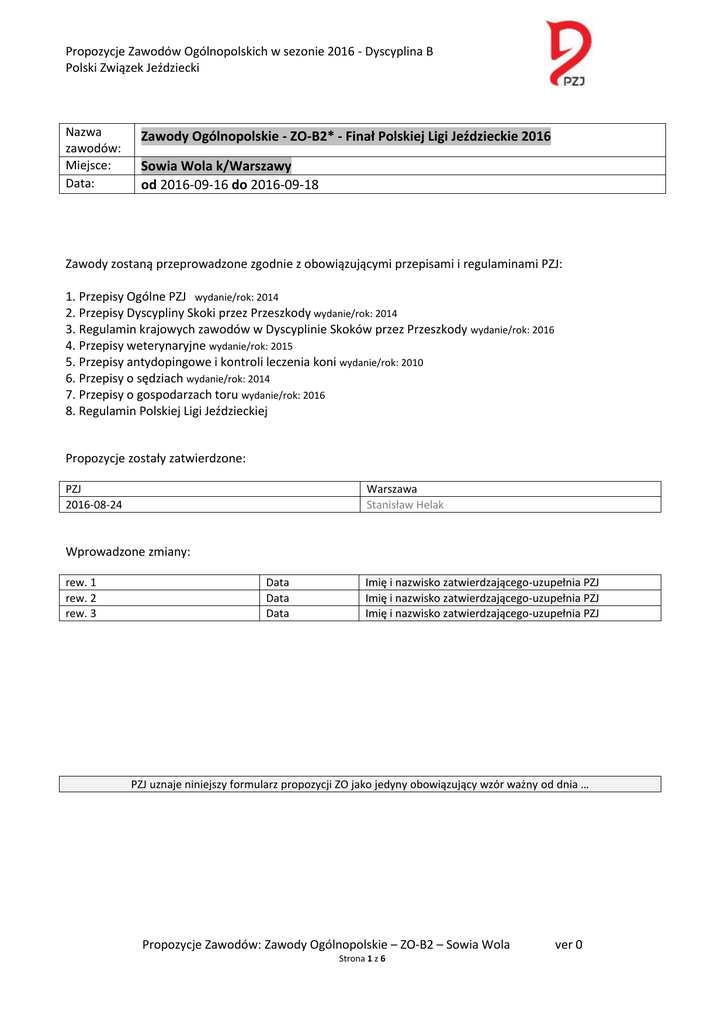 Propozycje Zawodów Ogólnopolskich w sezonie 2016 - Dyscyplina B Polski Związek Jeździecki Nazwa zawodów: Miejsce: Data: Zawody Ogólnopolskie - ZO-B2* - Finał Polskiej Ligi Jeździeckie 2016 Sowia Wola k/Warszawy od 2016-09-16 do 2016-09-18 Zawody zostaną przeprowadzone zgodnie z obowiązującymi przepisami i regulaminami PZJ: 1. Przepisy Ogólne PZJ wydanie/rok: 2014 2. Przepisy Dyscypliny Skoki przez Przeszkody wydanie/rok: 2014 3. Regulamin krajowych zawodów w Dyscyplinie Skoków przez Przeszkody wydanie/rok: 2016 4. Przepisy weterynaryjne wydanie/rok: 2015 5. Przepisy antydopingowe i kontroli leczenia koni wydanie/rok: 2010 6. Przepisy o sędziach wydanie/rok: 2014 7. Przepisy o gospodarzach toru wydanie/rok: 2016 8. Regulamin Polskiej Ligi Jeździeckiej Propozycje zostały zatwierdzone: PZJ 2016-08-24 Warszawa Stanisław Helak Wprowadzone zmiany: rew. 1 rew. 2 rew. 3 Data Data Data Imię i nazwisko zatwierdzającego-uzupełnia PZJ Imię i nazwisko zatwierdzającego-uzupełnia PZJ Imię i nazwisko zatwierdzającego-uzupełnia PZJ PZJ uznaje niniejszy formularz propozycji ZO jako jedyny obowiązujący wzór ważny od dnia … Propozycje Zawodów: Zawody Ogólnopolskie – ZO-B2 – Sowia Wola Strona 1 z 6 ver 0 Propozycje Zawodów Ogólnopolskich w sezonie 2016 - Dyscyplina B Polski Związek Jeździecki 1. ZAWODY Ranga: ZO2* / Polska Liga Jeździecka Finał / otwarte Kategoria: JM / J / MJ / S / --- / --Miejsce: Sowia Wola k/Warszawy Termin: od 2016-09-16 do 2016-09-18 2. ORGANIZATOR Nazwa: Adres: dane: E-mail: Nr tel./Fax: Strona www: Dyrektor zawodów: Dyrektor Techniczny Biuro zawodów: Szef stajni: Komitet Honorowy: Stowarzyszenie Sportowy Klub Jeździecki Bobrowy Staw ul. Spacerowa 47, Sowia Wola, 05-152 Czosnów NIP 5311692741 KRS 0000575504 [email protected] www.bobrowystaw.pl Agnieszka Polityło-Aluwihare, tel: +48 502 991 750 Michał Śliwiński , tel.: +58 504 249 649 Agata Głuchowska tel.: +48 508 878 781 e-mail: Oskar Szubert , tel.: +48 535 072 502 3. OSOBY OFICJALNE Przewodniczący Komisji Sędziowskiej: Sędzia PZJ: Członkowie Komisji Sędziowskiej: Anetta Orlicka, kl. 1 – mail: , tel.: Ewa Porębska-Gomółka, kl. 1/L2 – mail: Jan Limanowski, kl. 1 Maksym Maksymowicz, kl. 1 Delegat Techniczny: Gospodarz Toru: Asystent Gospodarza Toru: Szymon Tarant, kl. GT L3, tel.: 602345080 Łukaz Szustorowski kl.2 Szef Komisarzy: Komisarze: Lidia Chomentowska, kl. 2, tel.: Bartłomiej Rózga, kl. 3 Komisja Odwoławcza: Przewodniczący: Delegat weterynaryjny PZJ: Lekarz weterynarii zawodów: Powiatowy lekarz weterynarii: tel.: dr Piotr Szpotański, tel.: 512 220 709 dr Jacek Leszczyński, tel.: 604 963 523 Kowal: Spiker: ? , tel.: ? , tel.: Propozycje Zawodów: Zawody Ogólnopolskie – ZO-B2 – Sowia Wola Strona 2 z 6 ver 0 Propozycje Zawodów Ogólnopolskich w sezonie 2016 - Dyscyplina B Polski Związek Jeździecki 4. WARUNKI TECHNICZNE Otwarcie stajni Zamknięcie stajni Zebranie techniczne/sprawdzanie dokumentów Przegląd weterynaryjny 2016-09-15 2016-09-18 2016-09-15 od godz. 10:00 godz. 20:00 godz. 17:00-20:00 Plac konkursowy piasek kwarcowy z włókniną Rozprężania piasek kwarcowy z włókniną Udostępnienie areny do pracy płaskiej (stęp, kłus) dodatkowo głównej/rozprężalni hala Beck_Heun Gmbh Łyżki bezpiecznikowe Sprzęt do pomiaru czasu: TAG HEUER - Chronometr: CP 540 certyfikat nr 22010028A - Fot ocele: HL 2–31 certyfikat nr 22010003B - Fot ocele: HL 2–35 certyfikat nr 22010004B - Radiolinia: HL 610 certyfikat nr 22010006C 85m x 40m 50m x 30m 75m 30m 5. WARUNKI UCZESTNICTWA I FINANSOWE Opłata organizacyjna za boks od konia RUNDY Runda Złota Runda Srebrna i Brązowa program badań antydopingowych podłączenie samochodu do prądu siano (kostka) słoma (kostka) trociny (kostka/balot) pasza i siano Koszt (pln) 300 zł za całe zawody 450 zł 360 zł 15 zł 150 zł - na zgłoszeniu należy zaznaczyć, konieczność korzystania z przyłącza prądu 10 zł 10 zł 60 zł - jeżeli trociny mają być w boksach od początku prosimy zaznaczyć na zgłoszeniach własne - Organizator zapewnia tylko pierwszą ściółkę (słomę) w boksach Dodatkowe informacje: 5.1. Termin zgłoszeń wstępnych: 2016-09-01 5.2. Termin zgłoszeń ostatecznych: 2016-09-07 5.3. Zgłoszenia jedynie przez formularz zgłoszeniowy on-line na stronie www.zawodykonne.com. 5.4. Przedpłatę od konia w wysokości 300 zł należy wpłacić w terminie do 7 września 2016 r. Dane do przelewu: Stowarzyszenie Sportowy Klub Jeździecki Bobrowy Staw Sowia Wola ul. Spacerowa 47, 05-152 Czosnów WBK S.A. 03 1090 1014 0000 0001 3193 5593 w tytule przelewu proszę wpisać ZO PLJ BOKS i nazwisko zawodnika Propozycje Zawodów: Zawody Ogólnopolskie – ZO-B2 – Sowia Wola Strona 3 z 6 ver 0 Propozycje Zawodów Ogólnopolskich w sezonie 2016 - Dyscyplina B Polski Związek Jeździecki 5.5. 5.6. 5.7. Po wycofaniu konia tym terminie tj. po 2016-09-07 opłaty nie podlegają zwrotowi. Dokonane opłaty w przypadku wycofania konia przed terminem zgłoszeń ostatecznych są zwracane w wysokości 100%. Zgłoszenia bez opłaty są nieważne i nie gwarantują przyjęcia koni na zawody. Konkursy PLJ mają charakter otwarty i mogą w nich startować pary nie liczące się do finału PLJ. W trakcie zawodów odbędzie się finał Bobrowy Staw Summer JumpOff. Regulamin cyklu jest dostępny na stronie www.zawodybobrowystaw.pl W przypadku dużej liczby zgłoszeń zawody finałowe Bobrowy Staw Summer JumpOff zostaną skrócone do konkursu finałowego. 6. PROGRAM I NAGRODY Program - godziny rozpoczęcia mogą ulec zmianie po zapoznaniu się z ilością zgłoszeń. KONKURS WYS (cm) PULA (zł) I II III IV V VI VII VIII 25%** PIĄTEK – 16.09.2016 – godz. 10:00 1 Runda Brązowa zwykły 238.2.1 2 Runda Srebrna dwufazowy 274.5.3 3 Runda Złota zwykły 238.2.1 N 120 C 130 CC 140 1 300 400 300 200 100 100 50 50 50 50 2 200 750 500 300 200 100 100 100 100 50 4000 1200 1000 500 400 300 200 200 100 100 SOBOTA – 17.09