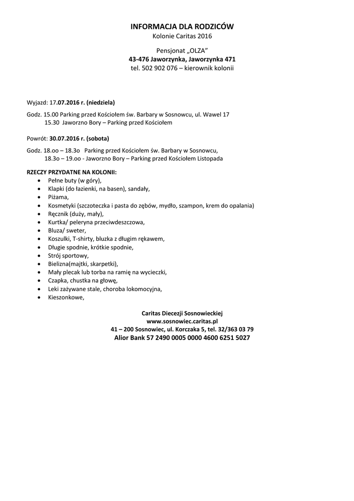 INFORMACJA DLA RODZICÓW Kolonie Caritas 2016 Pensjonat „OLZA” 43-476 Jaworzynka, Jaworzynka 471 tel. 502 902 076 – kierownik kolonii Wyjazd: 17.07.2016 r. (niedziela) Godz. 15.00 Parking przed Kościołem św. Barbary w Sosnowcu, ul. Wawel 17 15.30 Jaworzno Bory – Parking przed Kościołem Powrót: 30.07.2016 r. (sobota) Godz. 18.oo – 18.3o Parking przed Kościołem św. Barbary w Sosnowcu, 18.3o – 19.oo - Jaworzno Bory – Parking przed Kościołem Listopada RZECZY PRZYDATNE NA KOLONII: Pełne buty (w góry), Klapki (do łazienki, na basen), sandały, Piżama, Kosmetyki (szczoteczka i pasta do zębów, mydło, szampon, krem do opalania) Ręcznik (duży, mały), Kurtka/ peleryna przeciwdeszczowa, Bluza/ sweter, Koszulki, T-shirty, bluzka z długim rękawem, Długie spodnie, krótkie spodnie, Strój sportowy, Bielizna(majtki, skarpetki), Mały plecak lub torba na ramię na wycieczki, Czapka, chustka na głowę, Leki zażywane stale, choroba lokomocyjna, Kieszonkowe, Caritas Diecezji Sosnowieckiej www.sosnowiec.caritas.pl 41 – 200 Sosnowiec, ul. Korczaka 5, tel. 32/363 03 79 Alior Bank 57 2490 0005 0000 4600 6251 5027
