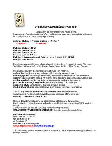OFERTA STYLIZACJI ŚLUBNYCH 2014 Dziękujemy za zainteresowanie naszą ofertą. Proponujemy Pani skorzystanie z oferty pakietu ślubnego, który szczególnie polecamy. W skład pakietu wchodzą następujące usługi: makijaż ślubny + fryzura ślubna = 449 zł * (z próbą) (z próbą) Makijaż ślubny 180 zł Makijaż próbny 99 zł Fryzura ślubna 150 zł Fryzura próbna 99 zł Makijaż + fryzura do sesji foto (w innym dniu niż ślub) 179 zł Makijaż foto 149 zł Pracujemy na profesjonalnych kosmetykach następujących marek: Kryolan, Dior, Mac, Smashbox, Vichy,Benefit, YSL, Revlon, Peggy Sage, Artdeco, Max Factor, Cinema. Ponieważ zajmujemy się kompleksową obsługą Pań Młodych, do Pani dyspozycji pozostają nasi specjaliści pracujący na poziomach: salon fryzjerski koloryzacja, strzyżenia, przedłużanie włosów Hair Talk Extension gabinet kosmetyczny zabiegi na twarz i ciało, pedicure, depilacja, przedłużanie rzęs atelier makijażu nauka makijażu indywidualnego, analiza kolorystyczna pracownia stylizacji paznokci manicure hybrydowy O.P.I color gel akademia stylu konsultacje w zakresie stylizacji ślubnej studio fotograficzne sesje zdjęciowe: portretowe, rodzinne, reportażowe Zapraszamy również osoby biorące udział w uroczystości (mama, świadkowie itp.), dla których przygotowaliśmy specjalną ofertę cenową: makijaż + fryzura w cenie 179 zł Opcję z dojazdem realizujemy w zależności od obłożenia w danym dniu. Koszt dojazdu (1 zł za km) oraz stylizacja w niedzielę i święta wzrasta o 50 % wartości usługi. Zapytaj o rabat od 5% do 10% przy kompleksowej obsłudze. ORGANIZUJEMY WIECZORY PANIEŃSKIE! Zapytaj o szczegóły naszej oferty. pacykarnia hairmakeup mob. +48 601 77 13 73 tel. 61 826 97 54 ul. Owsiana 17 60 - 644 Poznań-Winogrady www.pacykarnia.pl www.hairmakep.pl * Przy rezerwacji pakietu pobieramy zadatek w wysokości 49 zł. W przypadku rezygnacji kwota nie podlega zwrotowi.