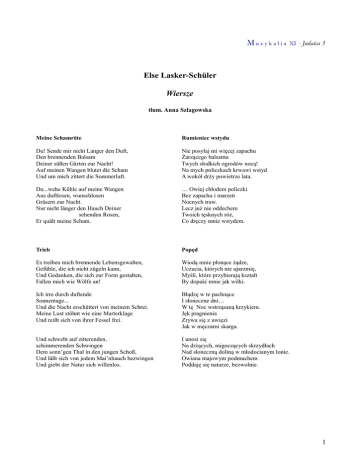Mu z y k a l i a XI · Judaica 3 Else Lasker-Schüler Wiersze tłum. Anna Szlagowska Meine Schamröte Rumieniec wstydu Du! Sende mir nicht Langer den Duft, Den brennenden Balsam Deiner süßen Gärten zur Nacht! Auf meinen Wangen blutet die Scham Und um mich zittert die Sommerluft. Nie posyłaj mi więcej zapachu Żarzącego balsamu Twych słodkich ogrodów nocą! Na mych policzkach krwawi wstyd A wokół drży powietrze lata. Du...wehe Kühle auf meine Wangen Aus duftlosen, wunschlosen Gräsern zur Nacht. Nur nicht länger den Hauch Deiner sehenden Rosen, Er quält meine Scham. … Owiej chłodem policzki Bez zapachu i marzeń Nocnych traw. Lecz już nie oddechem Twoich tęsknych róż, Co dręczy mnie wstydem. Trieb Popęd Es treiben mich brennende Lebensgewalten, Gefühle, die ich nicht zügeln kann, Und Gedanken, die sich zur Form gestalten, Fallen mich wie Wölfe an! Wiodą mnie płonące żądze, Uczucia, których nie ujarzmię, Myśli, które przybierają kształt By dopaść mnie jak wilki. Ich irre durch duftende Sonnentage... Und die Nacht erschüttert von meinem Schrei. Meine Lust stöhnt wie eine Marterklage Und reißt sich von ihrer Fessel frei. Błądzę w te pachnące I słoneczne dni… W tę Noc wstrząsaną krzykiem. Jęk pragnienia Zrywa się z uwięzi Jak w męczarni skarga. Und schwebt auf zitterenden, schimmerenden Schwingen Dem sonn’gen Thal in den jungen Schoß, Und läßt sich von jedem Mai’nhauch bezwingen Und giebt der Natur sich willenlos. I unosi się Na drżących, migoczących skrzydłach Nad słoneczną doliną w młodocianym łonie. Owiana majowym podmuchem Poddaję się naturze, bezwolnie. 1 Mu z y k a l i a XI · Judaica 3 Nervus Erotis Nervus Erotis Daß uns nach all’ der heißen Tagesglut Nicht eine Nacht gehört... Die Tuberosen färben sich mit meinem Blut, Aus ihren Kelchen lodert’s brandrot! Die ganze Welt scheint rot, Als ob des Lebens weite Seele blutet. Mein Herz stöhnt wie das Leid der Hungersnot, Aus roten Geisteraugen stiert der Tod! Po gorących dniach żaru Nie dojrzała nas Noc… Lilie nabiegły mą krwią, Ognista czerwień W ich kielichach pała! Powiedz mi, czy nocami i Twoja dusza krzyczy? Gdy ją z lękliwej drzemki budzi dziki ptak Wrzask nocy. Cały świat czerwienią lśni, Jakby krwawiła dusza. Moje serce jęczy Cierpiąc dokuczliwy głód, A z przekrwionych oczu Wyziera śmierć. Sag’ mir, ob auch in Nächten Deine Seele klagt, Vom starken Tuberosenduft umflutet, Und an dem Nerv des bunten Traumes nagt. Powiedz mi, czy nocami i Twoja dusza krzyczy? Okolona ostrym zapachem lilii I zrywa nerw kolorowego snu. Dann Potem ...Dann kam die Nacht mit Deinem Traum Im stillen Sternebrennen. Und der Tag zog lächend an mir vorbei, Und die wilden Rosen atmeten kaum. …Potem nadeszła noc z Tobą we śnie W ciszy pałających gwiazd. I dzień przeniknął mnie z uśmiechem I dzikie róże powstrzymały oddech. Nun sehn’ ich mich nach Traumesmai, Nach Deinem Liebeoffenbaren. Möchte an Deinem Munde brennen Eine Traumzeit von tausend Jahren. I teraz tęsknię za tym majem Po twym miłosnym wyznaniu. Chciałabym na Twoich ustach płonąć, Przez snu tysiące lat. Wir Beide My Der Abend weht Sehnen aus Blütensüße, Und auf dem Bergen brennt wie Silberdiamant der Reif, Und Engelköpfchen gucken überm Himmelstreif, Und wir Beide sind im Paradiese. Wieczór zwiewa tęsknotę ze słodyczy kwiatów, A na szczytach szron- diamentowe srebro, Główki aniołów wyzierają z nieba, A my dwoje przebywamy w raju. Und uns gehört das ganze bunte Leben, Das blaue, große Bilderbuch mit Sternen, Mit Wolkentieren, die sich jagen in den Fernen Und hei! die Kreiselwinde, die uns drehn und heben! I do nas należy całe wielobarwne życie, Błękitna księga wyszywana w gwiazdy, Z bestiami chmur, co polują w otchłaniach! I Wirujące wiatry, unoszące wzwyż! Der liebe Gott träumt seinen Kindertraum Vom Paradies – von seinen zwei Gespielen, Und große Blumen sehn uns an von Dornenstillen... Die düstere Erde hing noch grün am Baum. Ukochany Bóg śni dziecięcy sen O raju - o swych towarzyszach zabaw I ogromne kwiaty spoglądają na nas Z wnętrza cierniowych cisz A posępna ziemia przepływa w zieleń drzew. Sag’ mir, ob auch in Nächten Deine Seele schreit, Wenn sie aus bangem Schlummer auffährt, Wie wilde Vögel schreien durch die Nachtzeit. 2 Mu z y k a l i a XI · Judaica 3 Ruth Ruth Und Du suchst mich vor dem Hecken, Ich höre Deine Schritte seufzen, und meine Augen sind schwere, dunkle Tropfen. Szukasz mnie za żywopłotem Słyszę na przemian twe westchnienia i kroki A oczy moje to ciężkie, ciemne krople In meiner Seele blühen süß Deine Blicke Und füllen sich, wenn meine Augen in Schlaf wandeln. W duszy mej kwitną słodko Twoje spojrzenia wypełniają się, gdy oczy zstępują w sen. Am Brunnen meiner Heimat Steht ein Engel, der singt das Lied meiner Liebe, der singt das Lied Ruths. U źródła mej ojczyzny, Stoi Anioł, Śpiewając pieśń o mej miłości, Pieśń Ruth. Maienregen Majowy deszcz Du hast Deine warme Seele Um mein verwittertes Herz geschlungen, Und all seine dunklen Töne Sind wie ferne Donner verklungen. Oplotłeś swoją ciepłą duszę Wokół mojego zwietrzałego serca, I wszystkie jego ciemne dźwięki Wybrzmiały jak odległe ciernie. Aber es kann nicht mehr jauchzen Mit seiner wilden Wunde, Und wunschlos in Deinem Arme Liegt mein Mund auf Deinem Munde. Lecz nie może się dłużej radować Z powodu wciąż otwartej rany, I beznadziejnie tonę w Twych ramionach A usta moje spoczywają na Twoich. Und ich höre Dich leise weinen, Und es ist – die Nacht bewegt sich kaumAls fiele ein Mainenregen Auf meinen greisen Traum. I słyszę Twój cichy płacz I tak to jest- Noc prawie zastygła Jakby padał majowy deszcz Na mój sędziwy sen. Weltende Koniec świata Es ist ein Weinen in der Welt, Als ob der liebe Gott gestorben wär, Und der bleierne Schatten, der niederfällt Lastet grabesschwer. Jest taki lamen