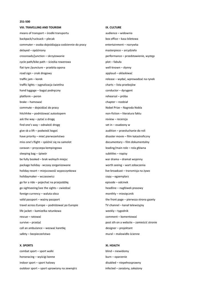 251-500 VIII. TRAVELLING AND TOURISM IX. CULTURE means of transport – środki transportu audience – widownia backpack/rucksack – plecak box office – kasa biletowa commuter – osoba dojeżdżająca codziennie do pracy entertainment – rozrywka delayed – opóźniony masterpiece – arcydzieło crossroads/junction – skrzyżowanie performance – przedstawienie, występ cycle path/bike path – ścieżka rowerowa plot – fabuła flat tyre /puncture – przebita opona well-known – słynny road sign – znak drogowy applaud – oklaskiwać traffic jam – korek release – wydać, wprowadzać na rynek traffic lights – sygnalizacja świetlna charts – lista przebojów hand luggage – bagaż podręczny conductor – dyrygent platform – peron rehearsal – próba brake – hamować chapter – rozdział commute – dojeżdżać do pracy Nobel Prize – Nagroda Nobla hitchhike – podróżować autostopem non-fiction – literatura faktu ask the way – pytać o drogę review – recenzja find one's way – odnaleźć drogę set in – osadzony w give sb a lift – podwieźć kogoś audition – przesłuchanie do roli have priority – mieć pierwszeństwo disaster movie – film katastroficzny miss one's flight – spóźnić się na samolot documentary – film dokumentalny caravan – przyczepa kempingowa leading/main role – rola główna sleeping bag – śpiwór subtitles – napisy be fully booked – brak wolnych miejsc war drama – dramat wojenny package holiday - wczasy zorganizowane worth seeing – wart zobaczenia holiday resort – miejscowość wypoczynkowa live broadcast – transmisja na żywo holidaymaker – wczasowicz copy – egzemplarz go for a ride – pojechać na przejażdżkę episode – odcinek go sightseeing/see the sights – zwiedzać headline – nagłówek prasowy foreign currency – waluta obca monthly – miesięcznik valid passport – ważny paszport the front page – pierwsza strona gazety travel across Europe – podróżować po Europie TV channel – kanał telewizyjny life jacket – kamizelka ratunkowa weekly – tygodnik rescue – ratować comment – komentować survive – przeżyć post sth on a website – zamieścić stronie call an ambulance – wezwać karetkę designer – projektant safety – bezpieczeństwo mural – malowidło ścienne X. SPORTS XI. HEALTH combat sport – sport walki blind – niewidomy horseracing – wyścigi konne burn – oparzenie indoor sport – sport halowy disabled – niepełnosprawny outdoor sport – sport uprawiany na zewnątrz infected – zarażony, zakażony figure skating – łyżwiarstwo figurowe injured – kontuzjowany, ranny team sport – sport zespołowy insect bite – ukąszenie owada basketball court – boisko do koszykówki painful – bolesny helmet – kask rash – wysypka skating/ice rink – lodowisko symptom – objaw ski slope – stok narciarski bleed – krwawić stadium – stadion choke – krztusić się, dławić contestant – zawodnik cough – kaszleć fan/supporter – kibic faint – zemdleć marathon runner – maratończyk shiver – mieć dreszcze opponent/rival – przeciwnik sneeze – kichać spectator – widz feel weak – czuć się słabo athletic – wysportowany look sick – wyglądać na chorego competition – konkurencja, zawody bone - kość drug test – tesyt antydopingowy spine – kręgosłup exhausted – wyczerpany throat – gardło live commentary – komentarz na żywo first aid – pierwsza pomoc Olympic Games/Olympics – olimpiada herb – zioło score – wynik meczu rest – odpoczynek victory – zwycięstwo side effects – skutki uboczne cheer – wiwatować, wznosić okrzyki vaccine – szczepionka compete – współzawodniczyć, konkurować consult a doctor – zasięgnąć porady practise – trenować, ćwiczyć examine sb – zbadać kogoś sponsor – sponsorować kogoś look well – wyglądać zdrowo support sb – kibicować komuś run tests – przeprowadzić badania be in the lead – być na prowadzeniu accident victim – ofiara wypadku come first – zająć pierwsze miejsce healthy habits – zdrowe nawyki lose a race – przegrać wyścig obesity – otyłość set a record – ustanowić rekord avoid stress – unikać stresu take on a challenge – podjąć wyzwanie breathe smoke – wdychać dym miss the goal – nie trafić do bramki get enough sleep – nie wysypiać się turn professional – przejść na zawodowstwo take a nap – zdrzemnąć się XII. SCIENCE AND TECHNOLOGY XIII. NATURE AND ENVIRONMENT conclusion – wniosek harvest – zbierać plony evidence – dowody plant – sadzić knowledge – wiedza water – podlewać scientific method – metoda naukowa grow crops – uprawiać rolę statistics – statystyka grow plants – hodować rośliny survey – badania, sondaż pick fruit – zbierać owoce confirm – potwierdzać breed animals – hodować zwierzęta discover/find out – odkryć train a dog – trenować psa estimate – oszacować deforestation – wylesianie prove – udowodnić renewable energy – energia odnawialna reject – odrzucić energy-saving – energooszczędny study/investigate – badać extinction – wyginięcie, wymarcie come to the conclusion – dojść do wniosku fall in temperature – spadek temperatury keep records – prowadzić dokumentację global warming – globalne ocieplenie make predictions/predict – przewidywać greenhouse effect – efekt cieplarniany specialise in sth – specjalizować się w czymś industry – przemysł manual – instrukcja obsługi natural habitat – środowisko naturalne nuclear power – energia jądrowa overpopulation – przeludnienie touch screen – ekran dotykowy unleaded petrol – benzyna bezołowiowa wireless – bezprzewodowy pollution – zanieczyszczenie switch off – wyłączyć rainforest – las tropikalny switch on – włączyć rise in temperature – wzrost temperatury out of order – nie 