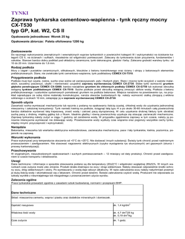 TYNKI Zaprawa tynkarska cementowo-wapienna - tynk ręczny mocny CX-T530 typ GP, kat. W2, CS II Opakowanie jednostkowe: Worek 25 kg Opakowanie zbiorcze: Paleta ofoliowana 1200 kg Zastosowanie Do ręcznego wykonywania zewnętrznych i wewnętrznych wypraw tynkarskich o powierzchni kategorii III i wytrzymałości na ściskanie kategorii CS II, na ścianach i sufitach, niezależnie od wilgotności pomieszczeń. Zalecany do tynkowania ścian przyziemia, fundamentów i cokołów. Stanowi bardzo dobry podkład pod okładziny ceramiczne, tynki dekoracyjne, gładzie i farby. Zalecana grubość warstwy tynku: od 10 do 20 mm. Uziarnienie do 1,6 mm. Rodzaj podłoża Mury z cegieł i pustaków ceramicznych, silikatowych, bloczków z betonu komórkowego oraz ściany i stropy z betonowych elementów prefabrykowanych. Stare, nie zwietrzałe tynki cementowo-wapienne, tynk podkładowy CEMEX CX-T510. Przygotowanie podłoża Podłoże musi być czyste, nośne, suche oraz wolne od zanieczyszczeń, pyłu i tłustych plam. Stare i mocne tynki oczyścić z warstw malarskich, szczeliny poszerzyć, ubytki i nierówności uzupełnić zaprawą wyrównawczą CEMEX CX-Z730. Słabe tynki wzmocnić gruntem głęboko penetrującym CEMEX CX-G880, bardzo nasiąkliwe gruntem do chłonnych podłoży CEMEX CX-G750 lub wykonać obrzutkę wstępną tynkiem podkładowym CEMEX CX-T510. Suche podłoże przed obrzutką wstępną zmoczyć obficie wodą. Podłoża z betonu prefabrykowanego i szalunków systemowych pomalować gruntem na podłoża betonowe. Miejsca narażone na powstawanie rys, na przykład sąsiadujące ze sobą różne materiały konstrukcyjne, naroża otworów budowlanych itp. należy wzmocnić siatką zbrojącą z włókna szklanego o oczkach 10 mm, zatapiając ją w zaprawie wyrównawczej CEMEX CX-Z730. Sposób użycia Zawartość worka wymieszać mechanicznie lub ręcznie z podaną na opakowaniu ilością czystej, chłodnej wody do uzyskania jednorodnej mieszaniny i założonej konsystencji. Tynk nanieść kielnią na podłoże, ściągnąć łatą typu H a po około 30-60 minutach całą powierzchnię bardzo dokładnie wyrównać łatą trapezową, zrosić wodą i zatrzeć pacą styropianową. W celu uzyskania drobnej faktury tynk obrabiać suchą pacą z drobną, miękką gąbką lub z filcem. Idealnie gładką i równą powierzchnię uzyskuje się stosując zacieraczki mechaniczne. Zaprawę tynkarską należy zużyć w ciągu 1 godziny od zarobienia wodą. W przypadku zgęstnienia zaprawy w tym czasie, należy ją ponownie intensywnie wymieszać nie dolewając wody. Przedozowanie wody wydłuży czas wiązania oraz pogorszy wszystkie cechy tynku, między innymi: przyczepność i wytrzymałość. Narzędzia Betoniarka, mieszarka lub wiertarka elektryczna wolnoobrotowa, zacieraczka mechaniczna, pace i łaty tynkarskie, kielnia, poziomica, pojemnik na zaprawę. Warunki wykonania Prace wykonywać przy temperaturze otoczenia od +5°C do +25°C. Nie dodawać innych substancji. Świeży tynk chronić przed nadmiernym przesuszeniem i zawilgoceniem. Nie stosować nagrzewnic elektrycznych (ryzyko wystąpienia rys skurczowych) ani gazowych (skurcz i procesy karbonatyzacji). Przechowywanie W oryginalnych, nieuszkodzonych opakowaniach i suchych pomieszczeniach – 12 miesięcy od daty produkcji. Chronić przed zawilgoceniem w czasie transportu i składowania. Uwagi Dane techniczne i informacje o sposobie stosowania podane są dla temperatury (20±2)°C i wilgotności względnej (65±5)%. W innych warunkach czas zużycia może ulec zmianie. Produkt działa drażniąco na oczy i drogi oddechowe. Należy stosować odpowiednie środki ochrony oczu, dróg oddechowych i skóry. Po wymieszaniu z wodą daje odczyn alkaliczny. W razie zabrudzenia oczu należy natychmiast przemyć je dużą ilością wody i skontaktować się z lekarzem. Chronić przed dziećmi. Świeże zabrudzenia czyścić wodą. Producent nie odpowiada za szkody wynikłe z nieumiejętnego lub niezgodnego z przeznaczeniem użycia wyrobu. Zalecenia ogólne Prace tynkarskie prowadzić zgodnie z zasadami sztuki budowlanej, normami i przepisami BHP. Dane techniczne Skład: mieszanina cementu, wapna i piasku oraz dodatków mineralnych i domieszek. Gęstość nasypowa ok. 1,4 kg/dm3 Właściwa ilość wody ok. 4,7 dm3/25 kg ok. 0,19 dm3/kg Czas zużycia ok. 1 godz. Absorpcja wody 2 0,5 ≤ 0,2 kg/(m ×min ) Przyczepność ≥ 0,25 MPa Reakcja na ogień klasa A1 Zawartość chlorków ≤ 0,1 % Cl Uziarnienie do 1,6 mm Wydajność ok. 16 dm3 z 25 kg ok. 0,64 dm3 z 1 kg Zużycie ok. 1,5 kg/m2/mm Trwałość mrozoodporny Na wyrób wystawiono deklarację zgodności. Dokument odniesienia: PN-EN 998-1:2012. Posiada atest PZH. PKWiU: 23.64.10.0. Zawartość chromu (VI) rozpuszczalnego w wodzie poniżej 2 ppm.
