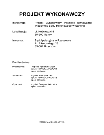 PROJEKT WYKONAWCZY Inwestycja: Projekt wykonawczy instalacji klimatyzacji w budynku Sądu Rejonowego w Sanoku Lokalizacja: ul. Kościuszki 5 35-500 Sanok Inwestor: Sąd Apelacyjny w Rzeszowie Al. Piłsudskiego 28 35-001 Rzeszów Zespół projektowy: Projektowała: mgr inż. Agnieszka Zając upr. nr PDK/0177/POOS/11 spec. sanitarna Sprawdziła: mgr inż. Katarzyna Tara upr. nr PDK/0042/POOS/12 spec. sanitarna Opracował: mgr inż. Grzegorz Kiełbowicz spec. sanitarna Rzeszów, wrzesień 2016 r. Spis zawartości opracowania I. II. III. IV. 1. 2. 3. 4. 5. 6. 7. 8. 9. 10. 11. 12. 13. 14. 15. 16. V. Strona tytułowa Spis zawartości opracowania Dokumenty formalno-prawne Opis Techniczny Spis treści Podstawa opracowania Przedmiot opracowania Zakres opracowania Opis stanu istniejącego Założone parametry projektowe Opis rozwiązania projektowanej instalacji klimatyzacji Wymagania systemu Split Instalacja chłodnicza Izolacja termiczna przewodów Instalacja odprowadzenia skroplin Dobór urządzeń Próby końcowe Eksploatacja instalacji Instalacja zasilania i sterowania Wytyczne branżowe Uwagi końcowe Część Rysunkowa Rys. nr S-1 Rys. nr S-2 VI. VII. Rzut piwnic Rzut parteru Informacja BIOZ Załączniki skala 1:100 skala 1:100 OŚWIADCZENIE PROJEKTANTA Działając zgodnie z treścią art. 20 ust. 4 ustawy z dnia 7 lipca 1994 r. – Prawo budowlane (jednolity tekst Dz. U. z 2003 r. Nr 207, poz. 2016 z późniejszymi zmianami ), oświadczam, że dokumentacja projektowa: „Projekt wykonawczy instalacji klimatyzacji w budynku Sądu Rejonowego w Sanoku” ,został sporządzony zgodnie z obowiązującymi przepisami oraz zasadami wiedzy technicznej Projektant: Projektowała: mgr inż. Agnieszka Zając upr. nr PDK/0177/POOS/11 spec. sanitarna Sprawdziła: mgr inż. Katarzyna Tara upr. nr PDK/0042/POOS/12 spec. sanitarna Opis techniczny do projektu wykonawczego instalacji klimatyzacji w budynku Sądu Rejonowego w Sanoku 1. Podstawa opracowania - Umowa z Inwestorem Nr F-271-69/16 z dnia 20.09.2016; - uzgodnienia i wytyczne Inwestora; - uzgodnienia i wytyczne międzybranżowe; - podkłady architektoniczno-budowlane; - inwentaryzacja własna; - aktualne normy i przepisy prawne; - karty katalogowe i wytyczne producentów urządzeń; - literatura branżowa. 2. Przedmiot opracowania Przedmiotem opracowania jest projekt instalacji klimatyzacji pomieszczenia serwerowni znajdującego się w budynku Sądu Rejonowego w Sanoku zlokalizowanego przy ul. Kościuszki 5. 3. Zakres opracowania Zakres opracowania obejmuje: - rzuty kondygnacji wraz z lokalizacją urządzeń; - schemat instalacji chłodniczej i elektrycznej - dobór i opis instalacji klimatyzacji, - zestawienie materiałów, - zestawienie danych technicznych projektowanych urządzeń. 4. Opis stanu istniejącego Istniejący budynek Sądu Rejonowego w Sanoku jest obiektem użyteczności publicznej. Jest to budynek o konstrukcji murowanej, składający się z następujących kondygnacji: piwnica, parter, piętro I, piętro II, strych. Obiekt kryty jest dachem wielospadowym o konstrukcji drewnianej. W budynku jest przeprowadzony remont elewacji zewnętrznej. Przed przystąpieniem do przedmiotowego opracowania przeprowadzono analizę materiałów źródłowych dotyczących budynku. Na podstawie przeprowadzonych oględzin stwierdzono, że wykonanie systemu klimatyzacji serwerowni w wybranym pomieszczeniach nie wpłynie ujemnie na obiekt. Należy zdemontować istn. urządzenie typu split: jednostka wew. w pomieszczeniu serwerowni (UPS) i jednostka zew. na południowej elewacji budynku. Dostęp do jednostki zew. od strony posesji Aresztu Śledczego w Sanoku. 5. Założone parametry projektowe Przyjęto następujące kryteria przy doborze wielkości urządzeń: Parametry powietrza zewnętrznego: - parametry powietrza zewnętrznego dla lata t = 30°C, φ = 45%, Parametry powietrza wewnętrznego: - temperatura w pomieszczeniach klimatyzowanych w okresie letnim, temperatura komfortu tzn. 4-6°C niższa od temperatury zewnętrznej, φ = wynikowa - temperatura w pomieszczeniach nieklimatyzowanych w okresie letnim, t = wynikowa, φ = wynikowa 6. Opis rozwiązania projektowanej instalacji klimatyzacji Dla pomieszczenia Serwerowni na parterze dobrano urządzenia typu SPLIT inwerterowe z funkcją Auto Restart, wyposażone w dodatkowo w grzałkę karteru sprężarki, termostat, pilot bezprzewodowy. Klimatyzator inwerter typ ścienny wyposażony w filtr jonowy i polifenolowy, o wydłużonej żywotności oraz sygnalizację świetlną (dioda) konieczności czyszczenia filtra. Klasa energetyczna A/A. 7. Wymagania systemu Split Program Funkcjonalno Użytkowy dla układu ze zmiennym przepływem czynnika chłodniczego SPLIT: • Urządzenie w klasie energetycznej nie niższej niż A/A. • Układ chłodniczy z pompą ciepła. • Czynnik chłodniczy R410A. • Jednostki zewnętrzne wyposażone w sprężarki inwerterowe – płynna regulacja wydajności grzewczej i chłodniczej. • Jednostki wewnętrzne typ ścienny wyposażone w filtry jonowe i polifenolowe. • Filtr jonowy o wydłużonej żywotności usuwa nieprzyjemne zapachy dzięki utlenianiu i redukcji jonów generowanych na powierzchni drobnych elementów ceramicznych. • Filtr polifenolowy absorbuje drobne cząstki kurzu, zarodniki grzybów oraz szkodliwe mikroorganizmy dzięki zjawiskom elektrostatyki. Dalszemu rozwojowi bakterii zapobiegają związki polifenolu ekstrahowanego z jabłek. • Jednostki wewnętrzne typ ścienny szerokość max 1 metr. • Minimum cztery stopnie regulacji wydajności jednostek wewnętrznych. • Piloty bezprzewodowe, 4 różne warianty programatora do wyboru (czas włączenia / czas wyłączenia / program / program nocny) ze ściennym uchwytem montażowym • Automatyczna regulacja strumienia powietrza. • Auto Restart. • Automatyczna zmiana trybu pracy. • Tryb ekonomiczny. • Kontrolka czyszczenia filtra, sygnalizacja. • Zmywalny panel obudowy. • Program nocny. • Cena urz