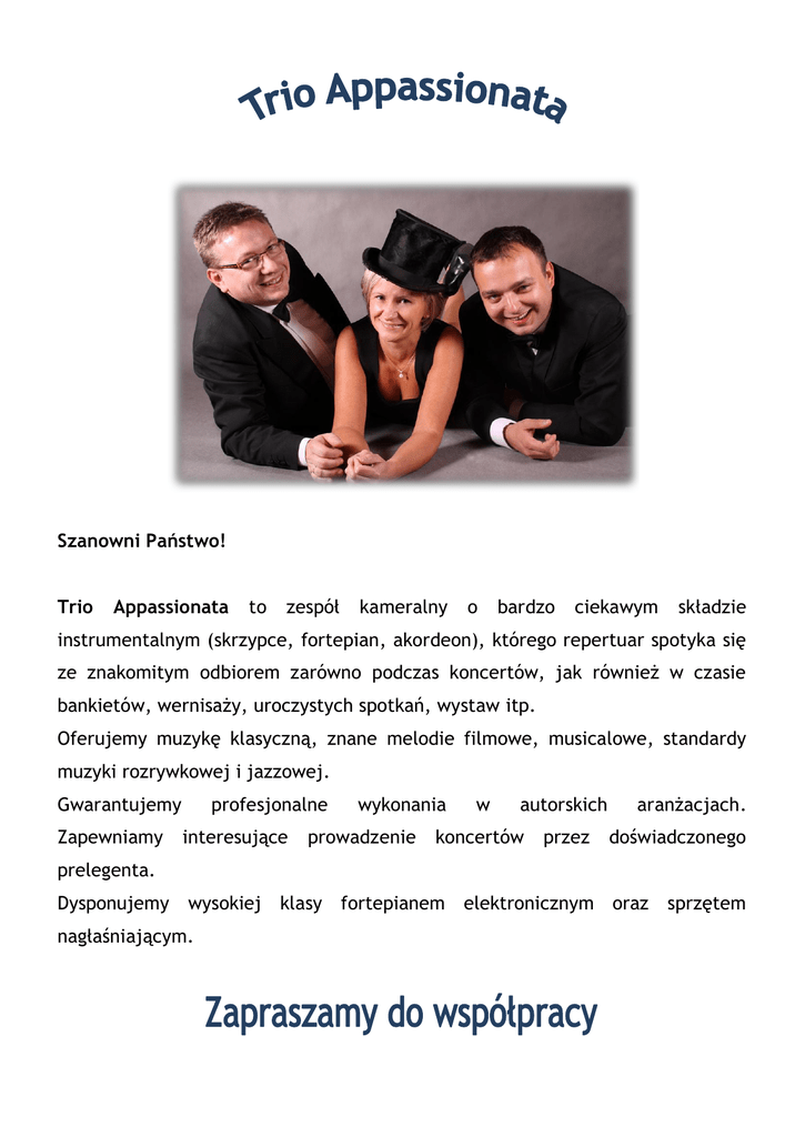 Szanowni Państwo! Trio Appassionata to zespół kameralny o bardzo ciekawym składzie instrumentalnym (skrzypce, fortepian, akordeon), którego repertuar spotyka się ze znakomitym odbiorem zarówno podczas koncertów, jak również w czasie bankietów, wernisaży, uroczystych spotkań, wystaw itp. Oferujemy muzykę klasyczną, znane melodie filmowe, musicalowe, standardy muzyki rozrywkowej i jazzowej. Gwarantujemy Zapewniamy profesjonalne interesujące wykonania prowadzenie w autorskich koncertów przez aranżacjach. doświadczonego prelegenta. Dysponujemy wysokiej klasy fortepianem elektronicznym oraz nagłaśniającym. sprzętem KLAUDIA KRAUSE - fortepian Absolwentka Wydziału Kompozycji, Dyrygentury i Teorii Muzyki Akademii Muzycznej w Katowicach. Autorka szeregu aranżacji na zespoły kameralne i orkiestrowe. Jako aranżer współpracuje ze śląskimi orkiestrami kameralnymi m.in. Rudzką Orkiestrą Kameralną i Cameratą Impuls. Pedagog Zespołu Szkół Muzycznych I i II stopnia w Rudzie Śląskiej w zakresie przedmiotów teoretycznych. Twórca wszystkich opracowań utworów wykonywanych przez Trio Appassionata. ŁUKASZ GRABIŃSKI - skrzypce Absolwent Akademii Muzycznej im. Karola Szymanowskiego w Katowicach. Stypendysta Fundacji Gustava Mahlera. Członek Gustav Mahler Jugendorchester. Od 2003 roku muzyk Filharmonii Śląskiej i nauczyciel Zespołu Szkół Muzycznych I i II stopnia w Rudzie Śląskiej. Członek orkiestry Camerata Impulse. Współpracuje z wieloma zespołami kameralnymi, m.in. Śląską Orkiestrą Kameralną i Rudzką Orkiestrą Kameralną. MIROSŁAW KRAUSE - akordeon Absolwent Akademii Muzycznej im. Karola Szymanowskiego w Katowicach. Współzałożyciel i członek zarządu Rudzkiego Towarzystwa Muzycznego. Laureat konkursów akordeonowych. Prelegent - autor licznych audycji muzycznych dla dzieci i młodzieży. Od 1990 roku pedagog Zespołu Szkół Muzycznych I i II stopnia w Rudzie Śląskiej - od września 2007 roku na stanowisku dyrektora. BERNADETA STAŃCZYK - słowo Absolwentka Wydziału Instrumentalnego Akademii Muzycznej im. Karola Szymanowskiego w Katowicach. Od 1993 r. pracuje w ZPSM - Państwowej Ogólnokształcącej Szkole Muzycznej II stopnia im. K. Szymanowskiego w Katowicach, od roku 2010 na stanowisku kierownika sekcji fortepianu. Prelegentka, tłumaczka kursów i warsztatów muzycznych, autorka licznych projektów koncertowych oraz cyklu kameralnych wieczorów muzycznych. Na repertuar zespołu składa się kilkanaście programów. Każdy z nich stanowi zamkniętą całość pod względem tematycznym, stylistycznym lub historycznym. Wszystkie wykonywane przez Trio Appassionata utwory mają autorskie aranżacje. AMERYKA, AMERYKA Program kompozytorów. złożony z kompozycji Odnajdziemy w nim amerykańskich fragmenty muzyki filmowej ze słynnym „Moon River”, najbardziej znane tematy jazzowe, z jak największych „My Way” musicali, Franka wśród Sinatry których nie oraz suity zabraknie „Skrzypka na dachu”. Ze względu na wielką popularność większości prezentowanych utworów program spotyka się z dużym zainteresowaniem słuchaczy, którzy oprócz muzyki usłyszą wiele ciekawostek i anegdot. DZWIĘKI ZZA WSCHODNIEJ GRANICY Piotr Czajkowski, Aram Chaczaturian, Mikołaj Rimski – Korsakow i wielu innych kompozytorów tworzących za naszą wschodnią granicą przyczyniło się znacząco w tworzeniu historii muzyki. Program zawiera fragmenty najpopularniejszych kompozycji powstałych w tym rejonie świata nawiązując do ich charakterystycznej stylistyki. Takie tytuły jak: „Taniec z szablami”, „Jezioro łabędzie” czy „Romeo i Julia” rozpoznawalne są już od pierwszych dźwięków. Całość koncertu wieńczy artystycznie opracowana wiązanka popularnych melodii „Kalinka” i „Katiusza”. JAK ZA DAWNYCH LAT Koncert niezapomnianych piosenek „Jak za dawnych lat” jest projektem zrealizowanym wspólnie ze znakomitymi solistami: Beatą Mańkowską – mezzosopran i Jarosławem Wewiórą – tenor. Przypomnimy słuchaczom popularne piosenki z okresu międzywojennego, których klimat doskonale oddaje charakterystyczny skład zespołu. Lekkości i humoru dodaje dowcipna konferansjerka, w której znajdzie się wiele ciekawostek z życia gwiazd lat 20 – tych i 30 – tych ubiegłego stulecia. Podczas półtoragodzinnego koncertu usłyszymy m.in. „Brunetki, blondynki”, „Tango Milonga”, „Nie kochać w taką noc to grzech” w aranżacjach, w które Klaudia Krause tchnęła nowego ducha. MAGIA TANGA Jeszcze jeden projekt wokalno-instrumentalny wykonywany wspólnie z Beatą Mańkowską i Jarosławem Wewiórą. Zapraszamy na 90 minutowy muzyczny spektakl, podczas którego przeniesiemy się w magiczny świat tanga. Słuchacze usłyszą historię tego wyjątkowego gatunku opowiedzianą muzyką, poznają ciekawostki z życia jego największych twórców, ale przede wszystkich ujrzą kilka odsłon stylistycznych jednego z najpopularniejszych tańców świata. Od rozpoznawalnego już po kilku dźwiękach „Tanga Milonga”, poprzez sławione przez Argentyńczyków po dziś dzień kompozycje Carlosa Gardela ze wspaniałym tematem z filmu „Zapach kobiety”, aż po wyszukane, pełne napięcia kompozycje Astora Piazzolli, wśród których nie zabraknie słynnego „Adios Nonino”. Prezentowana podczas koncertu muzyka tworzy niezwykle urozmaicony stylistycznie klimat powiązany wspólnym mianownikiem – MAGIĄ TANGA. MUZYKA SZKLANEGO EKRANU Podczas koncertu zabieramy słuchaczy w muzyczną podróż wspomnień związanych z najpopularniejszymi w historii telewizji tematami muzycznymi. Nie sięgnęliśmy jednak do twórców kina światowego. Oparliśmy program głównie na muzyce polskiej, zakorzenionej w pamięci telewidzów. Nawet najmłodsi słuchacze bez problemu rozpoznają melodie z takich seriali, jak „Janosik” czy „Czterdziestolatek”. Romantycznego charakteru dodaje m.in. temat przewodni z „Polskich dróg