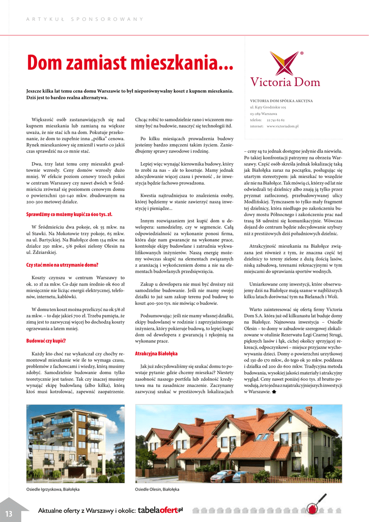 A R T Y K U Ł S P O N S O R O W A N Y Dom zamiast mieszkania... Jeszcze kilka lat temu cena domu Warszawie to był nieporównywalny koszt z kupnem mieszkania. Dziś jest to bardzo realna alternatywa. VICTORIA DOM SPÓŁKA AKCYJNA ul. Kąty Grodziskie 105 03-289 Warszawa Większość osób zastanawiających się nad kupnem mieszkania lub zamianą na większe uważa, że nie stać ich na dom. Pokutuje przekonanie, że dom to zupełnie inna „półka” cenowa. Rynek mieszkaniowy się zmienił i warto co jakiś czas sprawdzić na co mnie stać. Chcąc robić to samodzielnie rano i wiczorem musimy być na budowie, nauczyć się technologii itd. Dwa, trzy latat temu ceny mieszakń gwałtownie wzrosły. Ceny domów wzrosły dużo mniej. W efekcie poziom cenowy trzech pokoi w centrum Warszawy czy nawet dwóch w Śródmieściu zrównał się poziomem cenowym domu o powierzchni 130-140 mkw. zbudowanym na 200-300 metowej działce. Lepiej więc wynająć kierownika budowy, który to zrobi za nas – ale to kosztuje. Mamy jednak zdecydowanie więcej czasu i pewność , że inwestycja będzie fachowo prowadzona. Sprawdźmy co możemy kupić za 600 tys. zł. W Śródmieściu dwa pokoje, ok 55 mkw. na ul Stawki. Na Mokotowie trzy pokoje, 65 mkw. na ul. Bartyckiej. Na Białołęce dom 134 mkw. na działce 250 mkw., 5/6 pokoi zielony Olesin na ul. Ździarskiej. Czy stać mnie na utrzymanie domu? Koszty czynszu w centrum Warszawy to ok. 10 zł za mkw. Co daje nam średnio ok 600 zł miesięcznie nie licżąc energii elektrycznej, telefonów, internetu, kablówki. W domu ten koszt można przeliczyć na ok 5/6 zł za mkw. – to daje jakieś 700 zł. Trzeba pamięta, że zimą jest to zazwyczaj więcej bo dochodzą koszty ogrzewania a latem mniej. Budować czy kupić? 13 Po kilku miesiącach prowadzenia budowy jesteśmy bardzo zmęczeni takim życiem. Zaniedbujemy sprawy zawodowe i rodzinę. Kwestia najtrudniejsza to znalezienia osoby, której będziemy w stanie zawierzyć naszą inwestycję i pieniądze... Innym rozwiązaniem jest kupić dom u dewelopera: samodzielny, czy w segmencie. Całą odpowiedzialność za wykonanie ponosi firma, która daje nam gwarancje na wykonane prace, kontroluje ekipy budowlane i zatrudnia wykwalifikowanych inżynierów. Naszą energię możemy wówczas skupić na elementach związanych z aranżacją i wykończeniem domu a nie na elementach budowlanych przedsięwzięcia. Zakup u dewelopera nie musi być droższy niż samodzielne budowanie. Jeśli nie mamy swojej działki to już sam zakup terenu pod budowę to koszt 400-500 tys. nie mówiąc o budowie. Podsumowując: jeśli nie mamy własnej działki, ekipy budowlanej w rodzinie i zaprzyjaźnionego inżyniera, który pokieruje budową, to lepiej kupić dom od dewelopera z gwarancją i rękojmią na wykonane prace. Każdy kto choć raz wykańczał czy choćby remontował mieszkanie wie ile to wymaga czasu, problemów z fachowcami i wiedzy, którą musimy zdobyć. Samodzielnie budowanie domu tylko teoretycznie jest tańsze. Tak czy inaczej musimy wynająć ekipę budowlaną (albo kilka), którą ktoś musi kotrolować, zapewnić zaopatrzenie. Atrakcyjna Białołęka Osiedle Igrzyskowa, Białołęka Osiedle Olesin, Białołęka Jak już zdecydowaliśmy się szukać domu to powstaje pytanie: gdzie chcemy mieszkać? Niestety zasobność naszego portfela lub zdolność kredytowa ma tu zasadnicze znaczenie. Zaczynamy zazwyczaj szukać w prestiżowych lokalizacjach Aktualne oferty z Warszawy i okolic: telefon: 22 741 62 62 internet: www.victoriadom.pl – ceny są tu jednak dostępne jedynie dla niewielu. Po takiej konfrontacji patrzymy na obrzeża Warszawy. Część osób skreśla jednak lokalizację taką jak Białołęka zaraz na początku, posługując się utartym stereotypem: jak mieszkać to wszędzie ale nie na Białołęce. Tak mówią ci, którzy od lat nie odwiedzali tej dzielnicy albo znają ją tylko przez pryzmat zatłoczonej, przebudowywanej ulicy Modlińskiej. Tymczasem to tylko mały fragment tej dzielnicy, która niedługo po zakończeniu budowy mostu Północnego i zakończeniu prac nad trasą S8 udrożni się komunikacyjnie. Wówczas dojazd do centrum będzie zdecydowanie szybszy niż z prestiżowych dziś południowych dzielnic. Atrakcyjność mieszkania na Białołęce związana jest również z tym, że znaczna część tej dzielnicy to tereny zielone z dużą ilością lasów, niską zabudową, terenami rekreacyjnymi w tym miejscami do uprawiania sportów wodnych. Umiarkowane ceny inwestycji, które obserwujemy dziś na Białołęce mają szanse w najbliższych kilku latach dorównać tym na Bielanach i Woli. Warto zainteresować się ofertą firmy Victoria Dom S.A. która już od kilkunastu lat buduje domy na Białołęce. Najnowsza inwestycja – Osiedle Olesin – to domy w zabudowie szeregowej zlokalizowane w otulinie Rezerwatu Łegi Czarnej Strugi, pięknych lasów i łąk, cichej okolicy sprzyjącej rekreacji, odpoczynkowi – miejsce przyjazne wychowywaniu dzieci. Domy o powierzchni urzytkowej od 130 do 170 mkw., do tego ok 30 mkw. poddasza i działka od 200 do 600 mkw. Tradycyjna metoda budowania, wysokiej jakości materiały i atrakcyjny wygląd. Ceny nawet poniżej 600 tys. zł brutto powodują, że to jedna z najatrakcyjniejszych inwestycji w Warszawie.