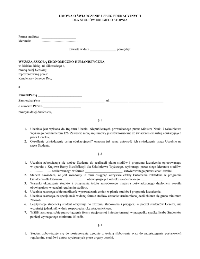 UMOWA O ŚWIADCZENIE USŁUG EDUKACYJNYCH DLA STUDIÓW DRUGIEGO STOPNIA Forma studiów: _____________________ kierunek: ……………………………. zawarta w dniu ________________ pomiędzy: WYŻSZĄ SZKOŁĄ EKONOMICZNO-HUMANISTYCZNĄ w Bielsku-Białej, ul. Sikorskiego 4, zwaną dalej Uczelnią, reprezentowaną przez: Kanclerza – Jerzego Dec, a Panem/Panią ___________________________ Zamieszkałą/ym _______________________________________, ul. ___________ _____________________ o numerze PESEL _______________________ zwanym dalej Studentem, §1 1. 2. Uczelnia jest wpisana do Rejestru Uczelni Niepublicznych prowadzonego przez Ministra Nauki i Szkolnictwa Wyższego pod numerem 126. Zawarcie niniejszej umowy jest równoznaczne ze świadczeniem usług edukacyjnych przez Uczelnię. Określenie „świadczenie usług edukacyjnych” oznacza już samą gotowość ich świadczenia przez Uczelnię na rzecz Studenta. §2 1. 2. 3. 4. 5. 6. 7. Uczelnia zobowiązuje się wobec Studenta do realizacji planu studiów i programu kształcenia opracowanego w oparciu o Krajowe Ramy Kwalifikacji dla Szkolnictwa Wyższego, wybranego przez niego kierunku studiów, ………………., realizowanego w formie _______________________ zatwierdzonego przez Senat Uczelni. Student oświadcza, że jest świadomy iż musi osiągnąć wszystkie efekty kształcenia zakładane w programie kształcenia dla kierunku …………………. obowiązujących od roku akademickiego ………………... Warunki ukończenia studiów i otrzymania tytułu zawodowego magistra poświadczonego dyplomem określa obowiązujący w uczelni regulamin studiów. Uczelnia zastrzega sobie możliwość wprowadzania zmian w planie studiów i programie kształcenia. Uczelnia zastrzega, że specjalność w danej formie studiów zostanie uruchomiona jeżeli zbierze się grupa minimum 20 osób. Legitymację studencką student otrzymuje po złożeniu ślubowania i przyjęciu w poczet studentów Uczelni, nie wcześniej jednak niż w dniu rozpoczęcia roku akademickiego. WSEH zastrzega sobie prawo łączenia formy stacjonarnej i niestacjonarnej w przypadku spadku liczby Studentów poniżej wymaganego minimum 15 osób. §3 1. Student zobowiązuje się do postępowania zgodnie z treścią ślubowania oraz do przestrzegania postanowień regulaminu studiów i aktów wydawanych przez organy uczelni. 2. 3. Student oświadcza, że zapoznał się z regulaminem studiów, a także regulaminem odpłatności za studia, oraz że akceptuje ich postanowienia. Student wyraża zgodę na przetwarzanie swoich danych osobowych oraz publikacji wizerunku w taki sposób jaki konieczny jest do realizacji przedmiotu niniejszej umowy wg procedur stosowanych przez uczelnię, w tym procedur informacyjnych mających na celu kształtowanie wizerunku uczelni jako instytucji funkcjonującej publicznie. Student ma prawo wglądu do swoich danych oraz ich poprawienia. §4 1. Nauka w uczelni jest płatna. 2. Warunki odpłatności określa regulamin odpłatności za studia. 1. Student oświadcza, że przyjmuje warunki odpłatności za odbywanie studiów obowiązujące w uczelni zgodnie z aktualnym regulaminem odpłatności za studia i zobowiązuje się wpłacić na rzecz uczelni, opłaty za odbywanie studiów w wysokościach i w terminach określonych w załączniku nr 1 do umowy. 2. Student zobowiązuje się uiszczać w terminach i na zasadach ustalonych przez uczelnię opłaty z tytułu: zaświadczenie 20,00 zł zaświadczenie dla absolwentów 30,00 zł zaświadczenie z wykazem ocen 70,00 zł opłata biblioteczna 8,00 zł wpis warunkowy 350,00 zł powtarzanie zajęć 300,00 zł przedłużenie sesji 200,00 zł §5 1. Wszystkie opłaty, student zobowiązany jest wpłacać na rachunek bankowy uczelni w Banku Handlowym w Warszawie nr konta: 58 1030 0019 0109 8503 0009 7975. 2. W przypadku uiszczania należności, o których mowa w § 4 na rachunek bankowy uczelni, za datę uregulowania należności uważa się datę wpływu na konto uczelni. 3. W przypadku nieterminowych wpłat należności wynikających z regulaminu odpłatności za studia oraz niniejszej umowy, student zobowiązany jest do uiszczenia odsetek w wysokości 0,03% od zaległej kwoty za każdy dzień opóźnienia, nie więcej jednak niż wysokość odsetek maksymalnych za opóźnienie według kodeksu cywilnego. 4. Dodatkowe opłaty nie uregulowane w niniejszej umowie student zobowiązuje się ponosić na zasadach określonych w regulaminie odpłatności za studia. §6 1. W przypadku nie podjęcia studiów lub przerwania nauki student zobowiązany jest do złożenia pisemnej rezygnacji. Brak takiego oświadczenia jest równoznaczny z utrzymywaniem przez studenta statusu studenta uczelni i obliguje studenta do regulowania zobowiązań finansowych określonych w niniejszej umowie, aż do miesiąca skreślenia studenta z listy studentów zgodnie z niniejszą umową lub regulaminem studiów włącznie. 2. Jeżeli student nie uiści którejkolwiek z należności, o których mowa w § 4 w okresie dwóch miesięcy od daty, w którym należności te powinny zostać uiszczone, uczelnia może skreślić studenta z listy studentów uczelni i rozwiązać niniejszą umowę. §7 1. 2. 3. Wpisanie studenta na listę studentów uczelni nastąpi z dniem rozpoczęcia roku akademickiego, po uiszczeniu przez studenta opłaty za postępowanie związane z przyjęciem na studia, po podpisaniu niniejszej umowy oraz przyjęciu w poczet studentów uczelni i złożeniu przez studenta ślubowania. Wszelką korespondencję do studenta uczelnia kierować będzie na adres zamieszkania podany w niniejszej umowie. Powyższe postanowienie nie dotyczy odpowiedzi na podania studenta, które student obowiązany jest odbierać w uczelni osobiście. O każdej zmianie adresu zamieszkania student zobowiązany jest niezwłocznie zawiadomić uczelnię pisemnie, pod rygorem uznania za doręczone pism wysłanych do studenta zgodnie z postanowieniem ust. 2. §8 1