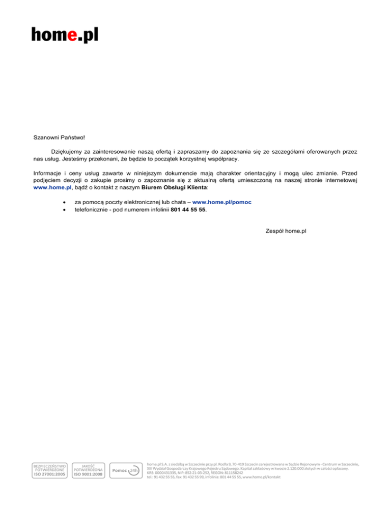 Szanowni Państwo! Dziękujemy za zainteresowanie naszą ofertą i zapraszamy do zapoznania się ze szczegółami oferowanych przez nas usług. Jesteśmy przekonani, że będzie to początek korzystnej współpracy. Informacje i ceny usług zawarte w niniejszym dokumencie mają charakter orientacyjny i mogą ulec zmianie. Przed podjęciem decyzji o zakupie prosimy o zapoznanie się z aktualną ofertą umieszczoną na naszej stronie internetowej www.home.pl, bądź o kontakt z naszym Biurem Obsługi Klienta: • • za pomocą poczty elektronicznej lub chata – www.home.pl/pomoc telefonicznie - pod numerem infolinii 801 44 55 55. Zespół home.pl O firmie Firma home.pl działa na rynku usług internetowych od września 1997 r. Obecnie formą działalności jest S.A., a dynamika przychodów firmy wykazuje stałą tendencję wzrostową. Serwery home.pl utrzymywane są w dwóch największych polskich Data Center firmy GTS Poland. Data Center zapewniają nam łączność z największymi sieciami w Polsce, Europie i na całym świecie. Z siecią szkieletową GTS połączeni jesteśmy dwoma niezależnymi łączami o przepustowości 10Gbit/s każde. Posiadamy również łącza 1Gbit/s do punktów wymiany ruchu WIX (Warszawski Punkt Wymiany Ruchu), i 10Gbit/s do punktu PLIX. Wymieniamy ruch z takimi sieciami jak: Netia, Polkomtel, Polska Telefonia Cyfrowa, ATMAN, Crowley Data Poland, ICP, UPC Polska oraz wiele innych. Dodatkowo dysponujemy bardzo wydajnym łączem o przepustowości 10 Gbit/s do firmy Level3, które pozwala na skuteczną obsługę ruchu realizowanego z zagranicą oraz stanowi dodatkowe zabezpieczenie w przypadku awarii łącz głównych. Usługi naszych Klientów utrzymywane są w ramach klastra złożonego z blisko 1000 platform serwerowych firmy HP, Tyan, Chenbro oraz SuperMicro. Serwery posiadają od 1 do 4 procesorów, macierze dyskowe o wielkości do 32 TB i od 1 do 64 GB pamięci operacyjnej. Szkielet sieci jest wewnątrz spięty w 10 GB sieć Ethernet o zdublowanej architekturze, obsługiwana przez przełączniki i routery firmy Cisco oraz Brocade. Ochronę danych zapewnia 30 serwerów kopii zapasowych, rozmieszczonych w dwóch różnych punktach Polski. Łączna pojemność tych serwerów wynosi 400 TB. Pozwala to na utrzymanie kopii zapasowych danych z kont naszych Klientów przez okres trzech dni. Data Center zapewnia niezależne linie zasilające, generatory prądu oraz UPS w celu zagwarantowania ciągłego dopływu energii do wszystkich naszych urządzeń. Ważną częścią Data Center jest także system klimatyzacji, który zapewnia optymalne warunki pracy serwerów. Wiodąca pozycja home.pl została potwierdzona przez NASK (Naukową i Akademicką Sieć Komputerową) w niezależnym raporcie podsumowującym drugi kwartał 2012 – „Rynek nazw domeny .pl Q2 2012”. Zgodnie z opublikowanym raportem firma obsługiwała ponad 485 548 domen z końcówką .pl, co stanowiło 20.46% udziału w rynku. W 2004 r. home.pl wdrożyła i utrzymuje system zarządzania jakością w oparciu o normę ISO 9001:2008. Coroczna certyfikacja systemu przez BSI potwierdza najwyższy poziom zapewnianego serwisu. Wśród polskich dostawców usług hostingowych home.pl jest pierwszą i jedyną firmą dysponującą tego typu osiągnięciem. W 2009 r. home.pl, jako pierwsza firma hostingowa w Polsce, uzyskała certyfikat potwierdzający spełnienie rygorystycznych wymagań normy ISO 27001:2005 wydany przez BSI największą jednostkę certyfikującą systemy bezpieczeństwa informacji w kraju. Przy każdym zakupie dokonanym w home.pl zbierasz punkty, które możesz wymieniać na atrakcyjne nagrody. Za każdy wydany 1 złoty otrzymasz 1 punkt PAYBACK. Możesz również korzystać z atrakcyjnych promocji i zdobyć wiele dodatkowych punktów promocyjnych. Serwis WWW Serwis WWW to dziś podstawowy element komunikacji z otoczeniem i szansa na wykorzystanie potencjału, jaki oferuje Internet - zwiększenie sprzedaży Twoich produktów i usług, a także możliwość budowania nowoczesnego wizerunku firmy. Posiadając serwis WWW Twoja firma jest otwarta 24h/ dobę, zawsze wtedy kiedy chce tego Klient. Nasza oferta to szeroki wybór najwyższej jakości usług, z których obecnie korzysta już ponad milion Użytkowników. Zależy nam na starannym dopasowaniu naszych usług do potrzeb i wymagań Klientów. Dlatego też, aby móc dostarczać rozwiązania, które spełniają oczekiwania zarówno właścicieli nieskomplikowanych stron internetowych, jak i osób realizujących wymagające, zaawansowane projekty, naszą ofertę hostingową podzieliliśmy na Linię Ekonomiczną oraz Linię Profesjonalną. Zapoznaj się z naszą ofertą, wybierz usługę odpowiadającą Twoim potrzebom i dołącz do grona naszych Klientów. Ogólne uwagi dotyczące eksploatacji kont w sieci home.pl Każde z oferowanych przez nas kont jest tworzone automatycznie, po wypełnieniu krótkiego formularza na stronach WWW. Użytkownik zobowiązany jest do szczegółowego zapoznania się z Regulaminem sieci (http://home.pl/regulaminy). Bezpłatny okres próbny trwa 14 dni od chwili zarejestrowania. W tym czasie Użytkownik może przetestować wszystkie parametry konta bez podejmowania jakichkolwiek zobowiązań ze swojej strony. Konto w trakcie okresu próbnego nie posiada żadnych ograniczeń. W okresie 14 dni od rejestracji Użytkownik podejmuje decyzję o jego dalszym użytkowaniu. W tym czasie pocztą otrzymuje przesyłkę zawierającą fakturę pro forma, która zawiera także krótki opis kwestii formalnych (opłaty, długość abonamentu itp.). Po otrzymaniu wpłaty - niezwłocznie wystawiamy fakturę VAT, będącą dowodem transakcji. Zwracamy uwagę, że jest to faktura za usługi telekomunikacyjne, a więc nie wymaga podpisu odbiorcy. Linia Ekonomiczna Dobry start dla Twojego biznesu Oferta przygotowana przede wszystkim z myślą o tych, którzy prowadząc biznes w Internecie od początku chcą korzystać ze sprawdzonych i be
