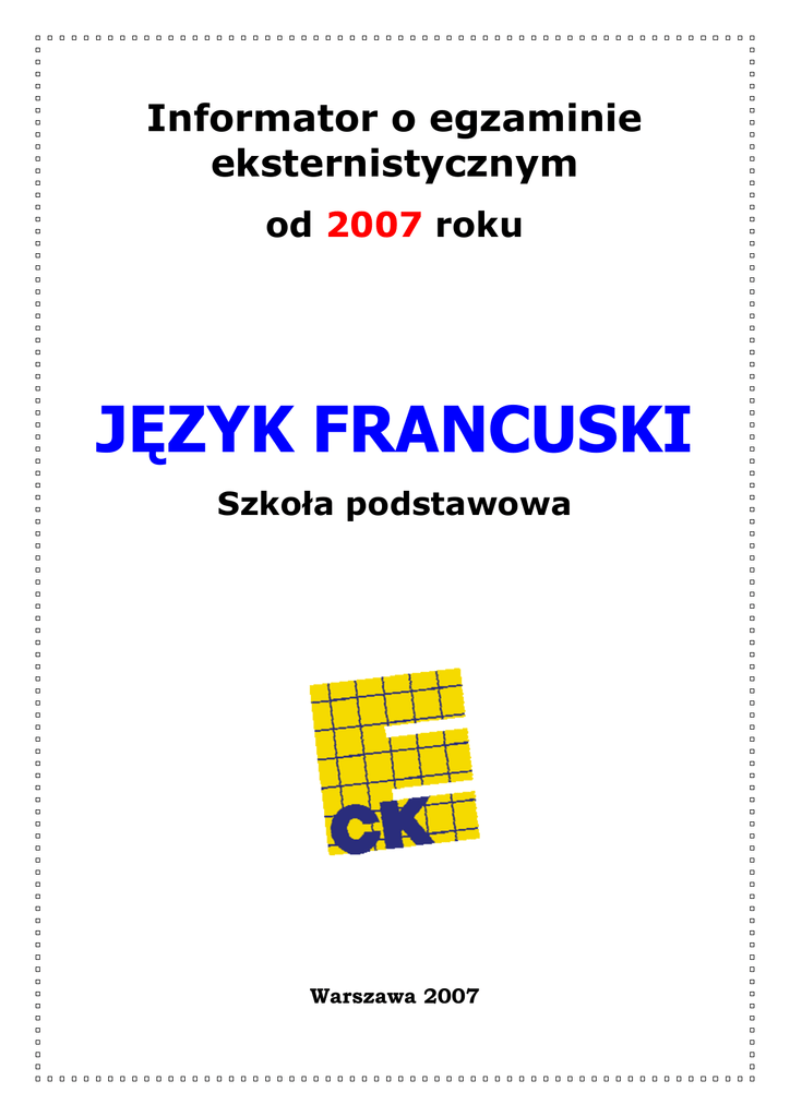 Informator o egzaminie eksternistycznym od 2007 roku JĘZYK FRANCUSKI Szkoła podstawowa Warszawa 2007 Opracowano w Centralnej Komisji Egzaminacyjnej we współpracy z Okręgową Komisją Egzaminacyjną w Warszawie SPIS TREŚCI I. Informacje ogólne ..................................................................................... 5 II. Standardy wymagań egzaminacyjnych ........................................................ 7 III. Opis egzaminu...................................................................................... 11 IV. Przykładowy arkusz egzaminacyjny.......................................................... 13 3 I. INFORMACJE OGÓLNE Podstawy prawne Egzaminy eksternistyczne, jako sposób uzyskiwania świadectwa ukończenia szkoły, zostały ograniczone do zakresu szkół ogólnokształcących, tj. sześcioletniej szkoły podstawowej, gimnazjum i liceum ogólnokształcącego. Zgodnie z art. 9a ust. 2 i 9c ust. 2 Ustawy z dnia 7 września 1991 r. o systemie oświaty (DzU z 2004 r., nr 256, poz. 2572, z późn. zm.) przygotowanie i przeprowadzanie egzaminów eksternistycznych zostało powierzone Centralnej Komisji Egzaminacyjnej (CKE) i okręgowym komisjom egzaminacyjnym (OKE). Sposób przygotowania i przeprowadzania egzaminów eksternistycznych reguluje Rozporządzenie Ministra Edukacji Narodowej z dnia 18 września 2007 r. w sprawie egzaminów eksternistycznych (DzU nr 179, poz. 1273). Na podstawie cytowanego rozporządzenia CKE i OKE opracowały Procedury organizowania i przeprowadzania egzaminów eksternistycznych z zakresu sześcioletniej szkoły podstawowej dla dorosłych, gimnazjum dla dorosłych, liceum ogólnokształcącego dla dorosłych. Zakres sprawdzanych wiadomości i umiejętności określają standardy wymagań egzaminacyjnych będące podstawą przeprowadzania egzaminów eksternistycznych z zakresu szkoły podstawowej dla dorosłych, które są załącznikiem nr 1. do Rozporządzenia Ministra Edukacji Narodowej z dnia 27 września 2007 r. w sprawie standardów wymagań będących podstawą przeprowadzania egzaminów eksternistycznych (DzU nr 184, poz. 1309). Warunki przystąpienia do egzaminów eksternistycznych Do egzaminów eksternistycznych z zakresu sześcioletniej szkoły podstawowej dla dorosłych może przystąpić osoba, która: • ukończyła 18 lat • nie jest uczniem szkoły podstawowej • nie ukończyła sześcioletniej szkoły podstawowej lub ukończyła klasę programowo niższą niż klasa VI ośmioletniej szkoły podstawowej. Osoba, która chce zdawać egzaminy eksternistyczne i spełnia wyżej wymienione warunki, powinna dwa miesiące przed sesją jesienną lub zimową złożyć w OKE właściwej swemu miejscu zamieszkania: • oświadczenie, że nie jest uczniem (słuchaczem) szkoły podstawowej • kserokopię stron dowodu osobistego zawierających datę urodzenia i numer ewidencyjny PESEL • wniosek o dopuszczenie do egzaminu eksternistycznego. Formularz wniosku znajduje się na stronach internetowych CKE i OKE w formie załącznika do procedur. Miesiąc przed rozpoczęciem sesji egzaminacyjnej osoba dopuszczona do egzaminu składa w OKE deklarację, w której wskazuje, z jakich przedmiotów chce zdawać egzaminy w danej sesji i przedkłada dowód opłaty za te egzaminy. Informacji o kosztach egzaminu udziela OKE. 5 II. WYMAGANIA EGZAMINACYJNE A) STANDARDY WYMAGAŃ EGZAMINACYJNYCH I. WIADOMOŚCI Zdający zna: 1) podstawowe słownictwo umożliwiające odbiór i formułowanie tekstów, zapewniające minimum komunikacji językowej w sytuacjach życia codziennego, 2) podstawowe struktury teraźniejszości i gramatyczne przyszłości stosowane umożliwiające do odbiór i wyrażania przeszłości, formułowanie tekstów, zapewniające minimum komunikacji językowej w sytuacjach życia codziennego, 3) podstawowe realia socjokulturowe danego obszaru językowego. II. UMIEJĘTNOŚCI 1. Odbiór tekstu czytanego Zdający potrafi: 1) określić główną myśl tekstu, 2) określić główną myśl poszczególnych części tekstu, 3) stwierdzić, czy tekst zawiera określone informacje; wyszukać lub wyselekcjonować informacje, 4) określić kontekst sytuacyjny. 2. Reagowanie językowe Zdający potrafi: 1) właściwie reagować językowo w określonych kontekstach sytuacyjnych, w szczególności w celu uzyskania, udzielenia, przekazania lub odmowy udzielenia informacji, rozpoczęcia, podtrzymania i zakończenia rozmowy, 2) rozpoznać i poprawnie stosować struktury leksykalno-gramatyczne, adekwatnie do sytuacji komunikacyjnej, 3) przetworzyć treści tekstu przeczytanego w języku polskim lub treści przedstawione w materiale ikonograficznym i wyrazić je w języku obcym. 7 B) ZAKRES STRUKTUR LEKSYKALNO-GRAMATYCZNYCH I. Rzeczownik 1. Liczba pojedyncza i mnoga (np.: ami/amis, journal/journaux). 2. Rodzaj męski i żeński (np.: ami/amie). II. Rodzajnik 1. Rodzajnik nieokreślony un, une, des. 2. Rodzajnik określony le, la, l’, les; rodzajnik ściągnięty z przyimkiem à i de. 3. Rodzajnik cząstkowy du, de la, de l’, des. III. Zaimek przymiotny 1. Zaimek wskazujący (np.: ce, ces). 2. Zaimek dzierżawczy (np.: mon, sa). 3. Zaimek pytający (np.: quel, quelles). IV. Liczebnik 1. Liczebnik główny 1-100. V. Przymiotnik 1. Liczba pojedyncza i mnoga (np.: grand/grands, beau/beaux). 2. Rodzaj męski i żeński (np.: grand/grande, beau/ belle). 3. Stopniowanie regularne (np.: petit/plus petit/le plus petit). VI. Zaimek rzeczowny 1. Zaimek osobowy podmiotu (np.: je, on). 2. Zaimek osobowy zwrotny (np.: me, te). 3. Zaimek osobowy akcentowany (np.: moi, toi). 4. Zaimek pytający (np.: qui, qu’est-ce que). 5. Zaimek względny prosty qui, que. VII. Czasownik 1. Czasownik grupy I, II, III (np.: parler, finir, prendre, faire, aller). 2. Czasownik zwrotny (np.: se laver). 3. Czasownik posiłkowy être, avoir. 4. Tryby i czasy: - indicatif présent (np.: je pense), - indicatif passé récent (np.: je viens de rentrer), - indicatif passé compos