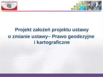 Projekt założeń projektu ustawy o zmianie ustawy– Prawo geodezyjne i kartograficzne Główne determinanty nowelizacji Wyrok Trybunału Konstytucyjnego z dnia 25 czerwca 2013 r. sygn. akt K 30/12, ogłoszony w dniu 11 lipca 2013 r. (Dz. U. z 2013 r. , poz. 805) I. Art. 40 ust. 5 pkt 1 lit. b ustawy z dnia 17 maja 1989 r. – Prawo geodezyjne i kartograficzne (Dz. U. z 2010 r. Nr 193,poz. 1287) jest niezgodny z art. 92 ust. 1 i art. 217 Konstytucji Rzeczypospolitej Polskiej. II. Przepis wymieniony w części I traci moc obowiązującą z upływem 12 (dwunastu) miesięcy od dnia ogłoszenia wyroku Stanowisko Komitetu Rady Ministrów do Spraw Informatyzacji i Łączności wyrażone w dniu 26 sierpnia 2008 r. - niezbędne jest wyeliminowanie udziału zespołów uzgadniania dokumentacji projektowej sieci uzbrojenia terenu w procesie inwestycyjnym Wewnętrzna niespójność przepisów Prawa geodezyjnego i kartograficznego oraz przepisów Prawa geodezyjnego i kartograficznego z innymi przepisami . Zakres nowelizacji I. Rozdział 1 - przepisy ogólne - zmiana art. 1, niektórych definicji zawartych w art. 2 oraz uzupełnienie definicji : . prace geodezyjne, prace kartograficzne, osnowa geodezyjna, mapa zasadnicza, ewidencja gruntów i budynków, geodezyjna ewidencja sieci uzbrojenia terenu - zmiana definicji, . lokal, modernizacja ewidencji gruntów i budynków, centralny zasób geodezyjny i kartograficzny, wojewódzki zasób geodezyjny i kartograficzny, powiatowy zasób geodezyjny i kartograficzny – nowe definicje II. Rozdział 2 - Służba Geodezyjna i Kartograficzna .zmiana niektórych przepisów dotyczących kompetencji Głównego Geodety Kraju, marszałka województwa oraz starosty , .dodanie przepisów określających zasady przeprowadzania kontroli działalności organów administracji oraz przedsiębiorców .nowe uregulowanie zasad pozyskiwania i przetwarzania zobrazowań lotniczych oraz innych materiałów geodezyjnych i kartograficznych w sposób dostosowany do współczesnej technologii, z uwzględnieniem potrzeb Państwa, w tym jego Zakres nowelizacji Rozdział 3 - Prace geodezyjne i kartograficzne: Proponuje się, aby art. 11 Pgik w nowym brzmieniu stanowił, że wykonawcą prac geodezyjnych lub prac kartograficznych może być przedsiębiorca, państwowa lub samorządowa jednostka organizacyjna nieposiadająca osobowości prawnej, zwana dalej „jednostką organizacyjną”, jeżeli prowadzenie takiej działalności wynika z jej statutu lub zakresu działania, ustalonego przez organ, który utworzył tę jednostkę, oraz osoba fizyczna legitymująca się odpowiednimi uprawnieniami zawodowymi w dziedzinie geodezji i kartografii. W przypadku, gdy wykonawcą prac geodezyjnych lub prac kartograficznych podlegających obowiązkowi zgłoszenia organowi Służby Geodezyjnej i Kartograficznej, jest przedsiębiorca lub jednostka organizacyjna, a poszczególne czynności składające się na te prace nie będą realizowane samodzielnie przez osobę legitymującą się odpowiednimi uprawnieniami zawodowymi, przedsiębiorca lub kierownik jednostki organizacyjnej będzie obowiązany ustanowić kierownika prac geodezyjnych lub kierownika prac kartograficznych, legitymującego się odpowiednimi uprawnieniami zawodowymi, który będzie odpowiedzialny za należyte wykonanie określonych prac geodezyjnych lub kartograficznych oraz ich końcowy rezultat. Zakres nowelizacji Rozdział 3 - Prace geodezyjne i kartograficzne: Wykonawca prac geodezyjnych będzie obowiązany zgłosić prace geodezyjne lub prace kartograficzne, które zamierza wykonać: 1) właściwym miejscowo starostom, jeżeli celem lub zakładanym rezultatem tych prac jest: a) utworzenie lub aktualizacja baz danych, o których mowa w art. 4 ust. 1a pkt 2, 3 i 10 oraz ust. 1b Pgik, b) wznowienie znaków granicznych, wyznaczenie punktów granicznych lub ustalenie przebiegu granic działek ewidencyjnych, c) geodezyjna inwentaryzacja obiektów budowlanych, d) wytyczenie budynku lub sieci uzbrojenia terenu, e) dokumentacja geodezyjna w postaci map, rejestrów lub wykazów na potrzeby postępowań administracyjnych, postępowań sądowych lub czynności cywilnoprawnych, dotyczących w szczególności: granic nieruchomości, praw do nieruchomości, zmiany struktury własności nieruchomości, pozwoleń na budowę, pozwoleń na zmianę sposobu użytkowania obiektów budowlanych oraz sposobu zagospodarowania nieruchomości; 2) właściwym miejscowo marszałkom województw, jeżeli celem lub zakładanym rezultatem tych prac jest: a) utworzenie lub aktualizacja bazy danych, o której mowa w art. 4 ust. 1a pkt 8 Pgik, b) opracowanie standardowej mapy topograficznej w skali 1:10 000 oraz map tematycznych dla obszaru województwa wykonywanych na zamówienie marszałka województwa; Zakres nowelizacji Rozdział 4- Ewidencja gruntów i budynków doprecyzowanie i rozszerzenie zakresu informacji objętych ewidencją gruntów i budynków (podmioty, które władają tymi gruntami na zasadach samoistnego posiadania, informacje dotyczące umów dzierżawy, jeżeli obowiązek zgłoszenia takich umów do ewidencji wynika z odrębnych przepisów ) dodanie nowych regulacji prawnych określających zasady aktualizacji danych EGiB : • przypadki, w których aktualizacja odbywa się z urzędu, • przypadki, w których aktualizacji dokonuje się w drodze decyzji administracyjnej , • rodzaje orzeczeń sądowych , aktów notarialnych, decyzji administracyjnych oraz innych dokumentów, których odpisy lub kopie powinny być przekazywane starostom przez sądy , kancelarie notarialne oraz organy administracji publicznej, • decyzja administracyjna - forma, w jakiej starosta może żądać od właściciela doręczenia dokumentacji geodezyjnej niezbędnej do aktualizacji danych EGiB, ograniczenie gleboznawczej klasyfikacji gruntów leśnych do ustalenia typu siedliskowego lasu, zmiana przepisów dotyczących modernizacji ewidencji gruntów i budynków – określ