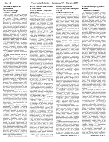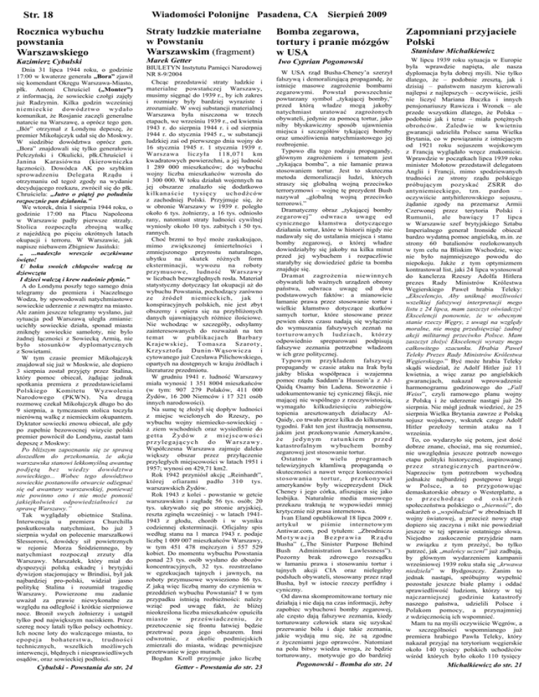 Str. 18 Rocznica wybuchu powstania Warszawskiego Kazimierz Cybulski Wiadomości Polonijne Pasadena, CA Sierpień 2009 Straty ludzkie materialne w Powstaniu Warszawskim (fragment) Marek Getter Dnia 31 lipca 1944 roku, o godzinie 17:00 w kwaterze generała „Bora” zjawił się komendant Okręgu Warszawa-Miasto, płk. Antoni Chruściel („Monter”) z informacją, że sowieckie czołgi zajęły już Radzymin. Kilka godzin wcześniej n ie mie c k ie do wód z tw o w yd a ło komunikat, że Rosjanie zaczęli generalne natarcie na Warszawę, a oprócz tego gen. „Bór” otrzymał z Londynu depeszę, że premier Mikołajczyk udał się do Moskwy. W siedzibie dowództwa oprócz gen. „Bora” znajdowali się tylko generałowie Pełczyński i Okulicki, płk.Chruściel i Janina Karasiówna (kierowniczka łączności). Dowódca AK po szybkim sprowadzeniu Delegata Rządu i otrzymaniu od tegoż zgody na wydanie decydującego rozkazu, zwrócił się do płk. Chruściela: „Jutro o piątej po południu rozpocznie pan działania.” We wtorek, dnia 1 sierpnia 1944 roku, o godzinie 17:00 na Placu Napoleona w Warszawie padły pierwsze strzały. Stolica rozpoczęła zbrojną walkę z najeźdźcą po pięciu okrótnych latach okupacji i terroru. W Warszawie, jak napisze niebawem Zbigniew Jasiński: „ ...nadeszło wreszcie oczekiwane święto! U boku swoich chłopców walczą tu dziewczęta I dzieci walczą i krew radośnie płynie.” A do Londynu poszły tego samego dnia telegramy do premiera i Naczelnego Wodza, by spowodowali natychmiastowe sowieckie uderzenie z zewnątrz na miasto. Ale zanim jeszcze telegramy wysłano, już sytuacja pod Warszawą uległa zmianie: ucichły sowieckie działa, sponad miasta zniknęły sowieckie samoloty, nie bylo żadnej łączności z Sowiecką Armią, nie było stosunków dyplomatycznych z Sowietami. W tym czasie premier Mikołajczyk znajdował się już w Moskwie, ale dopiero 3 sierpnia został przyjęty przez Stalina, który pomoc obiecał, żądając jednak spotkania premiera z przedstawicielami Polskiego Komitetu Wyzwolenia Narodowego (PKWN). Na drugą rozmowę czekał Mikołajczyk długo bo do 9 sierpnia, a tymczasem stolica toczyła nierówną walkę z niemieckim okupantem. Dyktator sowiecki znowu obiecał, ale gdy po zupełnie bezowocnej wizycie polski premier powrócił do Londynu, zastał tam depeszę z Moskwy: Po bliższym zapoznaniu się ze sprawą doszedłem do przekonania, że akcja warszawska stanowi lekkomyślną awantuę podjętą bez wiedzy dowództwa sowieckiego... Wobec tego dowództwo sowieckie postanowiło otwarcie odżegnać się od awantury warszawskiej, ponieważ nie powinno ono i nie może ponosić jakiejkolwiek odpowiedzialności za sprawę Warszawy.” Tak wyglądały obietnice Stalina. Interwencja u premiera Churchilla poskutkowała natychmiast, bo już 3 sierpnia wydał on polecenie marszałkowi Slessorowi, dowódcy sił powietrznych w rejonie Morza Śródziemnego, by natychmiast rozpoczął zrzuty dla Warszawy. Marszałek, który miał do dyspozycji polską eskadrę i brytyjski dywizjon stacjonujący w Brindisi, był jak najbardziej pro-polski, widział jasno politykę Stalina i rozumiał tragedię Warszawy. Powierzone mu zadanie uważał za prawie niewykonalne za względu na odległość i krótkie sierpniowe noce. Bronił swych żołnierzy i ustąpił tylko pod największym naciskiem. Przez szereg nocy latali tylko polscy ochotnicy. Ich nocne loty do walczącego miasta, to epopeja bohaterstwa, trudności technicznych, wszelkich możliwych interwencji, błędnych i niesprawiedliwych osądów, oraz sowieckiej podłości. BIULETYN Instytutu Pamięci Narodowej NR 8-9/2004 Chcąc przedstawić straty ludzkie i materialne powstańczej Warszawy, musimy sięgnąć do 1939 r., by ich zakres i rozmiary były bardziej wyraziste i zrozumiałe. W swej substancji materialnej Warszawa była niszczona w trzech etapach, we wrześniu 1939 r., od kwietnia 1943 r. do sierpnia 1944 r. i od sierpnia 1944 r. do stycznia 1945 r., w substancji ludzkiej zaś od pierwszego dnia wojny do 16 stycznia 1945 r. 1 stycznia 1939 r. Warszawa liczyła 118,071 km kwadratowych powierzchni, a jej ludność 1 289 000 mieszkańców; do wybuchu wojny liczba mieszkańców wzrosła do 1 300 000. W toku działań wojennych na jej obszarze znalazło się dodatkowo k ilk ana śc ie tys ię c y uchodź ców z zachodniej Polski. Przyjmuje się, że w obronie Warszawy w 1939 r. poległo około 6 tys. żołnierzy, a 16 tys. odniosło rany, natomiast straty ludności cywilnej wyniosły około 10 tys. zabitych i 50 tys. rannych. Choć brzmi to być może zaskakująco, mimo zwiększonej śmiertelności i zmniejszonego przyrostu naturalnego, ubytku na skutek różnych form eksterminacji, wywozu na roboty przymusowe, ludność Warszawy w liczbach bezwzględnych rosła. Materiał statystyczny dotyczący lat okupacji aż do wybuchu Powstania, pochodzący zarówno ze źródeł niemieckich, jak i konspiracyjnych polskich, nie jest zbyt obszerny i opiera się na przybliżonych danych ujawniających różnice ilościowe. Nie wchodząc w szczegóły, odsyłamy zainteresowanych do rozważań na ten temat w publikacjach Barbary Krajewskiej, Tomasza Szaroty, Krzysztofa Dunin -Wąsowicza i cytowanego już Czesława Pilichowskiego, opartych na dostępnych w kraju źródłach i literaturze przedmiotu. W grudniu 1941 r. ludność Warszawy miała wynosić 1 351 8004 mieszkańców (w tym: 907 279 Polaków, 411 000 Żydów, 16 200 Niemców i 17 321 osób innych narodowości). Na sumę tę złożył się dopływ ludności z miejsc wcielonych do Rzeszy, po wybuchu wojny niemiecko-sowieckiej z ziem wschodnich oraz wysiedlenie do getta Żydów z miejscowości przylegających do Warszawy. Współczesna Warszawa zajmuje daleko większy obszar przez przyłączenie przyległych miejscowości w latach 1951 i 1957; wynosi on 429,71 km2. Rok 1942 przyniósł akcję „Reinhardt”, której ofiarami padło 310 tys.