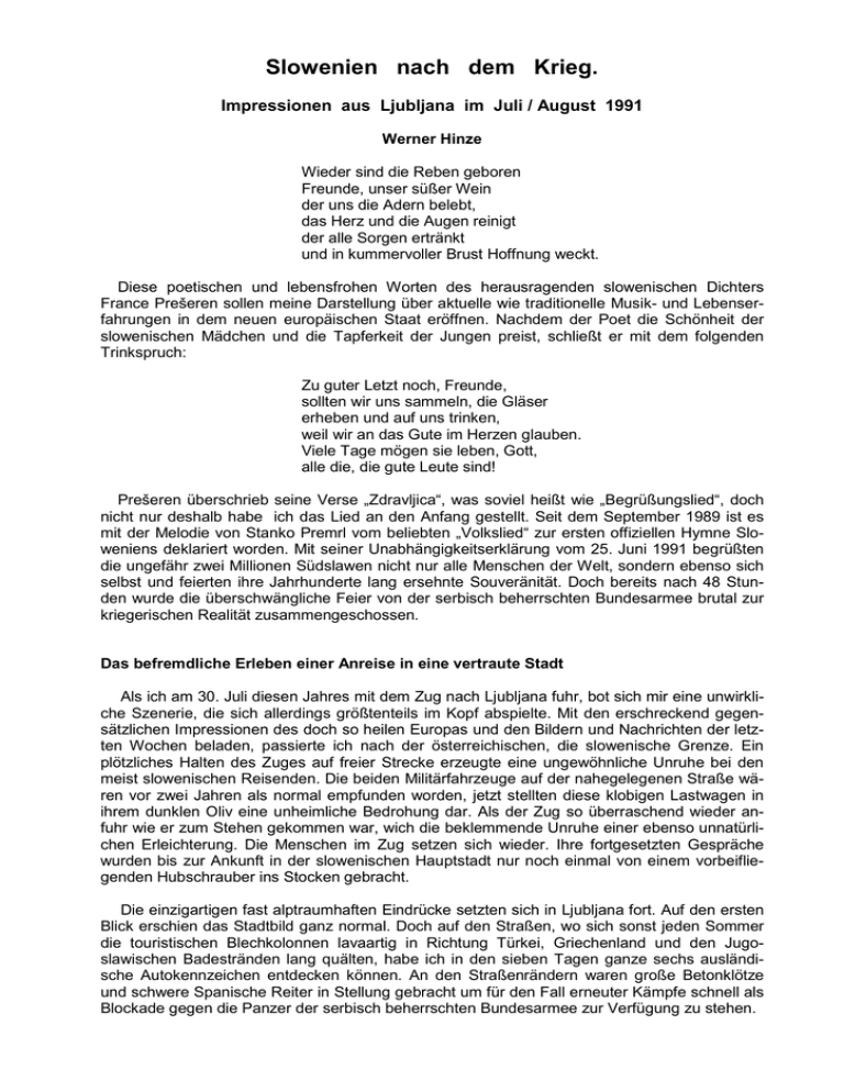 Slowenien nach dem Krieg. Impressionen aus Ljubljana im Juli / August 1991 Werner Hinze Wieder sind die Reben geboren Freunde, unser süßer Wein der uns die Adern belebt, das Herz und die Augen reinigt der alle Sorgen ertränkt und in kummervoller Brust Hoffnung weckt. Diese poetischen und lebensfrohen Worten des herausragenden slowenischen Dichters France Prešeren sollen meine Darstellung über aktuelle wie traditionelle Musik- und Lebenserfahrungen in dem neuen europäischen Staat eröffnen. Nachdem der Poet die Schönheit der slowenischen Mädchen und die Tapferkeit der Jungen preist, schließt er mit dem folgenden Trinkspruch: Zu guter Letzt noch, Freunde, sollten wir uns sammeln, die Gläser erheben und auf uns trinken, weil wir an das Gute im Herzen glauben. Viele Tage mögen sie leben, Gott, alle die, die gute Leute sind! Prešeren überschrieb seine Verse „Zdravljica“, was soviel heißt wie „Begrüßungslied“, doch nicht nur deshalb habe ich das Lied an den Anfang gestellt. Seit dem September 1989 ist es mit der Melodie von Stanko Premrl vom beliebten „Volkslied“ zur ersten offiziellen Hymne Sloweniens deklariert worden. Mit seiner Unabhängigkeitserklärung vom 25. Juni 1991 begrüßten die ungefähr zwei Millionen Südslawen nicht nur alle Menschen der Welt, sondern ebenso sich selbst und feierten ihre Jahrhunderte lang ersehnte Souveränität. Doch bereits nach 48 Stunden wurde die überschwängliche Feier von der serbisch beherrschten Bundesarmee brutal zur kriegerischen Realität zusammengeschossen. Das befremdliche Erleben einer Anreise in eine vertraute Stadt Als ich am 30. Juli diesen Jahres mit dem Zug nach Ljubljana fuhr, bot sich mir eine unwirkliche Szenerie, die sich allerdings größtenteils im Kopf abspielte. Mit den erschreckend gegensätzlichen Impressionen des doch so heilen Europas und den Bildern und Nachrichten der letzten Wochen beladen, passierte ich nach der österreichischen, die slowenische Grenze. Ein plötzliches Halten des Zuges auf freier Strecke erzeugte eine ungewöhnliche Unruhe bei den meist slowenischen Reisenden. Die beiden Militärfahrzeuge auf der nahegelegenen Straße wären vor zwei Jahren als normal empfunden worden, jetzt stellten diese klobigen Lastwagen in ihrem dunklen Oliv eine unheimliche Bedrohung dar. Als der Zug so überraschend wieder anfuhr wie er zum Stehen gekommen war, wich die beklemmende Unruhe einer ebenso unnatürlichen Erleichterung. Die Menschen im Zug setzen sich wieder. Ihre fortgesetzten Gespräche wurden bis zur Ankunft in der slowenischen Hauptstadt nur noch einmal von einem vorbeifliegenden Hubschrauber ins Stocken gebracht. Die einzigartigen fast alptraumhaften Eindrücke setzten sich in Ljubljana fort. Auf den ersten Blick erschien das Stadtbild ganz normal. Doch auf den Straßen, wo sich sonst jeden Sommer die touristischen Blechkolonnen lavaartig in Richtung Türkei, Griechenland und den Jugoslawischen Badestränden lang quälten, habe ich in den sieben Tagen ganze sechs ausländische Autokennzeichen entdecken können. An den Straßenrändern waren große Betonklötze und schwere Spanische Reiter in Stellung gebracht um für den Fall erneuter Kämpfe schnell als Blockade gegen die Panzer der serbisch beherrschten Bundesarmee zur Verfügung zu stehen. Werner Hinze, Slowenien nach dem Krieg (INFO Nr. 10 / Dez. 1991) 2 Von anonymen Äußerungen und nationalen Symbolen Das Erscheinungsbild des heutigen Slowenien ist von symbolischen Demonstrationen und einer Aufspaltung unterschiedlicher Einflußsphären geprägt. So sind beispielsweise die sprachlichen Ausdrucksformen stark von amerikanischen und deutschen Vokabeln beeinflußt. Ähnliches demonstrieren Wand-Graffitis, die neben so allgemein lautenden Parolen wie „ROCK * A * BILLY REBELJ“ auch eindeutige kulturpolitische Unzufriedenheit offenbaren. CAPUDER NEIN DANKE heißt es in Ablehnung des slowenischen Kultusministers, dessen starke Anbindung an die neu erstarkte Kirche von vielen Menschen und Organisationen mißbilligt wird. Noch sind fremdenfeindliche Äußerungen wie BUREK NEIN DANKE1 selten, zeigen aber auch Anzeichen einer nationalen Überheblichkeit gegenüber den Kosovo-Albanern. Nach dem Sieg der slowenischen Bürgerwehr gegen die Einheiten der Bundestruppen standen besonders die staatlichen Symbole als Ausdruck einer Identitätsfindung im Mittelpunkt. Die weiß-blau-rote Fahne mit ihrer schablonenhaften Darstellung der drei Spitzen des „Triglav“2, dem Meer und drei Sternen (die aus dem Wappen einer gräflichen Familien Das slowenische Wappen nach einer Karikatur von MLADINA Nr. 30, vom 23. Juli 1991. Auf dem linken Berggipfel sitzt der amerikanische, auf dem rechten der deutsche Adler. Einleitungsspott der Fernsehnachrichten Stravljica von Stanko Premrl in Celje stammen) war an fast jedem zweiten Haus zu sehen. Auf T-Shirts wurde sie, neben Büchern über den Krieg, in Geschäften und beweglichen Ständen, die an jeder Straßenecke standen, angeboten. Das slowenische Fernsehen leitet seine Hauptnachrichtensendung mit Klängen ein, in denen die ersten Töne von STRAVLJICA verwandt wurden. Seine Jungfräulichkeit im Umgang mit diesen Ausdrucksformen hatte das demokratische Slowenien aber bereits im Verlauf des Prozesses zur Unabhängigkeitserklärung verloren. Vor ungefähr vier Jahren strichen die Rundfunksender eine Rockversion des Liedes der Popgruppe LACNI FRANZ von der Liste zu spielender Lieder.3 Die Geschichte des Prešeren Liedes offenbart historische Aspekte des 19. und 20. Jahrhunderts und verschafft dem Lied eine besondere Bedeutung. Den ursprünglichen Gedanken eines Trinkliedes hat es beispielsweise mit der zweiten Strophe in Hoffmann von Fallerslebens „Lied der Deutschen“ gemein. Ähnlich verhält es sich mit der Deklarierung als Symbol eines Staates oder einer Nation, wenn auch unter anderen politischen Bedingungen. Die 1 2 3 Burek sind kleine Kuchen, die von den Albanern im Kosovo stammen. „Triglav“ ist der 