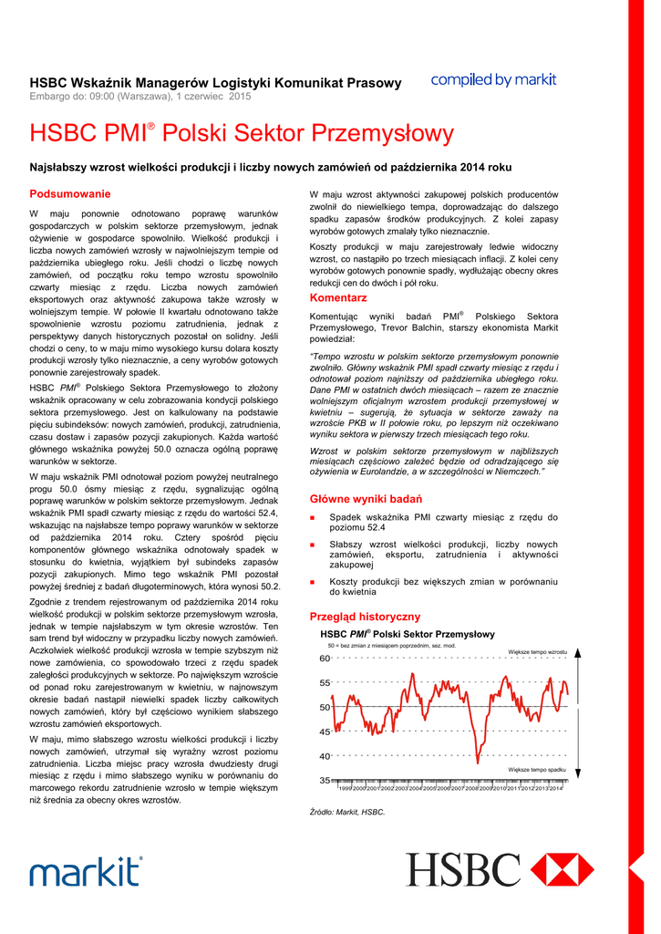 HSBC Wskaźnik Managerów Logistyki Komunikat Prasowy Embargo do: 09:00 (Warszawa), 1 czerwiec 2015 HSBC PMI Polski Sektor Przemysłowy Najsłabszy wzrost wielkości produkcji i liczby nowych zamówień od października 2014 roku Podsumowanie W maju ponownie odnotowano poprawę warunków gospodarczych w polskim sektorze przemysłowym, jednak ożywienie w gospodarce spowolniło. Wielkość produkcji i liczba nowych zamówień wzrosły w najwolniejszym tempie od października ubiegłego roku. Jeśli chodzi o liczbę nowych zamówień, od początku roku tempo wzrostu spowolniło czwarty miesiąc z rzędu. Liczba nowych zamówień eksportowych oraz aktywność zakupowa także wzrosły w wolniejszym tempie. W połowie II kwartału odnotowano także spowolnienie wzrostu poziomu zatrudnienia, jednak z perspektywy danych historycznych pozostał on solidny. Jeśli chodzi o ceny, to w maju mimo wysokiego kursu dolara koszty produkcji wzrosły tylko nieznacznie, a ceny wyrobów gotowych ponownie zarejestrowały spadek. HSBC PMI® Polskiego Sektora Przemysłowego to złożony wskaźnik opracowany w celu zobrazowania kondycji polskiego sektora przemysłowego. Jest on kalkulowany na podstawie pięciu subindeksów: nowych zamówień, produkcji, zatrudnienia, czasu dostaw i zapasów pozycji zakupionych. Każda wartość głównego wskaźnika powyżej 50.0 oznacza ogólną poprawę warunków w sektorze. W maju wskaźnik PMI odnotował poziom powyżej neutralnego progu 50.0 ósmy miesiąc z rzędu, sygnalizując ogólną poprawę warunków w polskim sektorze przemysłowym. Jednak wskaźnik PMI spadł czwarty miesiąc z rzędu do wartości 52.4, wskazując na najsłabsze tempo poprawy warunków w sektorze od października 2014 roku. Cztery spośród pięciu komponentów głównego wskaźnika odnotowały spadek w stosunku do kwietnia, wyjątkiem był subindeks zapasów pozycji zakupionych. Mimo tego wskaźnik PMI pozostał powyżej średniej z badań długoterminowych, która wynosi 50.2. Zgodnie z trendem rejestrowanym od października 2014 roku wielkość produkcji w polskim sektorze przemysłowym wzrosła, jednak w tempie najsłabszym w tym okresie wzrostów. Ten sam trend był widoczny w przypadku liczby nowych zamówień. Aczkolwiek wielkość produkcji wzrosła w tempie szybszym niż nowe zamówienia, co spowodowało trzeci z rzędu spadek zaległości produkcyjnych w sektorze. Po największym wzroście od ponad roku zarejestrowanym w kwietniu, w najnowszym okresie badań nastąpił niewielki spadek liczby całkowitych nowych zamówień, który był częściowo wynikiem słabszego wzrostu zamówień eksportowych. W maju, mimo słabszego wzrostu wielkości produkcji i liczby nowych zamówień, utrzymał się wyraźny wzrost poziomu zatrudnienia. Liczba miejsc pracy wzrosła dwudziesty drugi miesiąc z rzędu i mimo słabszego wyniku w porównaniu do marcowego rekordu zatrudnienie wzrosło w tempie większym niż średnia za obecny okres wzrostów. W maju wzrost aktywności zakupowej polskich producentów zwolnił do niewielkiego tempa, doprowadzając do dalszego spadku zapasów środków produkcyjnych. Z kolei zapasy wyrobów gotowych zmalały tylko nieznacznie. Koszty produkcji w maju zarejestrowały ledwie widoczny wzrost, co nastąpiło po trzech miesiącach inflacji. Z kolei ceny wyrobów gotowych ponownie spadły, wydłużając obecny okres redukcji cen do dwóch i pół roku. Komentarz Komentując wyniki badań PMI® Polskiego Sektora Przemysłowego, Trevor Balchin, starszy ekonomista Markit powiedział: “Tempo wzrostu w polskim sektorze przemysłowym ponownie zwolniło. Główny wskaźnik PMI spadł czwarty miesiąc z rzędu i odnotował poziom najniższy od października ubiegłego roku. Dane PMI w ostatnich dwóch miesiącach – razem ze znacznie wolniejszym oficjalnym wzrostem produkcji przemysłowej w kwietniu – sugerują, że sytuacja w sektorze zaważy na wzroście PKB w II połowie roku, po lepszym niż oczekiwano wyniku sektora w pierwszy trzech miesiącach tego roku. Wzrost w polskim sektorze przemysłowym w najbliższych miesiącach częściowo zależeć będzie od odradzającego się ożywienia w Eurolandzie, a w szczególności w Niemczech.” Główne wyniki badań Spadek wskaźnika PMI czwarty miesiąc z rzędu do poziomu 52.4 Słabszy wzrost wielkości produkcji, liczby nowych zamówień, eksportu, zatrudnienia i aktywności zakupowej Koszty produkcji bez większych zmian w porównaniu do kwietnia Przegląd historyczny HSBC PMI® Polski Sektor Przemysłowy 50 = bez zmian z miesiącem poprzednim, sez. mod. Większe tempo wzrostu 60 55 50 45 40 Większe tempo spadku 35 1999 2000 2001 2002 2003 2004 2005 2006 2007 2008 2009 2010 2011 2012 2013 2014 Źródło: Markit, HSBC. Po dalsze informacje prosimy o kontakt: HSBC Agata Urbańska-Giner Economist Central & Eastern Europe Telefon +44-207-992-2774 Email: [email protected] Magdalena Ujda-Tarczynska Communication Manager HSBC Bank Polska SA Telefon: +48-22-354-0644 / +48 696 070 388 Email: [email protected] Markit Trevor Balchin, Senior Economist Telefon: +44-1491-461-065 Email: [email protected] Joanna Vickers, Corporate Communications Telefon +44-207-260-2234 Email: [email protected] Ewelina Nizioł, Poland Panel Manager Telefon: +44-1491-461-041 Email: [email protected] Uwagi na temat danych: Raport HSBC Polski Sektor Przemysłowy jest oparty na danych opracowanych na podstawie miesięcznych odpowiedzi na kwestionariusze przesyłane kadrze kierowniczej w ponad 200 firmach produkcyjnych. Grupa respondentów ustalana jest według położenia geograficznego i według międzynarodowej standardowej klasyfikacji branżowej – w oparciu o udział branży w PKB. Odpowiedzi uzyskane podczas badania odzwierciedlają ewentualne zmiany w bieżącym miesiącu w porównaniu z miesiącem poprzednim, opierając się na danych zebranych w połowie miesiąca. Dla każdego wskaźnika raport podaje procent respondentów udzielających każdą odp
