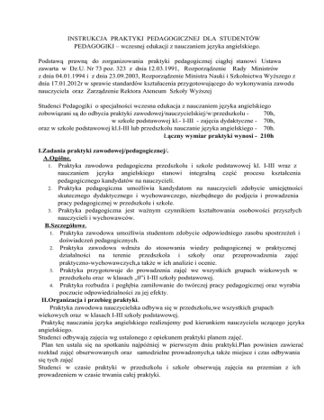 INSTRUKCJA PRAKTYKI PEDAGOGICZNEJ DLA STUDENTÓW PEDAGOGIKI – wczesnej edukacji z nauczaniem języka angielskiego. Podstawą prawną do zorganizowania praktyki pedagogicznej ciągłej stanowi Ustawa zawarta w Dz.U. Nr 73 poz. 323 z dnia 12.03.1991, Rozporządzenie Rady Ministrów z dnia 04.01.1994 i z dnia 23.09.2003, Rozporządzenie Ministra Nauki i Szkolnictwa Wyższego z dnia 17.01.2012r w sprawie standardów kształacenia przygotowującego do wykonywania zawodu nauczyciela oraz Zarządzenie Rektora Ateneum Szkoły Wyższej Studenci Pedagogiki o specjalności wczesna edukacja z nauczaniem języka angielskiego zobowiązani są do odbycia praktyki zawodowej/nauczycielskiej/w:przedszkolu 70h, w szkole podstawowej kl. IIII zajęcia dydaktyczne 70h, oraz w szkole podstawowej kl.IIII lub przedszkolu nauczanie języka angielskiego 70h. Łączny wymiar praktyki wynosi 210h I.Zadania praktyki zawodowej/pedagogicznej/. A.Ogólne. 1. Praktyka zawodowa pedagogiczna przedszkolu i szkole podstawowej kl. IIII wraz z nauczaniem języka angielskiego stanowi integralną część procesu kształcenia pedagogicznego kandydatów na nauczycieli. 2. Praktyka pedagogiczna umożliwia kandydatom na nauczycieli zdobycie umiejętności skutecznego dydaktycznego i wychowawczego, niezbędnego do podjęcia i prowadzenia pracy pedagogicznej w przedszkolu i szkole. 3. Praktyka pedagogiczna jest ważnym czynnikiem kształtowania osobowości przyszłych nauczycieli i wychowawców. B.Szczegółowe. 1. Praktyka zawodowa umożliwia studentom zdobycie odpowiedniego zasobu spostrzeżeń i doświadczeń pedagogicznych. 2. Praktyka zawodowa wdraża do stosowania wiedzy pedagogicznej w praktycznej działalności na terenie przedszkola i szkoły oraz przeprowadzenia zajęć praktycznowychowawczych,a także w ich analizie i ocenie. 3. Praktyka przygotowuje do prowadzenia zajęć we wszystkich grupach wiekowych w przedszkolu oraz w klasach „0”i IIII szkoły podstawowej. 4. Praktyka rozbudza i pogłębia zamiłowanie do twórczej pracy pedagogicznej oraz wyrabia poczucie odpowiedzialności za jej efekty. II.Organizacja i przebieg praktyki. Praktyka zawodowa nauczycielska odbywa się w przedszkolu,we wszystkich grupach wiekowych oraz w klasach IIII szkoły podstawowej. Praktykę nauczania języka angielskiego realizujemy pod kierunkiem nauczyciela uczącego języka angielskiego. Studenci odbywają zajęcia wg ustalonego z opiekunem praktyki planem zajęć. Plan ten ustala się na spotkaniu najpóżniej w pierwszym dniu praktyki.Plan powinien zawierać rozkład zajęć obserwowanych oraz samodzielne prowadzonych,a także miejsce i czas odbywania się tych zajęć Studenci w czasie praktyki w przedszkolu i szkole obserwują zajęcia na przemian z ich prowadzeniem w czasie trwania całej praktyki. Liczba godzin prowadzonych przez praktykanta nie może przekraczać 2 3 godziny dziennie. Praktykant ma przeprowadzić zajęcia w miarę możliwości we wszystkich grupach wiekowych przedszkola i kl I –III w szkole ,jednakże podstawą ma być grupa – klasa której wychowawcą jest opiekun studenta. Zajęcia praktyczne dotyczyć mogą udziału studentów : ● w organizowaniu zabaw i gier, prowadzenie lekcji i zajęć pozalekcyjnych. ● w przygotowaniu i przeprowadzeniu przez nauczycieli wycieczek, seansów filmowych, przedstawień teatralnych, uroczystości przedszkolnych i szkolnych. ● utrzymania porządku w grupie, klasie. ● w przygotowaniu pomocy dydaktycznych, narzędzi i materiałów. ● w udzielaniu pomocy dzieciom /praca indywidualna. ● rozwiązywaniu niektórych trudności wychowawczych oraz nawiązywaniu kontaktów z rodzicami dzieci przedszkolnych i szkolnych. ● w przygotowaniu zajęć prowadzonych przez nauczyciela przedszkola i szkoły. W czasie praktyki studenci pod kierunkiem nauczyciela zapoznają się z dokumentacją pracy nauczycieli i uczniów. III.Uwagi. 1. Student zobowiązany jest przygotować się pisemnie do prowadzonych przez siebie . zajęć i skonsultować tę pracę z nauczycielem. 2. Student przebywając w placówce podlega dyscyplinie obowiązującej nauczycieli i opiekunów. 3. Student nie powinien przeprowadzać zajęć zastępczych, dorywczych i nieprzgoto wanych.. IV.Zaliczenie. 1. Warunkiem zaliczenia praktyki jest złożenie przez studenta w dziale praktyk uczelni arkusza oceny praktyki zawodowej, wypełnionego i podpisanego przez opiekuna praktyki i dyrektora placówki w której się odbywała. 2. Arkusz oceny praktyki stanowi podstawę do zaliczenia praktyki w formie wpisu zaliczającego w indeksie i karcie egzaminacyjnej. 3. Zaliczenie i wpis dokonywane będą w ostatnim semestrze studiów. Opracował : mgr Bartosz Maciej Wiśniewski