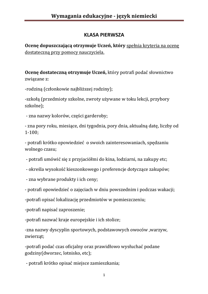 Wymagania edukacyjne - język niemiecki KLASA PIERWSZA