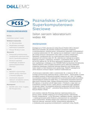 PODSUMOWANIE Branża Szkolnictwo wyższe i nauka Poznańskie Centrum Superkomputerowo Sieciowe Isilon sercem laboratorium wideo 4K Wielkość środowiska • Ok. 300 pracowników •Kilkadziesiąt równolegle realizowanych projektów • Kilkaset TB danych wideo Wyzwania •Konieczność przechowywania i przetwarzania ogromnych ilości danych nieustrukturyzowanych •Struktura organizacji komplikująca zarządzanie polityką bezpieczeństwa informacji Wyniki •Wdrożenie rozproszonego systemu pamięci masowych o wysokiej wydajności •Umożliwienie zespołom roboczym zarządzania ochroną i dostępem do informacji Rozwiązanie •Dell EMC Isilon X410, 5 węzłów, 540 TB pojemności ROZWIĄZANIE Działające przy PCSS Laboratorium Usług Nowych Mediów UHD w Sieciach Optycznych powstało, aby sprostać rosnącym wyzwaniom związanym z przechowywaniem, przetwarzaniem i przesyłaniem materiałów multimedialnych o wysokiej rozdzielczości 4K i 8K. Zajmuje się ono badaniami w takich obszarach, jak rozwój cyfrowych repozytoriów treści wideo o wysokiej rozdzielczości, testowanie i konfiguracja sieci czy wykorzystywanie nowych protokołów sieciowych do transmisji wideo 4K i 8K. Laboratorium realizuje też projekty badawcze związane z rejestracją, montażem i przesyłaniem filmów o jakości od Full HD, poprzez 4K, 4K 3D aż do najnowszych standardów 8K i 8K 3D oraz współpracuje z działającą w sieci PIONIER Platformą Naukowej Interaktywnej Telewizji PlatonTV, która przybliża szerokiemu gronu odbiorców działalność środowiska naukowego, prezentuje dyskusje ekspertów oraz ukazuje wpływ nauki i badań na różne dziedziny życia społecznego. PlatonTV udostępnia też online obszerne archiwum nagrań z ostatnich siedemnastu lat. „Przetwarzanie materiałów wideo o rozdzielczości 4K, a zwłaszcza 4K 3D – co wymaga synchronicznej rejestracji obrazu z dwóch kamer – stawia bardzo wysokie wymagania zarówno infrastrukturze pamięci masowych, jak i sieci. Ze względu na prowadzone badania wiele materiałów jest przechowywanych jako serie plików reprezentujących pojedyncze klatki filmu, co uniemożliwia stosowanie typowych algorytmów kompresji wideo. Dlatego dziesięciominutowy, nieskompresowany film zapisany w tej postaci potrafi zająć prawie 1 TB danych, a jego zapis czy wyświetlenie wymaga odczytu i zapisu danych z szybkością rzędu gigabajta na sekundę. Gdyby z tą szybkością odtwarzać zwykłą płytę DVD, jej odczyt zająłby zaledwie pięć sekund” – powiedział Maciej Głowiak, Kierownik Działu Nowych Mediów w PCSS. Cykl produkcji materiału filmowego obejmuje rejestrację obrazu przy pomocy kamer, obróbkę wstępną (w tym korekcję kolorów i kadrowanie), montaż i postprodukcję – w tym filtrowanie, nakładanie efektów, napisów itp. – a także generowanie plików finalnych, przeznaczonych do wyświetlania przez użytkowników. Obróbka wstępna jest realizowana na wydzielonej maszynie roboczej, natomiast montaż i postprodukcja odbywają się w środowisku pracy grupowej na komputerach z systemami Linux, MacOS OPIS WDROŻENIA Opis firmy: PCSS jest liderem wprowadzania innowacyjnych technologii sieciowych w krajowej sieci naukowej PIONIER. Działalność PCSS obejmuje m.in. funkcje dostawcy mocy obliczeniowej i systemów archiwizacji, dostawcy usług chmurowych dla obliczeń oraz zarządzania danymi, dostawcy Internetu oraz usług sieciowych, centrum badawczo-rozwojowego w zakresie sieci komputerowych nowych generacji, nowoczesnych aplikacji, portali oraz obliczeń równoległych i rozproszonych, a także bezpieczeństwa systemów i sieci. i MS Windows. „System pamięci masowej wykorzystywanej jako centralne repozytorium materiałów wideo musi mieć bardzo wysoką wydajność – zwłaszcza przy dostępie do dużych plików – i musi zapewniać efektywny dostęp poprzez sieć przy równoczesnej obsłudze protokołów NFS i SMB/CIFS przez wielu użytkowników. Możliwość wydajnej pracy w takiej konfiguracji jest ważnym atutem systemu Isilon, który adresuje wszystkie nasze wymagania” – powiedział Eryk Skotarczak, specjalista Działu Nowych Mediów odpowiedzialny za rejestrację, obróbkę i przygotowanie materiału wideo w rozdzielczości 4K i 8K. Specyfika organizacji, w której niemal każdy z trzystu pracowników naukowych równolegle pracuje nad kilkoma projektami w ramach zespołów roboczych dedykowanych do każdego projektu, wymaga specjalnego podejścia do zarządzania bezpieczeństwem. Dodatkowym utrudnieniem jest konieczność zróżnicowania poziomu ochrony materiałów na poszczególnych etapach obróbki. „Realizujemy około czterdziestu projektów unijnych oraz szereg projektów finansowanych z innych źródeł. W każdym z nich występują zarówno materiały bardzo cenne, na przykład materiały źródłowe, które byłyby trudne lub nawet niemożliwe do odtworzenia w przypadku ich utraty, jak i pliki, które można w każdej chwili wygenerować ponownie, np. pliki przeznaczone bezpośrednio do odtwarzania przez użytkowników. Isilon chroni informacje tworząc ich dodatkowe kopie, ale powielanie w ten sposób wszystkich danych byłoby szalenie nieefektywne i kosztowne” – powiedział Maciej Brzeźniak, Kierownik Działu Nowych Technologii Zarządzania Danymi w PCSS. „O tym, które materiały są ważne i kto powinien „Cena zakupu Isilona jest nieco wyższa niż typowych macierzy NAS, jednak jego funkcjonalność oraz elastyczność i łatwość zarządzania powodują, że znacznie mniej czasochłonna i tańsza jest realizacja typowych procesów związanych z zarządzaniem. Dzięki temu całkowity koszt posiadania (TCO) Isilona okazał się bardzo konkurencyjny”. Maciej Brzeźniak, Kierownik Działu Nowych Technologii Zarządzania Danymi w PCSS KONTAKT Więcej informacji na temat tego, jak produkty, usługi i rozwiązania firmy Dell EMC mogą Państwu pomóc sprostać wyzwaniom biznesowym i informaty