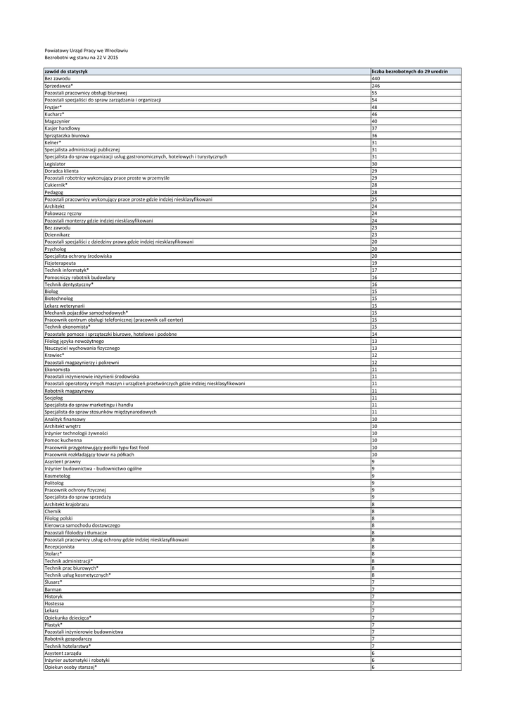 Powiatowy Urząd Pracy we Wrocławiu Bezrobotni wg stanu na 22 V 2015 zawód do statystyk Bez zawodu Sprzedawca* Pozostali pracownicy obsługi biurowej Pozostali specjaliści do spraw zarządzania i organizacji Fryzjer* Kucharz* Magazynier Kasjer handlowy Sprzątaczka biurowa Kelner* Specjalista administracji publicznej Specjalista do spraw organizacji usług gastronomicznych, hotelowych i turystycznych Legislator Doradca klienta Pozostali robotnicy wykonujący prace proste w przemyśle Cukiernik* Pedagog Pozostali pracownicy wykonujący prace proste gdzie indziej niesklasyfikowani Architekt Pakowacz ręczny Pozostali monterzy gdzie indziej niesklasyfikowani Bez zawodu Dziennikarz Pozostali specjaliści z dziedziny prawa gdzie indziej niesklasyfikowani Psycholog Specjalista ochrony środowiska Fizjoterapeuta Technik informatyk* Pomocniczy robotnik budowlany Technik dentystyczny* Biolog Biotechnolog Lekarz weterynarii Mechanik pojazdów samochodowych* Pracownik centrum obsługi telefonicznej (pracownik call center) Technik ekonomista* Pozostałe pomoce i sprzątaczki biurowe, hotelowe i podobne Filolog języka nowożytnego Nauczyciel wychowania fizycznego Krawiec* Pozostali magazynierzy i pokrewni Ekonomista Pozostali inżynierowie inżynierii środowiska Pozostali operatorzy innych maszyn i urządzeo przetwórczych gdzie indziej niesklasyfikowani Robotnik magazynowy Socjolog Specjalista do spraw marketingu i handlu Specjalista do spraw stosunków międzynarodowych Analityk finansowy Architekt wnętrz Inżynier technologii żywności Pomoc kuchenna Pracownik przygotowujący posiłki typu fast food Pracownik rozkładający towar na półkach Asystent prawny Inżynier budownictwa - budownictwo ogólne Kosmetolog Politolog Pracownik ochrony fizycznej Specjalista do spraw sprzedaży Architekt krajobrazu Chemik Filolog polski Kierowca samochodu dostawczego Pozostali filolodzy i tłumacze Pozostali pracownicy usług ochrony gdzie indziej niesklasyfikowani Recepcjonista Stolarz* Technik administracji* Technik prac biurowych* Technik usług kosmetycznych* Ślusarz* Barman Historyk Hostessa Lekarz Opiekunka dziecięca* Plastyk* Pozostali inżynierowie budownictwa Robotnik gospodarczy Technik hotelarstwa* Asystent zarządu Inżynier automatyki i robotyki Opiekun osoby starszej* liczba bezrobotnych do 29 urodzin 440 246 55 54 48 46 40 37 36 31 31 31 30 29 29 28 28 25 24 24 24 23 23 20 20 20 19 17 16 16 15 15 15 15 15 15 14 13 13 12 12 11 11 11 11 11 11 11 10 10 10 10 10 10 9 9 9 9 9 9 8 8 8 8 8 8 8 8 8 8 8 7 7 7 7 7 7 7 7 7 7 6 6 6 Pozostali pracownicy ochrony osób i mienia Pozostali specjaliści do spraw administracji i rozwoju Przedstawiciel handlowy Sortowacz Specjalista do spraw integracji europejskiej Technik usług fryzjerskich* Telemarketer Biomasażysta Dystrybutor ulotek Elektromechanik pojazdów samochodowych* Historyk sztuki Inwentaryzator Inżynier gospodarki przestrzennej Inżynier inżynierii środowiska - instalacje sanitarne Inżynier organizacji i planowania produkcji Kierowca operator wózków jezdniowych (widłowych) Kontroler jakości wyrobów przemysłowych Kosmetyczka Kulturoznawca Opiekun klienta Piekarz* Pozostali pracownicy obsługi biura gdzie indziej niesklasyfikowani Specjalista do spraw rachunkowości Specjalista zdrowia publicznego Sprzedawca w branży spożywczej Technik elektronik* Technik farmaceutyczny* Technik mechanik* Technik organizacji reklamy* Technik spedytor* Technik żywienia i usług gastronomicznych* Archiwista Artysta grafik Asystent usług pocztowych Blacharz samochodowy* Florysta* Fototechnik* Fryzjer damski Grafik komputerowy multimediów Inżynier rolnictwa Inżynier telekomunikacji Inżynier zootechniki Monter instalacji i urządzeo sanitarnych Negocjator biznesowy Ogrodnik* Pozostali kucharze Sekretarka Specjalista do spraw logistyki Specjalista zastosowao informatyki Technik architektury krajobrazu* Technik handlowiec* Technik logistyk* Technik teleinformatyk* Trener sportu Artysta malarz Asystent do spraw księgowości Betoniarz-zbrojarz* Doradca finansowy Dostawca potraw Elektromechanik* Grafik komputerowy DTP Inżynier geodeta - kataster i gospodarka nieruchomościami Inżynier inżynierii środowiska - systemy wodociągowe i kanalizacyjne Inżynier ogrodnictwa Kasjer w zakładzie pracy Mechanik samochodów osobowych Mikrobiolog Nauczyciel języka obcego Nauczyciel języka polskiego Operator centrali telefonicznej Pokojowa Pozostali kierownicy do spraw innych typów usług gdzie indziej niesklasyfikowani Pozostali specjaliści do spraw społecznych Pozostali specjaliści do spraw zarządzania zasobami ludzkimi Pracownik pomocniczy obsługi hotelowej* Programista aplikacji Projektant wzornictwa przemysłowego Psycholog kliniczny Ratownik medyczny Ratownik wodny Specjalista bankowości Specjalista kontroli jakości Specjalista pracy socjalnej Spedytor Technik masażysta* Technik mechatronik* Technik pojazdów samochodowych* Technik technologii żywności* 6 6 6 6 6 6 6 5 5 5 5 5 5 5 5 5 5 5 5 5 5 5 5 5 5 5 5 5 5 5 5 4 4 4 4 4 4 4 4 4 4 4 4 4 4 4 4 4 4 4 4 4 4 4 3 3 3 3 3 3 3 3 3 3 3 3 3 3 3 3 3 3 3 3 3 3 3 3 3 3 3 3 3 3 3 3 3 3 Technik weterynarii* Technolog robót wykooczeniowych w budownictwie Tłoczarz w metalu Wydawca posiłków / bufetowy Administrator stron internetowych Artysta rzeźbiarz Asystent kierownika produkcji filmowej / telewizyjnej* Bibliotekoznawca Dozorca Elektryk* Fotograf* Geograf Geolog Glazurnik Instrumentalista Inżynier budownictwa - linie, węzły i stacje kolejowe Inżynier elektryk Inżynier inżynierii środowiska - oczyszczanie miast i gospodarka odpadami Inżynier inżynierii materiałowej Inżynier mechanik - maszyny i urządzenia przemysłowe Inżynier mechanik - technologia mechaniczna Kasjer bankowy Kierowca samochodu osobowego Kierownik sali sprzedaży Konserwator części / sprzętu Koordynator projektów unijnych Księgowy Kurier Listonosz Logopeda Ładowacz Menedżer sportu Monter / konserwator instalacji w