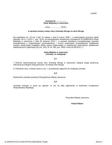 projekt Uchwała Nr .................... Rady Miejskiej w Jaworznie z dnia .................... 2016 r. w sprawie zmiany nazwy ulicy Andrzeja Struga na ulica Struga Na podstawie art. 18 ust. 2 pkt 13 ustawy z dnia 8 marca 1990 r. o samorządzie gminnym /tekst jednolity: Dz.U. z 2015 r., poz. 1515/, po konsultacjach określonych Uchwałą Nr XLVII/650/2010 Rady Miejskiej w Jaworznie z dnia 26 sierpnia 2010 r. w sprawie określenia szczegółowego sposobu konsultowania z organizacjami pozarządowymi i innymi podmiotami prowadzącymi działalność pożytku publicznego projektów aktów prawa miejscowego w dziedzinach dotyczących działalności statutowej tych organizacji (Dz.Urz. Woj. Śl. Nr 196, poz. 3002 z dnia 22.09.2010 r.), Rada Miejska w Jaworznie uchwala, co następuje: §1 1. Zmienić dotychczasową nazwę ulicy Andrzeja Struga w Jaworznie, będącą drogą publiczną, zaliczoną do kategorii dróg gminnych, na nazwę ulica Struga. 2. Położenie ulicy, o której mowa w ust. 1, przedstawia załącznik do niniejszej uchwały. §2 Wykonanie uchwały powierzyć Prezydentowi Miasta Jaworzna. §3 Uchwała wchodzi w życie po upływie 14 dni od daty ogłoszenia w Dzienniku Urzędowym Województwa Śląskiego. Prezydent Miasta Jaworzna Paweł Silbert Id: 8287B1F8-FD12-44AD-97F6-931AE2530E3E. Projekt Strona 1 Załącznik do Uchwały Nr .................... Rady Miejskiej w Jaworznie z dnia .................... 2016r. Id: 8287B1F8-FD12-44AD-97F6-931AE2530E3E. Projekt Strona 2 Uzasadnienie Z wnioskiem o zmianę nazwy ulicy Andrzeja Struga na nazwę ulica Struga wnioskowali wszyscy dorośli mieszkańcy tej ulicy. Jak uzasadniali we wniosku „Nazwa tej ulicy wywodzi się od płynącego niegdyś w tym rejonie potoku – strugi i jest używana co najmniej od lat 20-tych ubiegłego wieku. Do dzisiaj rzeczownik Struga - w mianowniku - funkcjonuje jako określenia przysiółka.” W piśmie do każdego mieszkańca ulicy wyjaśniono, że dotychczas oficjalnie funkcjonuje nazwa Andrzeja Struga a zmiana nazwy spowoduje konieczność wymiany dokumentów oraz aktualizacji danych w różnych instytucjach. Mieszkańcy jednak nadal zgodnie podtrzymali swoją prośbę. Biorąc pod uwagę zgodne zaangażowanie lokalnej wspólnoty, zasadną jest zmiana nazwy ulicy Andrzeja Struga na ulicę Struga. Zaproponowana uchwała jest zadaniem fakultatywnym gminy, nie powoduje wzrostu zatrudnienia w administracji. Podjęcie uchwały wiąże się z koniecznością na oznakowanie ulicy tablicami z nową nazwą. wydatkowania środków z budżetu miasta Jaworzno, 4 stycznia 2016 r. Opracował: Tadeusz Dębecki – Naczelnik Wydziału Geodezji i Kartografii Dokument podpisano elektronicznie. Id: 8287B1F8-FD12-44AD-97F6-931AE2530E3E. Projekt Strona 1