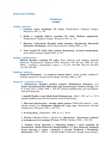 Katarzyna Osińska Publikacje (wybór) Książki autorskie: 1. Leksykon teatru rosyjskiego XX wieku, Wydawnictwo Naukowe Semper, Warszawa 1997, ss. 191. 2. Studio w rosyjskiej kulturze teatralnej XX wieku. Wybrane zagadnienia, Wydawnictwo Naukowe Semper, Warszawa 1997, ss. 117. 3. Klasztory i laboratoria. Rosyjskie studia teatralne: Stanisławski, Meyerhold, Sulerżycki, Wachtangow, słowo/obraz terytoria, Gdańsk 2003, ss. 307. 4. Teatr rosyjski XX wieku wobec tradycji. Kontynuacje, zerwania transformacje, słowo/obraz terytoria, Gdańsk 2009, ss. 397. Książki współautorskie: Historia literatury rosyjskiej XX wieku. Praca zbiorowa pod redakcją Andrzeja Drawicza, Wydawnictwo Naukowe PWN, Warszawa 1997 [II wyd. 2002; III wyd. 2007]; ; rozdziały o dramaturgii i teatrze: s. 151-167; 203-209; 296-310; 414-429; 513-526; 603-605. Redakcja naukowa: Jewgienij Wachtangow – co zostaje po artyście teatru?, wstęp, kronika, redakcja K. Osińska, Instytut im. Jerzego Grotowskiego, Wrocław 2008, ss. 367. Rozprawy i artykuły (wybór): 1. Ekumeniczny charakter polskich związków Włodzimierza Sołowjowa, [w:] Dzieło chrystianizacji Rusi Kijowskiej i jego konsekwencje w kulturze Europy, red. R. Łużny, KUL, Lublin 1988, s. 283-297 [artykuł opublikowany pod nazwiskiem: Jończyk Katarzyna]. 2.Anatolij Wasiliew i jego Szkoła Sztuki Dramatycznej, „Odra”, 1991, nr 5, s. 73-76 [artykuł opublikowany pod nazwiskiem: Jończyk Katarzyna]. 3. Массовые празднества – театр, обряд, ритуал (Widowiska masowe – teatr, obrzęd, rytuał), [w:] Włodzimierz Majakowski i jego czasy, Slawistyczny Ośrodek Wydawniczy, Warszawa 1995, s. 107-114. 4. W stronę ikony, „Didaskalia”, 1996, nr 12, s. 38-41. 5. Поляки в России (Polacy w Rosji), [w:] Мнемозина. Докумнеты и факты из истории русского театра ХХ века, ГИТИС, Моskwa 1996, s. 186-196. 6. Tradycje Grecji antycznej w radzieckiej praktyce i teorii teatralnej lat dwudziestych. Adrian Piotrowski i Siergiej Radłow, [w:] Siew Dionizosa. Inspiracje Grecji antycznej w teatrze i dramacie w Europie Środkowej i Wschodniej. Rekonesans, TNW – OBTA - Ośrodek Badań Twórczości Jerzego Grotowskiego i Poszukiwań Teatralno-Kulturowych – Wydawnictwo DiG, Warszawa 1997, s. 55-72 [skrócona wersja tekstu pt. Tradycje misteriów i teatru antycznego w porewolucyjnym Piotrogrodzie została opublikowana w: „Literatura na Świecie”, 1996, nr 8-9, s. 355-367]. 7. Czechow w interpretacji Petera Steina, „Didaskalia. Gazeta Teatralna” (Kraków), 1996, nr 13-14, s. 33-35. 8. Wasiljew: przekraczanie granic, „Didaskalia. Gazeta Teatralna” (Kraków), 1997, nr 19-20, s. 87-88. 9. Vasziljev – határátlépés (Wasiljew – przekraczanie granic), przeł. Pászt Patrícia, [w:] A. Vasziljev, Színházi fúga, Országos Színháztörténeti Múzeum és Intézet, Budapest 1998, s. 233-237 [węgierski przekład artykułu Wasiljew: przekraczanie granic – zob. punkt 8] . 10. Ekspansja teatru poza teatr w Rosji Radzieckiej (1918-1924), [w:] Teatr w miejscach nieteatralnych, red. J. Tyszka, Wydawnictwo Fundacji Humaniora, Poznań 1998, s. 125-132 [skrócony wariant tekstu pod tym samym tytułem ukazał się w: „Teatr”, 1996, nr 3, s. 42-22]. 11. Spór o tradycję w Trzecim Studiu MChAT w latach 1922-1924, [w:] „Studia Litteraria Polono-Slavica”, tom 3, Slawistyczny Ośrodek Wydawniczy, Warszawa 1999, s. 163-176. 12. Polska-Rosja: sentymenty i resentymenty, „Dialog” 1999, nr 1, s. 105-114. 13. Zdejmowanie zasłon (“Don Juan, czyli Kamienny gość i inne wiersze Puszkina” Szkoły Sztuki Dramatycznej), “Teatr”, 2000, nr 7/8, s. 22-25; 14. Suler. O Leopoldzie Sulerżyckim, część 1, “Didaskalia. Gazeta Teatralna”, czerwiec-sierpień 2000, nr 37/38, s. 9-14; część II, październik 2000, nr 39, s. 46-51; część III, grudzień 2000, nr 40, s. 81-88; część IV, luty 2001, nr 41, s. 78-82 [tekst ten w poprawionym wariancie został opublikowany w książce: Klasztory i laboratoria. Rosyjskie studia teatralne: Stanisławski, Meyerhold, Sulerżycki, Wachtangow, słowo/obraz terytoria, Gdańsk 2003, s. 39-71]. 15. Чистота пространства в театре Анатолия Васильева (Czystość przestrzeni w teatrze Anatolija Wasiljewa) , [w:] “Studia Litteraria Polono-Slavica”, tom 4. Utopia czystości i góry śmieci – Утопия чистоты и горы мусора, red. naukowa R. Bobryk, J. Faryno, Slawistyczny Ośrodek Wydawniczy, Warszawa 1999, s. 461-466. 16. Obraz Rosji we współczesnej dramaturgii polskiej. Sławomir Mrożek i Janusz Głowacki, [w:] Polacy w oczach Rosjan - Rosjanie w oczach Polaków, red. R. Bobryk i J. Faryno, Slawistyczny Ośrodek Wydawniczy, Warszawa 2000, s. 289304. 17. Rosjanie na Toruńskim Festiwalu „Kontakt”. Przywracanie kontaktów, [w:] 80 lat teatru w Toruniu, pod red. J. Skuczyńskiego, Wydawnictwo Uniwersytetu im. Mikołaja Kopernika, Toruń 2000, s. 485-497. 18. Польские театры в дореволюционной Москве (Polskie teatry w przedrewolucyjnej Moskwie), «Новая Польша» 2001, №1, с. 64-71. 19. Świadkowie i świadectwa. Polska recepcja Meyerholda do roku 1939, „Pamiętnik Teatralny”, 2001, zeszyt 3-4, s. 49-77. 20. Gry z przeszłością. Uwagi na marginesie Festiwalu Złota Maska, „Dialog”, 2004, nr 7, s. 176-185. 21. Прозрачное тело и тело-материя (Ришард Чесляк – «Стойкий проинц» в спектакле Ежи Гротовского и Валери Древиль – «Медея» в спектакле Анатолия Васильева) (Ciało przezroczyste i ciało-materia (Ryszard Cieślak – Książę Niezłomny w spektaklu Jerzego Grotowskiego i Valérie Dréville – Medea w spektaklu Anatolija Wasiljewa), [w:] Телесный код в слав