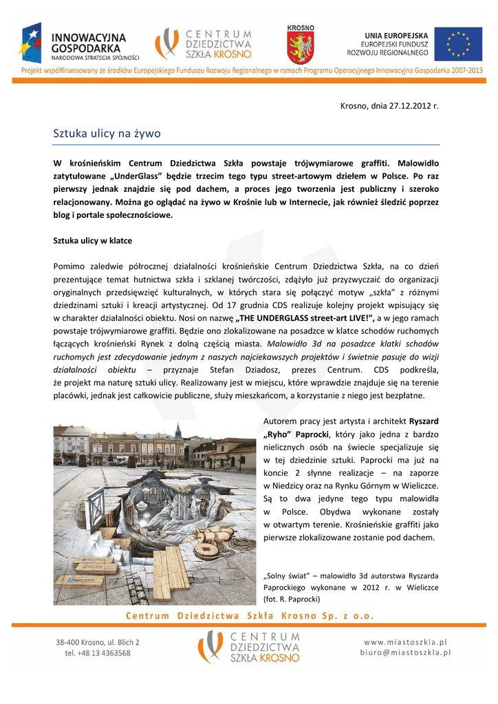 Krosno, dnia 27.12.2012 r. Sztuka ulicy na żywo W krośnieńskim Centrum Dziedzictwa Szkła powstaje trójwymiarowe graffiti. Malowidło zatytułowane „UnderGlass” będzie trzecim tego typu street-artowym dziełem w Polsce. Po raz pierwszy jednak znajdzie się pod dachem, a proces jego tworzenia jest publiczny i szeroko relacjonowany. Można go oglądać na żywo w Krośnie lub w Internecie, jak również śledzić poprzez blog i portale społecznościowe. Sztuka ulicy w klatce Pomimo zaledwie półrocznej działalności krośnieńskie Centrum Dziedzictwa Szkła, na co dzień prezentujące temat hutnictwa szkła i szklanej twórczości, zdążyło już przyzwyczaić do organizacji oryginalnych przedsięwzięć kulturalnych, w których stara się połączyć motyw „szkła” z różnymi dziedzinami sztuki i kreacji artystycznej. Od 17 grudnia CDS realizuje kolejny projekt wpisujący się w charakter działalności obiektu. Nosi on nazwę „THE UNDERGLASS street-art LIVE!”, a w jego ramach powstaje trójwymiarowe graffiti. Będzie ono zlokalizowane na posadzce w klatce schodów ruchomych łączących krośnieński Rynek z dolną częścią miasta. Malowidło 3d na posadzce klatki schodów ruchomych jest zdecydowanie jednym z naszych najciekawszych projektów i świetnie pasuje do wizji działalności obiektu – przyznaje Stefan Dziadosz, prezes Centrum. CDS podkreśla, że projekt ma naturę sztuki ulicy. Realizowany jest w miejscu, które wprawdzie znajduje się na terenie placówki, jednak jest całkowicie publiczne, służy mieszkańcom, a korzystanie z niego jest bezpłatne. Autorem pracy jest artysta i architekt Ryszard „Ryho” Paprocki, który jako jedna z bardzo nielicznych osób na świecie specjalizuje się w tej dziedzinie sztuki. Paprocki ma już na koncie 2 słynne realizacje – na zaporze w Niedzicy oraz na Rynku Górnym w Wieliczce. Są to dwa jedyne tego typu malowidła w Polsce. Obydwa wykonane zostały w otwartym terenie. Krośnieńskie graffiti jako pierwsze zlokalizowane zostanie pod dachem. „Solny świat” – malowidło 3d autorstwa Ryszarda Paprockiego wykonane w 2012 r. w Wieliczce (fot. R. Paprocki) To dla mnie wielkie wyzwanie – przyznaje Paprocki. Nigdy nie sądziłem, że przyjdzie mi wykonywać malowidło 3d w tak nietypowym miejscu, do tego o tak nietypowym temacie – dodaje. 3D graffiti w CDS dotyczyć będzie bowiem tematu hutnictwa szkła. Wiadomo, że będzie miało formę podziemnego piętra budynku (poziom „minus 5”), jednak jego projekt póki co ma pozostać tajemnicą. i w sieci Odkrywać ją można na bieżąco zarówno w Centrum, jak i poprzez transmisję na żywo prowadzoną w Internecie na specjalnej stronie projektu, która znajduje się pod adresem www.3d.miastoszkla.pl. Na witrynie można także znaleźć więcej informacji o przedsięwzięciu oraz sukcesywnie dodawane materiały video. Centrum uruchomiło również blog, na którym regularnie publikowane są opisy kolejnych dni pracy nad graffiti, wzbogacone wypowiedziami artysty, zdjęciami i krótkimi filmami. Znajduje się on pod adresem www.theunderglass.blogspot.com. Projekt relacjonowany jest też poprzez media społecznościowe – Facebook oraz Twitter. Ryszard „Ryho” Paprocki przy pracy nad trzecim w Polsce malowidłem 3D. Dzięki wyjątkowemu jak na sztukę ulicy upublicznieniu działań artystycznych projekt „THE UNDERGLASS” to szansa na promocję street-artu. Proces twórczy można śledzić na bieżąco w Krośnie oraz w Internecie (fot. D. Krzanowski) Udostępnienie transmisji online, blog czy realizacja projektu w klatce schodów ruchomych bez barier lub parawanów ukrywających proces twórczy przed użytkownikami pomieszczenia to dodatkowa wartość przedsięwzięcia. Zarówno przechodnie, jak i osoby w całej Polsce i na świecie, śledzić mogą postępy projektu na żywo. Jest to żmudna praca pozbawiona „fajerwerków” – podkreśla artysta. Warto jednak pokazać na czym polega proces twórczy, z jakich etapów się składa i na jakie problemy napotykam podczas pracy. To także świetny sposób na popularyzację sztuki, w tym konkretnym przypadku sztuki ulicy, która w naszym kraju wciąż walczy o uznanie – podsumowuje. Malowidło ma być gotowe w połowie lutego i stać się jedną z głównych atrakcji kulturalnych i turystycznych miasta, zwłaszcza, że CDS cały czas myśli nad wzbogaceniem projektu „UnderGlass” o dodatkowe elementy. Więcej szczegółów znanych będzie już wkrótce. O Centrum Dziedzictwa Szkła Centrum Dziedzictwa Szkła w Krośnie to wyjątkowy w skali Polski projekt, w ramach którego w Krośnie powstał zespołu obiektów i atrakcji związanych z bogatą tradycją produkcji szklarskiej w mieście i na terenie Podkarpacia. Zrealizowany został w ramach Programu Operacyjnego Innowacyjna Gospodarka na lata 2007-2013, 6 oś priorytetowa: Polska gospodarka na rynku międzynarodowym, Działanie 6.4: Inwestycje w produkty turystyczne o znaczeniu ponadregionalnym. Całkowity koszt realizacji Projektu wyniósł 23 667 705, 75 PLN. W ramach projektu zrealizowano kilka inwestycji połączonych tematem szkła i odwołujących się do „szklanej” tradycji Krosna i regionu. Dzięki kompleksowości i różnorodności poszczególnych działań CDS stanowi unikatowy i oryginalny produkt kulturalno-turystyczny pozwalający poznać historię i tradycję przemysłu szklarskiego oraz odkryć kunszt i mistrzostwo podkarpackich szklarzy. Adres Centrum Dziedzictwa Szkła w Krośnie Sp. z o.o. ul. Blich 2 38-400 Krosno tel.: 13 4363568 – biuro fax: 13 4363571 email: [email protected] www.miastoszkla.pl www.facebook.com/miastoszkla Kontakt dla mediów Dawid Iwaniec Centrum Dziedzictwa Szkła w Krośnie [email protected] tel.: 601 140 080