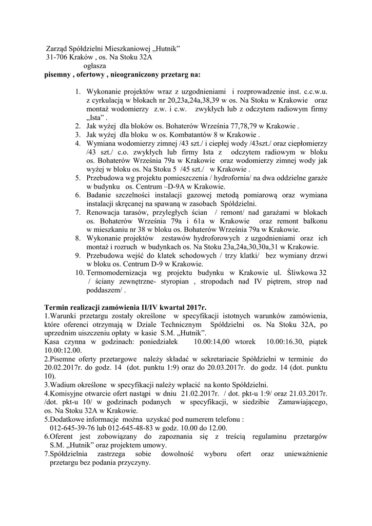 Zarząd Spółdzielni Mieszkaniowej „Hutnik” 31-706 Kraków , os. Na Stoku 32A ogłasza pisemny , ofertowy , nieograniczony przetarg na: 1. Wykonanie projektów wraz z uzgodnieniami i rozprowadzenie inst. c.c.w.u. z cyrkulacją w blokach nr 20,23a,24a,38,39 w os. Na Stoku w Krakowie oraz montaż wodomierzy z.w. i c.w. zwykłych lub z odczytem radiowym firmy „Ista” . 2. Jak wyżej dla bloków os. Bohaterów Września 77,78,79 w Krakowie . 3. Jak wyżej dla bloku w os. Kombatantów 8 w Krakowie . 4. Wymiana wodomierzy zimnej /43 szt./ i ciepłej wody /43szt./ oraz ciepłomierzy /43 szt./ c.o. zwykłych lub firmy Ista z odczytem radiowym w bloku os. Bohaterów Września 79a w Krakowie oraz wodomierzy zimnej wody jak wyżej w bloku os. Na Stoku 5 /45 szt./ w Krakowie . 5. Przebudowa wg projektu pomieszczenia / hydrofornia/ na dwa oddzielne garaże w budynku os. Centrum –D-9A w Krakowie. 6. Badanie szczelności instalacji gazowej metodą pomiarową oraz wymiana instalacji skręcanej na spawaną w zasobach Spółdzielni. 7. Renowacja tarasów, przyległych ścian / remont/ nad garażami w blokach os. Bohaterów Września 79a i 61a w Krakowie oraz remont balkonu w mieszkaniu nr 38 w bloku os. Bohaterów Września 79a w Krakowie. 8. Wykonanie projektów zestawów hydroforowych z uzgodnieniami oraz ich montaż i rozruch w budynkach os. Na Stoku 23a,24a,30,30a,31 w Krakowie. 9. Przebudowa wejść do klatek schodowych / trzy klatki/ bez wymiany drzwi w bloku os. Centrum D-9 w Krakowie. 10. Termomodernizacja wg projektu budynku w Krakowie ul. Śliwkowa 32 / ściany zewnętrzne- styropian , stropodach nad IV piętrem, strop nad poddaszem/ . Termin realizacji zamówienia II/IV kwartał 2017r. 1.Warunki przetargu zostały określone w specyfikacji istotnych warunków zamówienia, które oferenci otrzymają w Dziale Technicznym Spółdzielni os. Na Stoku 32A, po uprzednim uiszczeniu opłaty w kasie S.M. „Hutnik”. Kasa czynna w godzinach: poniedziałek 10.00:14,00 wtorek 10.00:16.30, piątek 10.00:12.00. 2.Pisemne oferty przetargowe należy składać w sekretariacie Spółdzielni w terminie do 20.02.2017r. do godz. 14 (dot. punktu 1:9) oraz do 20.03.2017r. do godz. 14 (dot. punktu 10). 3.Wadium określone w specyfikacji należy wpłacić na konto Spółdzielni. 4.Komisyjne otwarcie ofert nastąpi w dniu 21.02.2017r. / dot. pkt-u 1:9/ oraz 21.03.2017r. /dot. pkt-u 10/ w godzinach podanych w specyfikacji, w siedzibie Zamawiającego, os. Na Stoku 32A w Krakowie. 5.Dodatkowe informacje można uzyskać pod numerem telefonu : 012-645-39-76 lub 012-645-48-83 w godz. 10.00 do 12.00. 6.Oferent jest zobowiązany do zapoznania się z treścią regulaminu przetargów S.M. „Hutnik” oraz projektem umowy. 7.Spółdzielnia zastrzega sobie dowolność wyboru ofert oraz unieważnienie przetargu bez podania przyczyny.