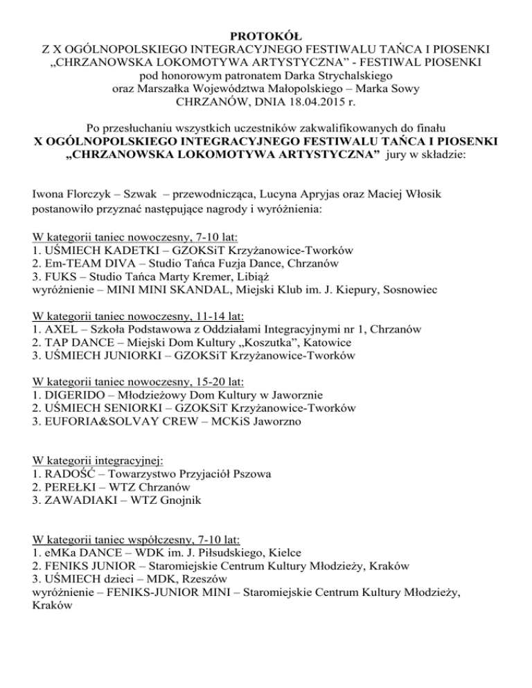 PROTOKÓŁ Z X OGÓLNOPOLSKIEGO INTEGRACYJNEGO FESTIWALU TAŃCA I PIOSENKI „CHRZANOWSKA LOKOMOTYWA ARTYSTYCZNA” - FESTIWAL PIOSENKI pod honorowym patronatem Darka Strychalskiego oraz Marszałka Województwa Małopolskiego – Marka Sowy CHRZANÓW, DNIA 18.04.2015 r. Po przesłuchaniu wszystkich uczestników zakwalifikowanych do finału X OGÓLNOPOLSKIEGO INTEGRACYJNEGO FESTIWALU TAŃCA I PIOSENKI „CHRZANOWSKA LOKOMOTYWA ARTYSTYCZNA” jury w składzie: Iwona Florczyk – Szwak – przewodnicząca, Lucyna Apryjas oraz Maciej Włosik postanowiło przyznać następujące nagrody i wyróżnienia: W kategorii taniec nowoczesny, 7-10 lat: 1. UŚMIECH KADETKI – GZOKSiT Krzyżanowice-Tworków 2. Em-TEAM DIVA – Studio Tańca Fuzja Dance, Chrzanów 3. FUKS – Studio Tańca Marty Kremer, Libiąż wyróżnienie – MINI MINI SKANDAL, Miejski Klub im. J. Kiepury, Sosnowiec W kategorii taniec nowoczesny, 11-14 lat: 1. AXEL – Szkoła Podstawowa z Oddziałami Integracyjnymi nr 1, Chrzanów 2. TAP DANCE – Miejski Dom Kultury „Koszutka”, Katowice 3. UŚMIECH JUNIORKI – GZOKSiT Krzyżanowice-Tworków W kategorii taniec nowoczesny, 15-20 lat: 1. DIGERIDO – Młodzieżowy Dom Kultury w Jaworznie 2. UŚMIECH SENIORKI – GZOKSiT Krzyżanowice-Tworków 3. EUFORIA&SOLVAY CREW – MCKiS Jaworzno W kategorii integracyjnej: 1. RADOŚĆ – Towarzystwo Przyjaciół Pszowa 2. PEREŁKI – WTZ Chrzanów 3. ZAWADIAKI – WTZ Gnojnik W kategorii taniec współczesny, 7-10 lat: 1. eMKa DANCE – WDK im. J. Piłsudskiego, Kielce 2. FENIKS JUNIOR – Staromiejskie Centrum Kultury Młodzieży, Kraków 3. UŚMIECH dzieci – MDK, Rzeszów wyróżnienie – FENIKS-JUNIOR MINI – Staromiejskie Centrum Kultury Młodzieży, Kraków W kategorii taniec współczesny, 11-14 lat: 1. FD 1 – Szkoła Tańca Frygi Drygi, Zabierzów 2. DANCE EFFORT II – MDK Fort 49 Krzesławice, Kraków 3. R-grupa R2 – Szkoła Tańca „R” Sułkowice wyróżnienie – ELITE – Akademia Tańca ELITA, Jaworzno W kategorii taniec współczesny, 15-20 lat: 1. ARTE – MDK Jaworzno 2. SZEPTEM – Akademia Wyobraźni KAJUNE, Czeladź 3. GRW JAZZ SENIOR – Szkoła Tańca „Grawitacja”, Oświęcim wyróżnienie – FENIKS – Staromiejskie Centrum Kultury Młodzieży, Kraków W kategorii street-dance, 7-10 lat: 1.GRW SKILLS - Szkoła Tańca Grawitacja, Oświęcim 2. RePlay – Szkoła Tańca Fuzja Dance, Chrzanów W kategorii street-dance, 11-14 lat: 1. GRW Teens – Szkoła Tańca Grawitacja, Oświęcim 2. COOKIE BEAT – Dom Kultury, Kęty 3. GRW TEAM BRZESZCZE – Szkoła Tańca Grawitacja, Oświęcim wyróżnienie – STARLIGHT – Publiczne Gimnazjum nr 2 , Chrzanów W kategorii street-dance, 15-20 lat: 1.REAKCJA – Centrum Tańca i Ruchu Reakcja, Wieliczka 2. GRW FIGHTERS – Szkoła Tańca Grawitacja, Oświęcim 3. eM-TEAM HIP HOP – Szkoła Tańca Fuzja Dance, Chrzanów W kategorii taniec i piosenka: wyróżnienie – CANZONETTA – Zespół Szkół w Minkowicach Oławskich Grand Prix w wysokości 1.000,- zł otrzymali: AXEL – Szkoła Podstawowa z Oddziałami Integracyjnymi nr 1, Chrzanów FD 1 – Szkoła Tańca Frygi Drygi, Zabierzów ISKIERKI – SOSW Chrzanów GRW SKILLS – Szkoła Tańca Grawitacja, Oświęcim Wszystkim nagrodzonym w X Ogólnopolskim Festiwalu „Chrzanowska Lokomotywa Artystyczna” wręczono dyplomy i statuetki za udział.