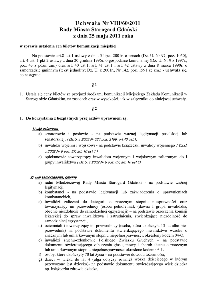 U c h w a ł a Nr VIII/60/2011 Rady Miasta Starogard Gdański z dnia 25 maja 2011 roku w sprawie ustalenia cen biletów komunikacji miejskiej . Na podstawie art.8 ust.1 ustawy z dnia 5 lipca 2001r. o cenach (Dz. U. Nr 97, poz. 1050), art. 4 ust. 1 pkt 2 ustawy z dnia 20 grudnia 1996r. o gospodarce komunalnej (Dz. U. Nr 9 z 1997r., poz. 43 z późn. zm.) oraz art. 40 ust.1, art. 41 ust.1 i art. 42 ustawy z dnia 8 marca 1990r. o samorządzie gminnym (tekst jednolity; Dz. U. z 2001r., Nr 142, poz. 1591 ze zm.) - uchwala się, co następuje: §1 1. Ustala się ceny biletów za przejazd środkami komunikacji Miejskiego Zakładu Komunikacji w Starogardzie Gdańskim, na zasadach oraz w wysokości, jak w załączniku do niniejszej uchwały. §2 1. Do korzystania z bezpłatnych przejazdów uprawnieni są: 1) ulgi ustawowe a) senatorowie i posłowie - na podstawie waŜnej legitymacji poselskiej lub senatorskiej, ( Dz.U. z 2003 Nr 221 poz. 2199, art.43 ust.1) b) inwalidzi wojenni i wojskowi - na podstawie ksiąŜeczki inwalidy wojennego ( Dz.U. z 2002 Nr 9 poz. 87, art. 16 ust.1 ) c) opiekunowie towarzyszący inwalidom wojennym i wojskowym zaliczanym do I grupy inwalidztwa ( Dz.U. z 2002 Nr 9 poz. 87, art. 16 ust.1) gminne 2) ulgi samorządowe, gm inne a) radni MłodzieŜowej Rady Miasta Starogard Gdański - na podstawie waŜnej legitymacji, b) kombatanci - na podstawie legitymacji lub zaświadczenia o uprawnieniach kombatanckich, c) inwalidzi zaliczani do kategorii o znacznym stopniu niesprawności oraz towarzyszący im przewodnicy (osoba pełnoletnia), (dawna I grupa inwalidzka, obecnie niezdolność do samodzielnej egzystencji) – na podstawie orzeczenia komisji lekarskiej do spraw inwalidztwa i zatrudnienia, stwierdzające niezdolność do samodzielnej egzystencji, d) ociemniali i towarzyszący im przewodnicy (osoba, która ukończyła 13 lat albo pies przewodnik) na podstawie dokumentu stwierdzającego inwalidztwo wzroku o znacznym lub umiarkowanym stopniu niepełnosprawności, określony kodem 04-O, e) inwalidzi słuchu-członkowie Polskiego Związku Głuchych – na podstawie dokumentu stwierdzającego zaburzenia głosu, mowy i chorób słuchu o znacznym lub umiarkowanym stopniu niepełnosprawności określone kodem 03-L f) osoby, które ukończyły 70 lat Ŝycia – na podstawie dowodu toŜsamości, g) dzieci w wieku do lat 4 (ulga dotyczy równieŜ wózka dziecięcego w którym przewoŜone jest dziecko)- na podstawie dokumentu stwierdzającego wiek dziecka np. ksiąŜeczka zdrowia dziecka, h) uczniowie szkół specjalnych oraz towarzyszący im opiekunowie – na podstawie waŜnej legitymacji szkolnej, i) dzieci i młodzieŜ dotknięta inwalidztwem lub niepełnosprawnością - do ukończenia 16 roku Ŝycia, na podstawie zaświadczenia lekarskiego, uprawniającego do zasiłku pielęgnacyjnego w wieku powyŜej 16 lat do czasu ukończenia nauki, jeŜeli niepełnosprawność jest stopnia znacznego, umiarkowanego lub lekkiego - na podstawie legitymacji wydanej przez Zespół d/s. Orzekania o Niepełnosprawności, j) dzieci oraz młodzieŜ w wieku do lat 18, nie objęte obowiązkiem szkolnym wskutek choroby lub niepełnosprawności oraz towarzyszący im opiekunowie – na podstawie zaświadczenia stwierdzającego niepełnosprawność wydanego przez Zespół d/s. Orzekania o Niepełnosprawności wraz z dokumentem stwierdzającym wiek, k) zasłuŜony honorowy dawca krwi I-go stopnia zarejestrowany w Starogardzkim Punkcie Krwiodawstwa – na postawie legitymacji wydanej przez Pomorski Zarząd PCK, l) umundurowani funkcjonariusze z obszaru objętego odpowiedzialnością Komendy Powiatowej Policji w Starogardzie Gdańskim i straŜnicy StraŜy Miejskiej w Starogardzie Gdańskim, m) pracownicy Miejskiego Zakładu Komunikacji w Starogardzie Gdańskim oraz członkowie ich rodzin (współmałŜonek, dzieci do czasu ukończenia nauki nie dłuŜej jak do 24 roku Ŝycia) – na podstawie biletu wolnej jazdy wydanego przez MZK Starogard Gdański, n) członkowie Związku Byłych Więźniów Młodocianych i śołnierzy-Górników Okresu Stalinowskiego – na postawie waŜnej legitymacji członkowskiej, o) wdowy po byłych Ŝołnierzach-górnikach, członkach Związku Represjonowanych śołnierzy-Górników – na postawie waŜnej legitymacji członkowskiej, p) członkowie Związku Sybiraków naleŜących do Koła Starogard Gdański - na postawie waŜnej legitymacji członkowskiej, r) członkowie Związku Represjonowanych śołnierzy Batalionów Budowlanych – na postawie waŜnej legitymacji członkowskiej, s) członkowie Stowarzyszenia Polaków Poszkodowanych przez III Rzeszę – na postawie waŜnej legitymacji członkowskiej 2. Do korzystania z przejazdów ulgowych uprawnieni są: 1) ulgi ustawowe a) studenci szkół wyŜszych i wyŜszych zawodowych - na podstawie waŜnej legitymacji studenckiej, (Dz.U. z 2005r., Nr 164, poz.1365 ze zm.) 2) ulgi samorządowe a) dzieci w wieku od 4 do 7 lat – na podstawie oświadczenia opiekuna o wieku dziecka, b) uczniowie szkół podstawowych, zawodowych, średnich i szkół policealnych do ukończenia 24 roku Ŝycia - na podstawie waŜnej legitymacji szkolnej, c) emeryci i renciści nie pozostający w stosunku pracy powodującym zawieszenie świadczeń emerytalnych lub rentowych oraz ich współmałŜonkowie, na których otrzymują dodatki rodzinne - na podstawie waŜnej legitymacji, (lub dokumentu uprawniającego do otrzymywania świadczenia), wydanego przez organ uprawniony do przyznawania emerytur lub rent i dowodu osobistego, d) młodzieŜ dotknięta inwalidztwem oraz młodzieŜ niepełnosprawna w wieku od 18 do 30 lat – na podstawie legitymacji osoby niepełnosprawnej wydanej przez Zespół d/s. Orzekania o Niepełnosprawności wraz z dokumentem toŜsamości, e) osoby o umiarkowanym i lekkim stopniu niepełnosprawności - na podstawie legitymacji wydanej przez Zespół d/s. Orzekania o Niepełnosprawności. 3. Postanowienia ust. 1 i 2 nie ograniczają uprawnień w