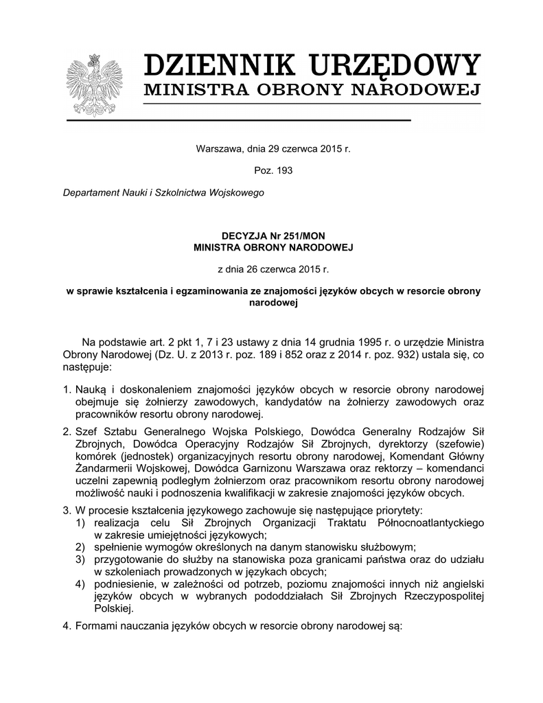 Warszawa, dnia 29 czerwca 2015 r. Poz. 193 Departament Nauki i Szkolnictwa Wojskowego DECYZJA Nr 251/MON MINISTRA OBRONY NARODOWEJ z dnia 26 czerwca 2015 r. w sprawie kształcenia i egzaminowania ze znajomości języków obcych w resorcie obrony narodowej Na podstawie art. 2 pkt 1, 7 i 23 ustawy z dnia 14 grudnia 1995 r. o urzędzie Ministra Obrony Narodowej (Dz. U. z 2013 r. poz. 189 i 852 oraz z 2014 r. poz. 932) ustala się, co następuje: 1. Nauką i doskonaleniem znajomości języków obcych w resorcie obrony narodowej obejmuje się żołnierzy zawodowych, kandydatów na żołnierzy zawodowych oraz pracowników resortu obrony narodowej. 2. Szef Sztabu Generalnego Wojska Polskiego, Dowódca Generalny Rodzajów Sił Zbrojnych, Dowódca Operacyjny Rodzajów Sił Zbrojnych, dyrektorzy (szefowie) komórek (jednostek) organizacyjnych resortu obrony narodowej, Komendant Główny Żandarmerii Wojskowej, Dowódca Garnizonu Warszawa oraz rektorzy – komendanci uczelni zapewnią podległym żołnierzom oraz pracownikom resortu obrony narodowej możliwość nauki i podnoszenia kwalifikacji w zakresie znajomości języków obcych. 3. W procesie kształcenia językowego zachowuje się następujące priorytety: 1) realizacja celu Sił Zbrojnych Organizacji Traktatu Północnoatlantyckiego w zakresie umiejętności językowych; 2) spełnienie wymogów określonych na danym stanowisku służbowym; 3) przygotowanie do służby na stanowiska poza granicami państwa oraz do udziału w szkoleniach prowadzonych w językach obcych; 4) podniesienie, w zależności od potrzeb, poziomu znajomości innych niż angielski języków obcych w wybranych pododdziałach Sił Zbrojnych Rzeczypospolitej Polskiej. 4. Formami nauczania języków obcych w resorcie obrony narodowej są: 1) programowe nauczanie kandydatów na żołnierzy zawodowych w szkołach wojskowych; 2) kształcenie żołnierzy zawodowych i pracowników resortu obrony narodowej na semestralnych kursach językowych; 3) doskonalenie znajomości języków obcych żołnierzy zawodowych i pracowników wojska na kursach doskonalących i wyrównawczych; 4) doskonalenie żołnierzy zawodowych na kursach językowych w placówkach edukacyjnych za granicą; 5) programowe doskonalenie znajomości terminologii wojskowej w ramach systemu doskonalenia zawodowego żołnierzy zawodowych na specjalistycznych kursach (studiach) trwających dłużej niż 3 miesiące; 6) doskonalenie znajomości języków obcych żołnierzy zawodowych w ramach szkolenia w jednostkach wojskowych; 7) doskonalenie znajomości języków obcych w formie e-learningu; 8) nauczanie na doraźnie zorganizowanych kursach, niewymienionych w ppkt 2-6. 5. Kursy języka angielskiego organizuje się w: 1) Wojskowym Studium Nauczania Języków Obcych, zwanym dalej „WSNJO”; 2) uczelniach wojskowych; 3) ośrodkach doskonalenia językowego resortu obrony narodowej; 4) centrach szkolenia. 6. W przypadku braku możliwości realizacji kształcenia w ośrodkach językowych, o których mowa w pkt 5, za zgodą odpowiednio Dyrektora Departamentu Nauki i Szkolnictwa Wojskowego, Dowódcy Generalnego Rodzajów Sił Zbrojnych, Dowódcy Operacyjnego Rodzajów Sił Zbrojnych, Komendanta Głównego Żandarmerii Wojskowej, Dowódcy Garnizonu Warszawa dopuszcza się organizowanie w jednostkach (instytucjach) wojskowych oraz cywilnych szkołach (ośrodkach) językowych kursów, o których mowa w pkt 13 ppkt 1 i 2 oraz kursów doskonalących i wyrównawczych na poziomach 1-3. 7. WSNJO jest centralną placówką w systemie kształcenia i egzaminowania językowego w Siłach Zbrojnych Rzeczypospolitej Polskiej, która realizuje priorytetowe zadania resortu obrony narodowej w tej dziedzinie. Komendant WSNJO jest jednocześnie Przewodniczącym Centralnej Komisji Egzaminacyjnej Języków Obcych Ministerstwa Obrony Narodowej, zwanej dalej „CKEJO MON”. 8. WSNJO realizuje kursy języków obcych innych niż języka angielskiego. Za zgodą Dyrektora Departamentu Nauki i Szkolnictwa Wojskowego, dopuszcza się możliwość realizowania nauczania innych języków obcych w ośrodkach, o których mowa w pkt 5 ppkt 2-4 oraz jednostkach (instytucjach) wojskowych i cywilnych szkołach (ośrodkach) językowych. 9. Nauczanie i egzaminowanie z języka polskiego obcokrajowców na poziomach 1-3 jest realizowane w uczelniach wojskowych oraz WSNJO. 10. Zgodnie z Porozumieniem o standaryzacji STANAG 6001, zwanym dalej „Porozumieniem STANAG 6001”, przyjmuje się następujące określenia poziomów znajomości języków obcych: 1) poziom 0 – brak znajomości języka; 2) poziom 0+ - znajomość niepełna podstawowa; 3) poziom 1 - znajomość podstawowa; 4) poziom 1+ - znajomość podstawowa plus; 5) poziom 2 - znajomość średniozaawansowana; 6) poziom 2+ - znajomość średniozaawansowana plus; 7) poziom 3 - znajomość zaawansowana; 8) poziom 3+ - znajomość zaawansowana plus; 9) poziom 4 - znajomość biegła; 10) poziom 4+ - znajomość biegła plus; 11) poziom 5 - znajomość doskonała. 11. Opis wymagań językowych na poszczególnych poziomach zaawansowania określa załącznik Nr 1 do decyzji. 12. Znajomość języka obcego: 1) określa się Standardowym Profilem Językowym, zwanym dalej „SPJ”, który jest zestawieniem poziomów, o których mowa w pkt 10, w obrębie poszczególnych sprawności językowych w kolejności: słuchanie (S), mówienie (M), czytanie (C), pisanie (P). Poziom każdej sprawności językowej wpisuje się osobno na świadectwie znajomości języka obcego. Wzór świadectwa określa załącznik Nr 2 do decyzji; 2) ustala się na podstawie części egzaminu prowadzonego na poziomie określonym w opisie wymagań językowych, o których mowa w pkt 11. Części egzaminu oceniane są odrębnie dla każdej ze sprawności językowych. W postępowaniu egzaminacyjnym uzyskanie co najmniej 70 procent możliwych do uzyskania punktów jest równoznaczne ze zdaniem egzaminu na danym poziomie. Osiągnięcie wyniku 60-69